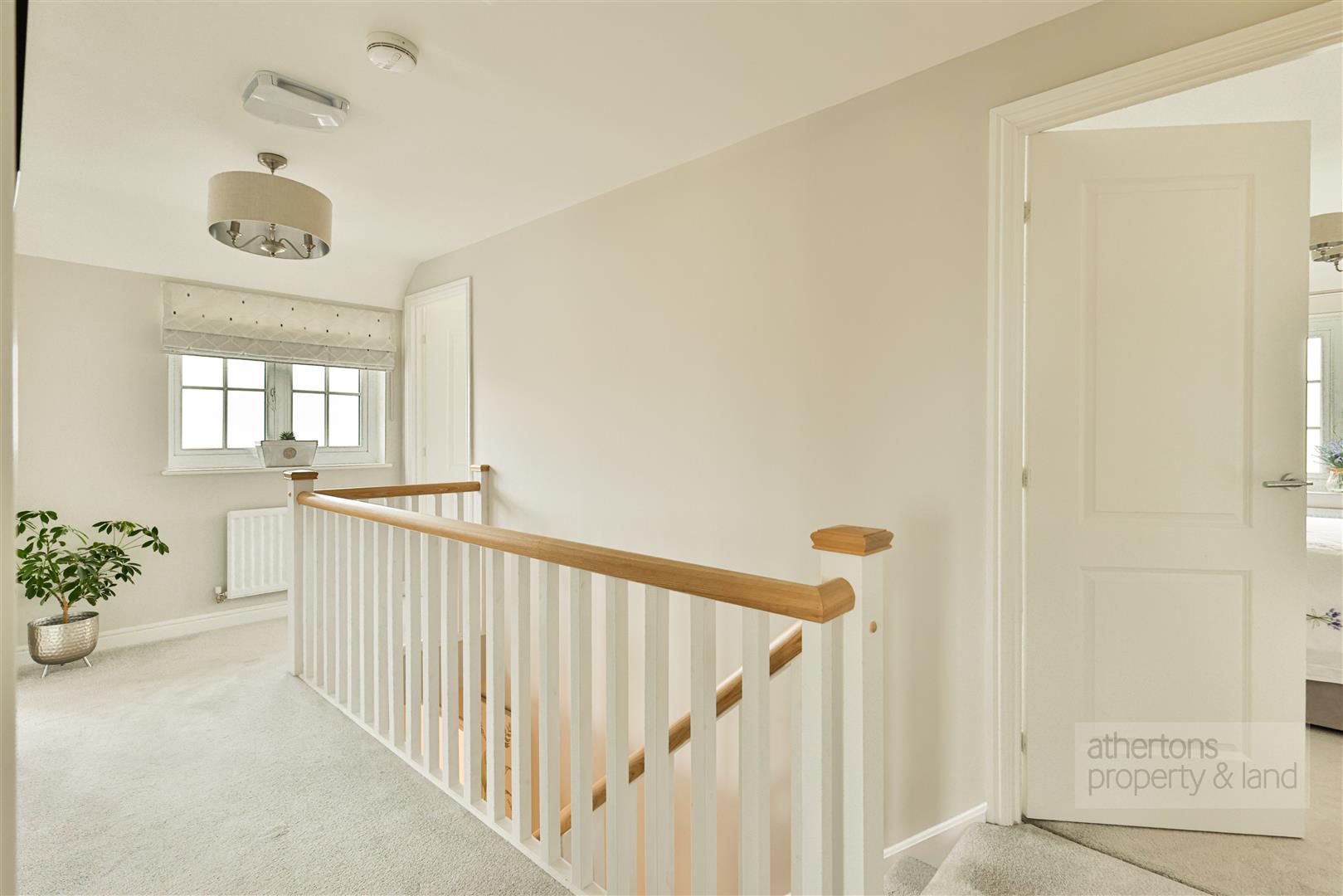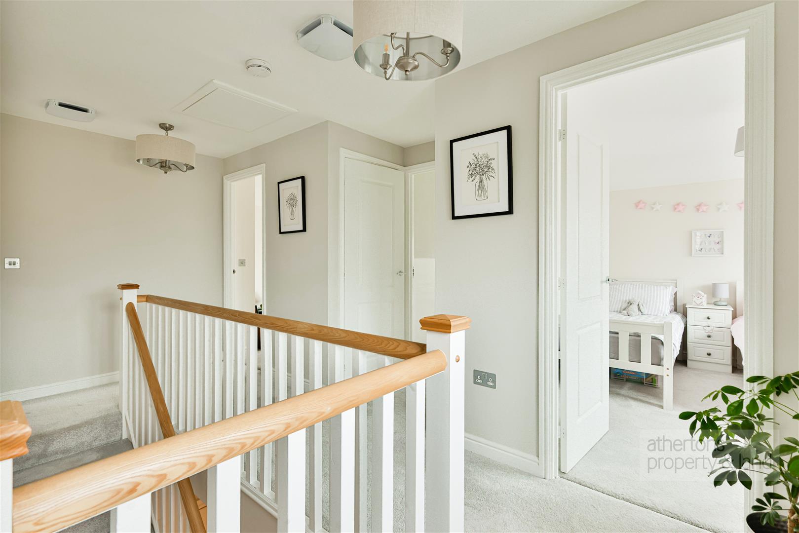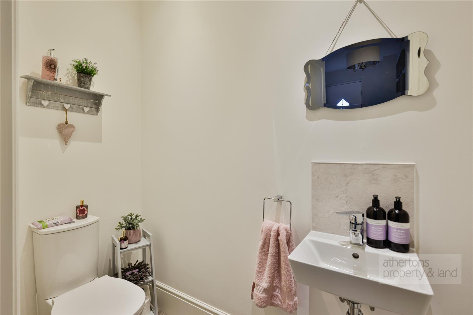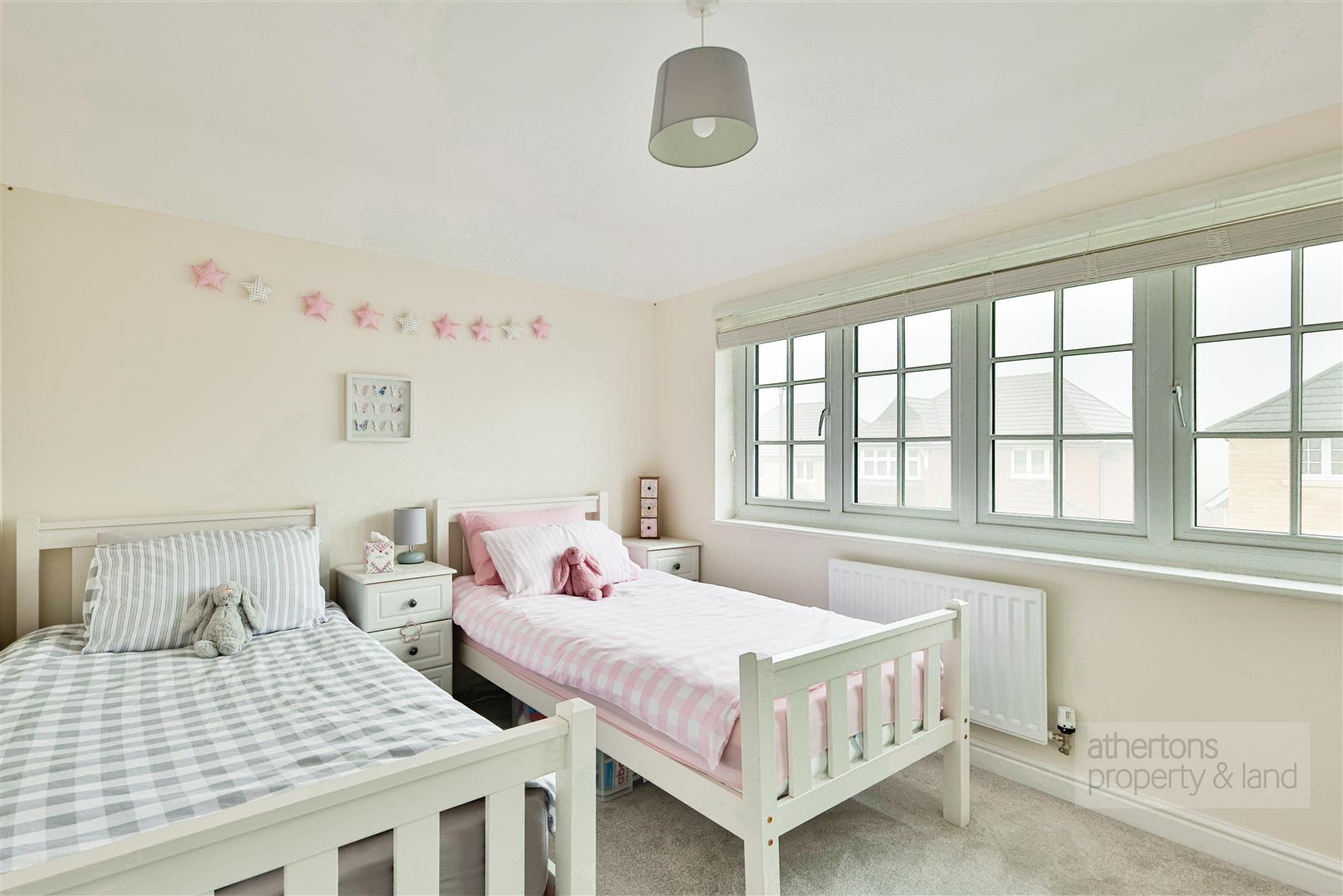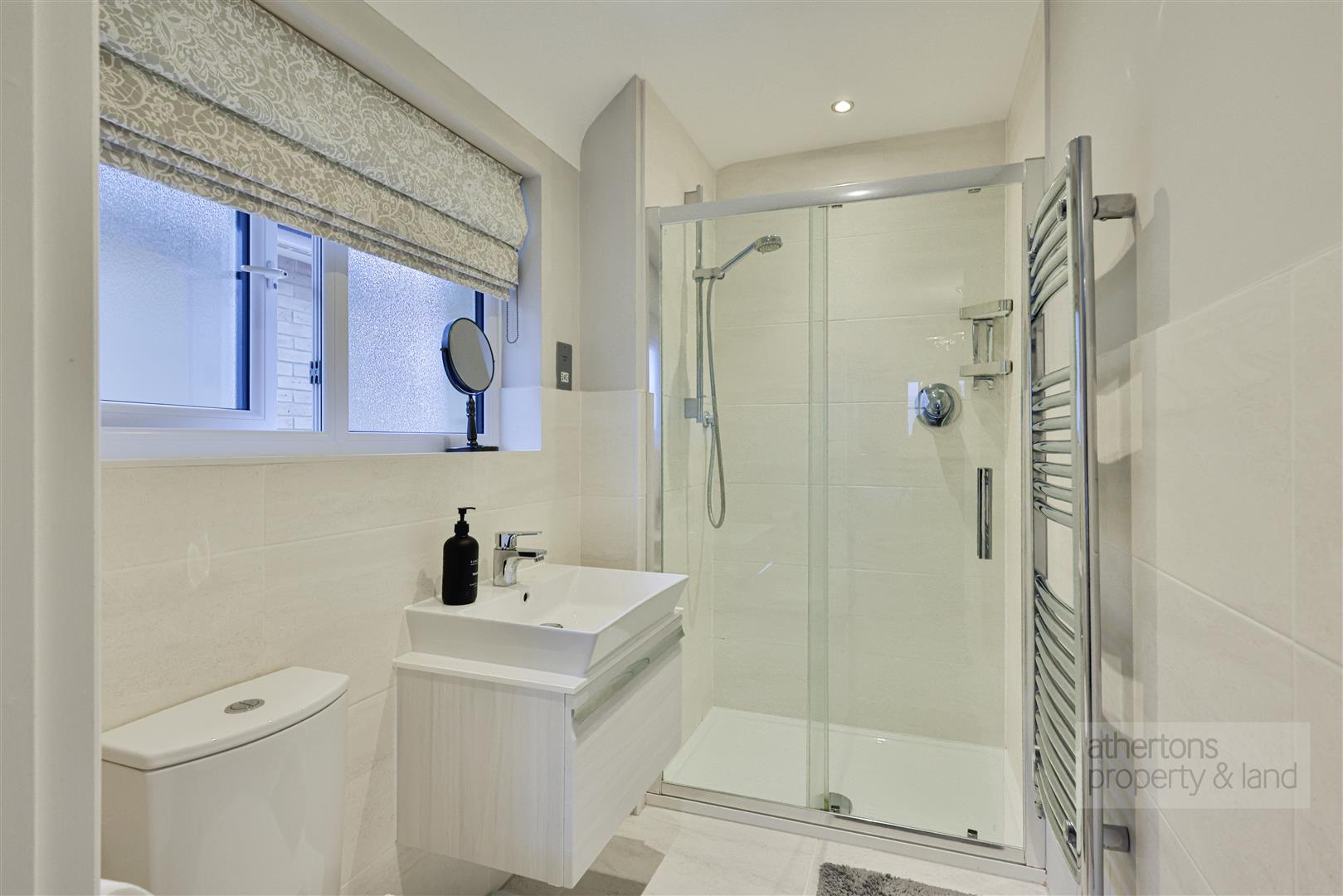 To the first floor, the landing provides access to an airing cupboard and loft hatch, leading to four well-proportioned double bedrooms, all benefiting from hipped ceilings that enhance the sense of space. The contemporary family bathroom, serving bedrooms two, three, and four, is finished with tiled flooring and half-height tiled walls and comprises a panelled bath with overhead mains shower and screen, dual-flush WC, and vanity wash basin. Two of the bedrooms feature fitted wardrobes, while the principal bedroom enjoys a stylish three-piece en-suite shower room, tiled to match the family bathroom and fitted with a shower cubicle and screen, dual-flush WC, and vanity wash basin.