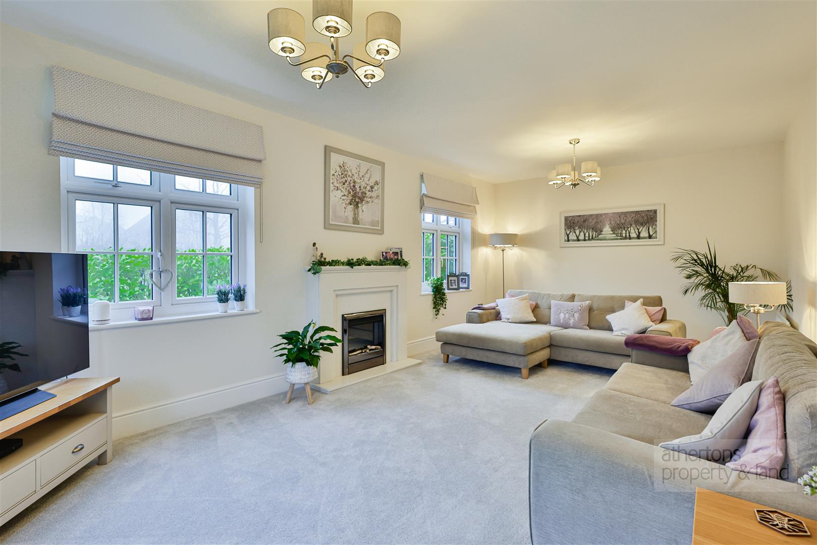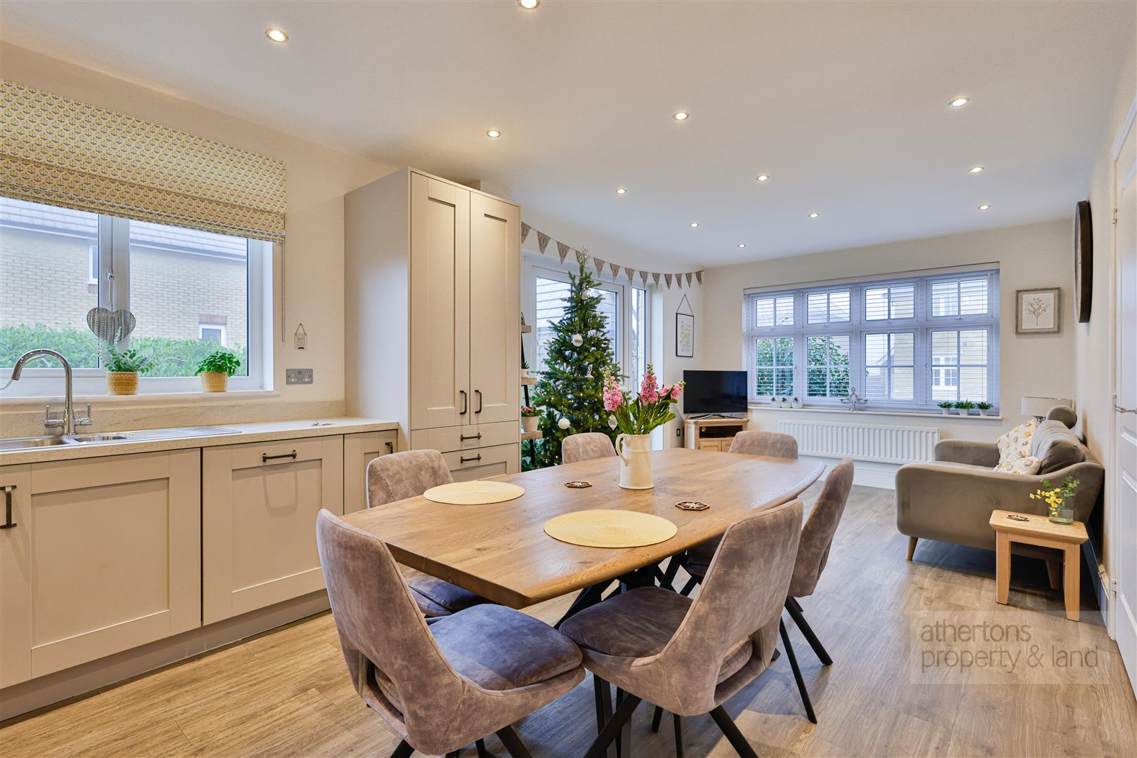 Stepping inside, the welcoming entrance hall immediately impresses with its sense of space and light, enhanced by the high ceiling. Stairs rise to the first floor with useful understairs storage, while a neatly appointed two-piece ground-floor cloakroom sits conveniently off the hall. The elegant lounge is a standout feature, enjoying a triple aspect and stretching the full length of the house, creating a bright and airy yet cosy living space. An inset electric fire with a white granite surround forms an attractive focal point, while large windows allow natural light to flood in from multiple directions.