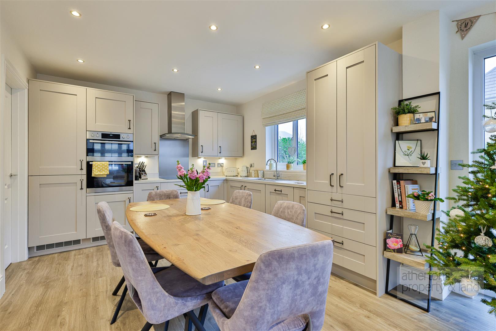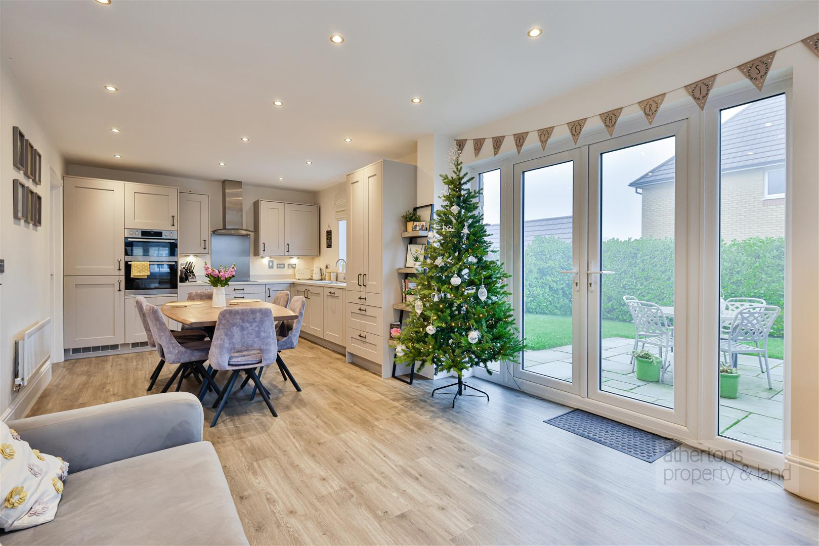 To the rear lies the superb open-plan kitchen, dining, and snug area - a versatile and sociable space designed for modern family living and entertaining. The kitchen is fitted with a comprehensive range of base and eye-level units topped with complementary work surfaces and incorporates a suite of integrated AEG appliances, including an induction hob with extractor over, double oven, dishwasher, and fridge/freezer. A pantry cupboard and stainless steel dual-bowl sink add further practicality, while French doors open directly onto the garden, creating a seamless indoor-outdoor connection and ample space for both dining and relaxed seating.