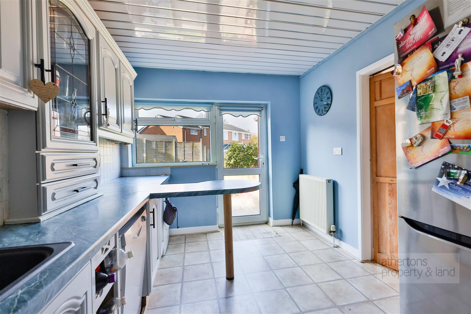 The kitchen is fitted with a range of base and eye-level units complemented by laminate worktops and a breakfast bar for informal dining. Appliances include a four ring gas hob and electric oven, while there is space for a fridge/freezer and plumbing for a dishwasher and washing machine. An external door provides convenient access to the outside.