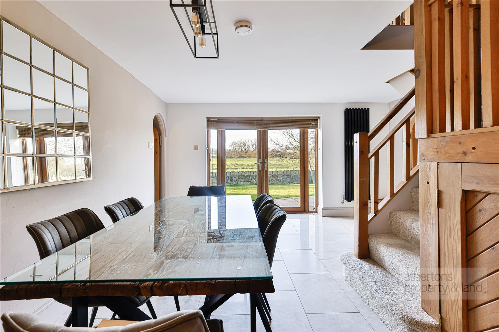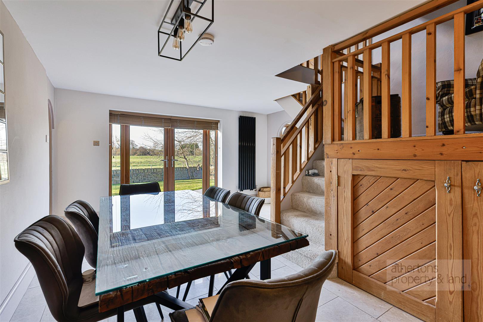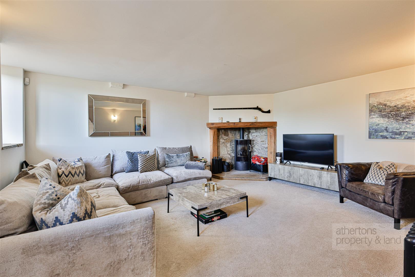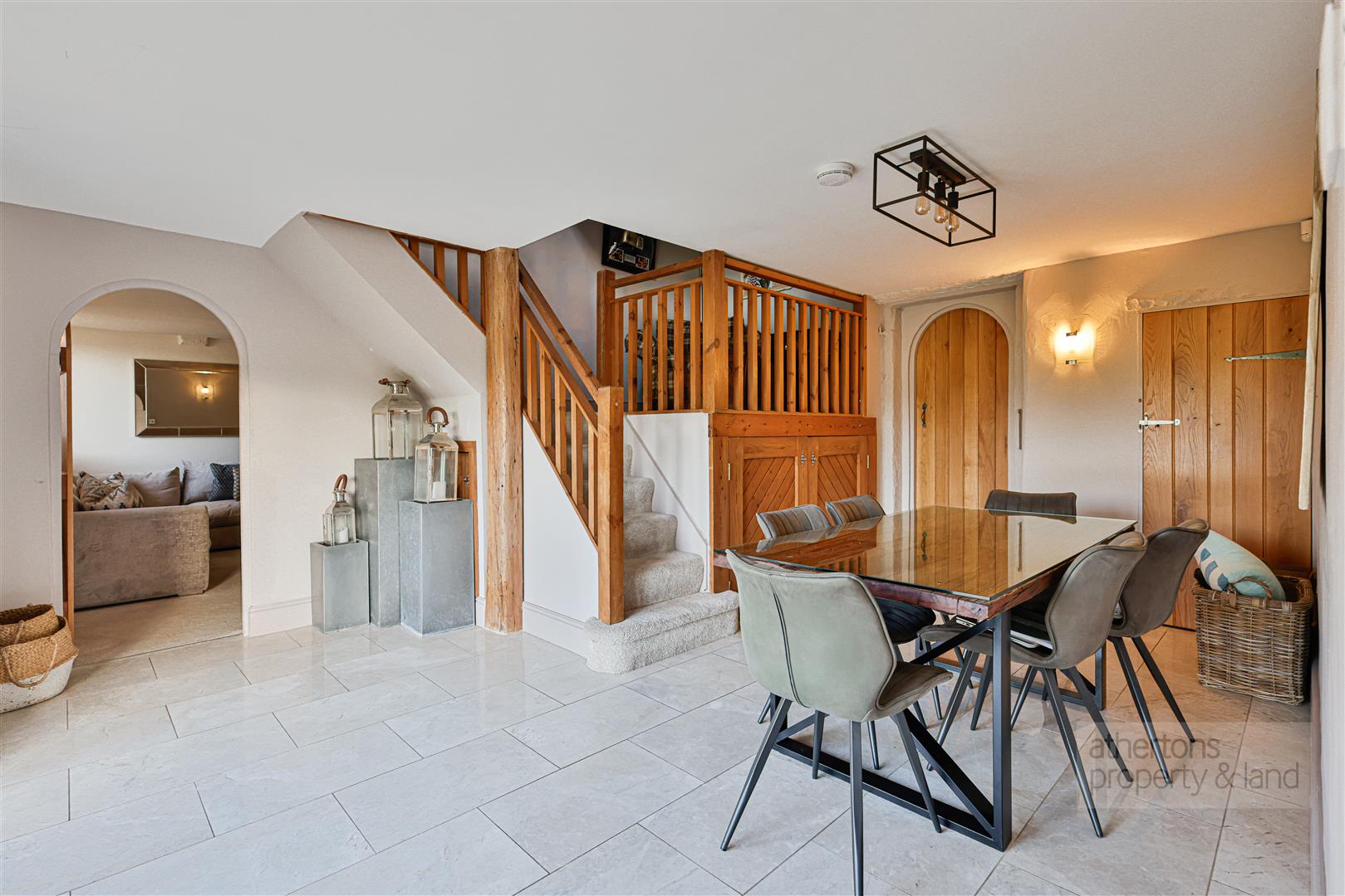 The ground floor is arranged around an impressive central dining hall, creating a natural hub of the home. A striking feature staircase with under stair storage and half-landing/mezzanine sitting area rises to the first floor, while glazed patio doors frame beautiful open countryside views and provide access to the garden. To one side, the spacious lounge enjoys dual-aspect windows and is centred around a contemporary wood-burning stove set on a stone hearth with oak beam surround, creating an inviting space for relaxation.