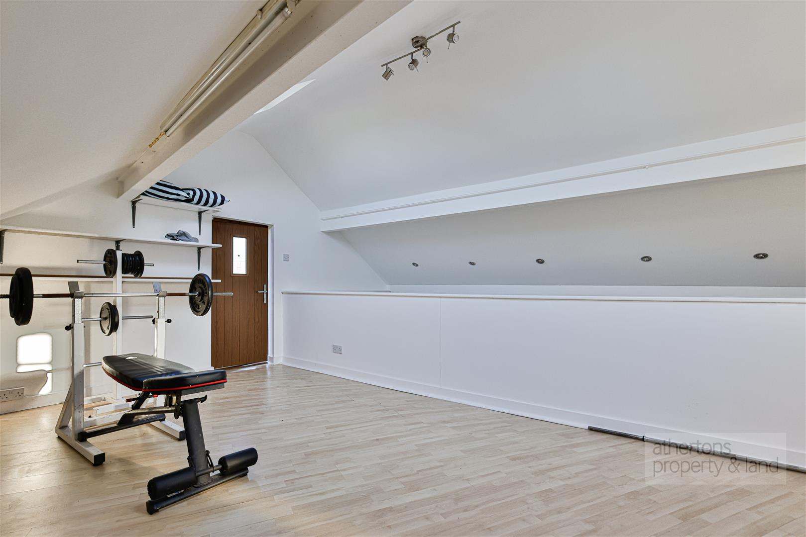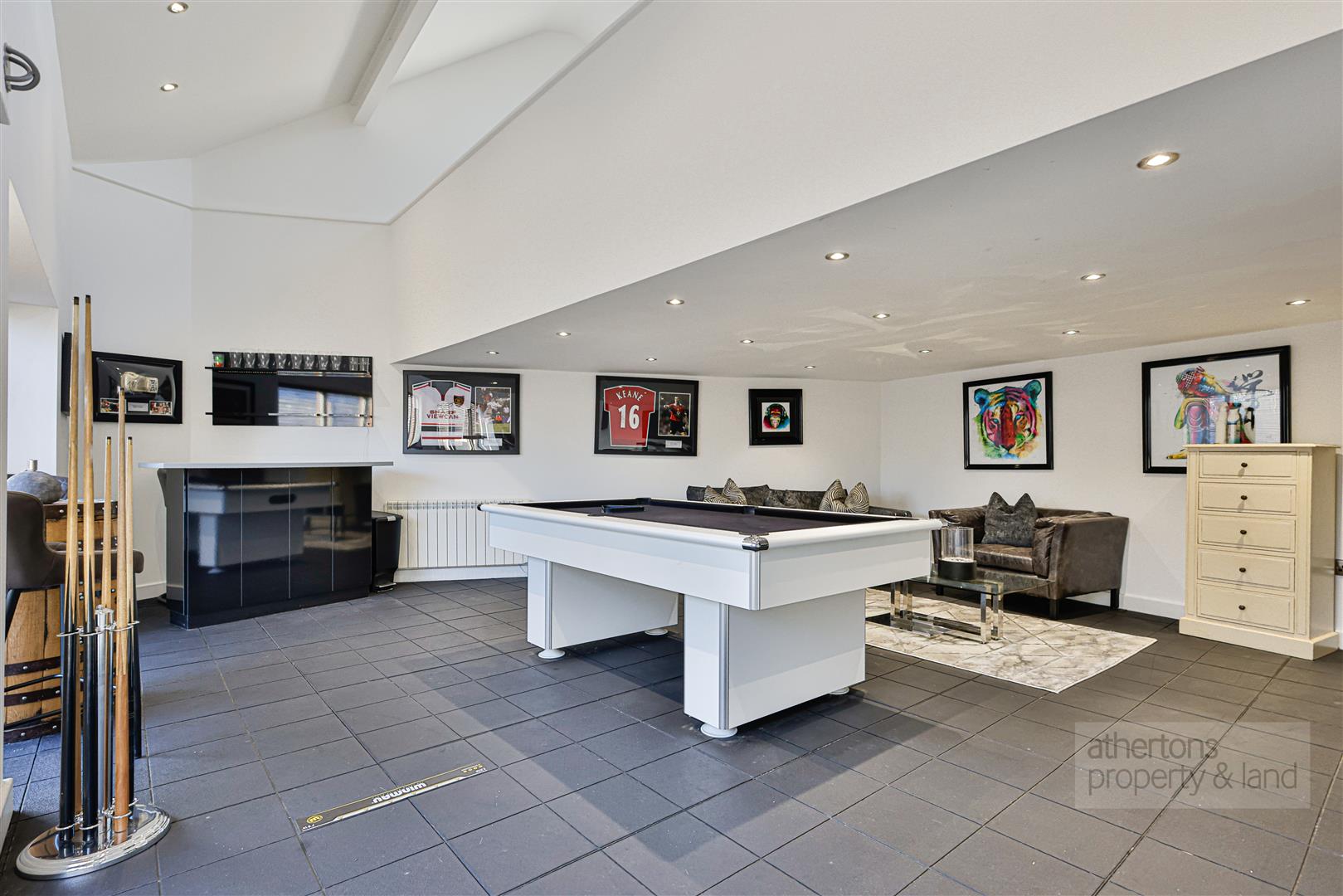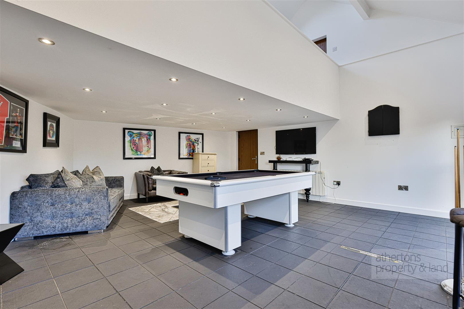 A notable additional feature of the property is the detached double garage, which has been converted into an excellent games room with glazed French doors, spotlighting and electric heating. An external staircase leads to a first-floor mezzanine, currently used as a gym, with Velux windows and full power and lighting — offering flexible space for modern working or hobbies.