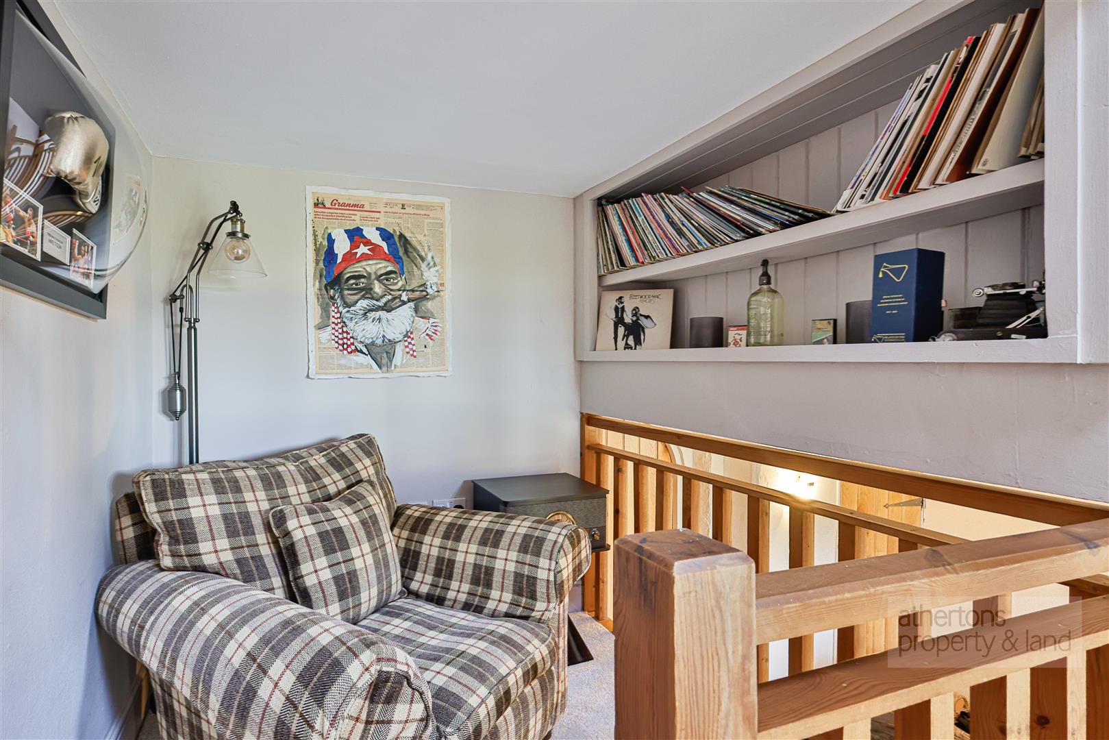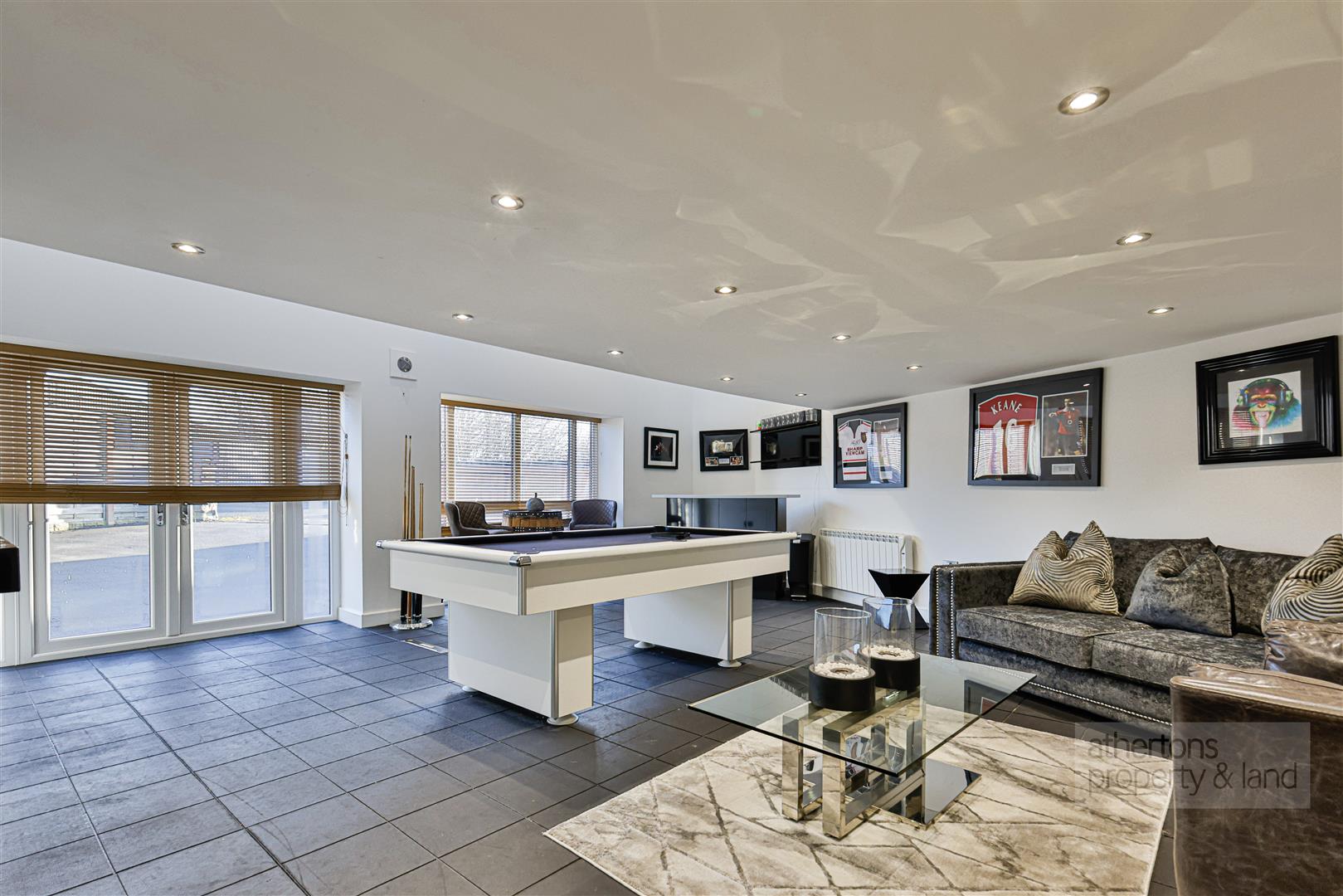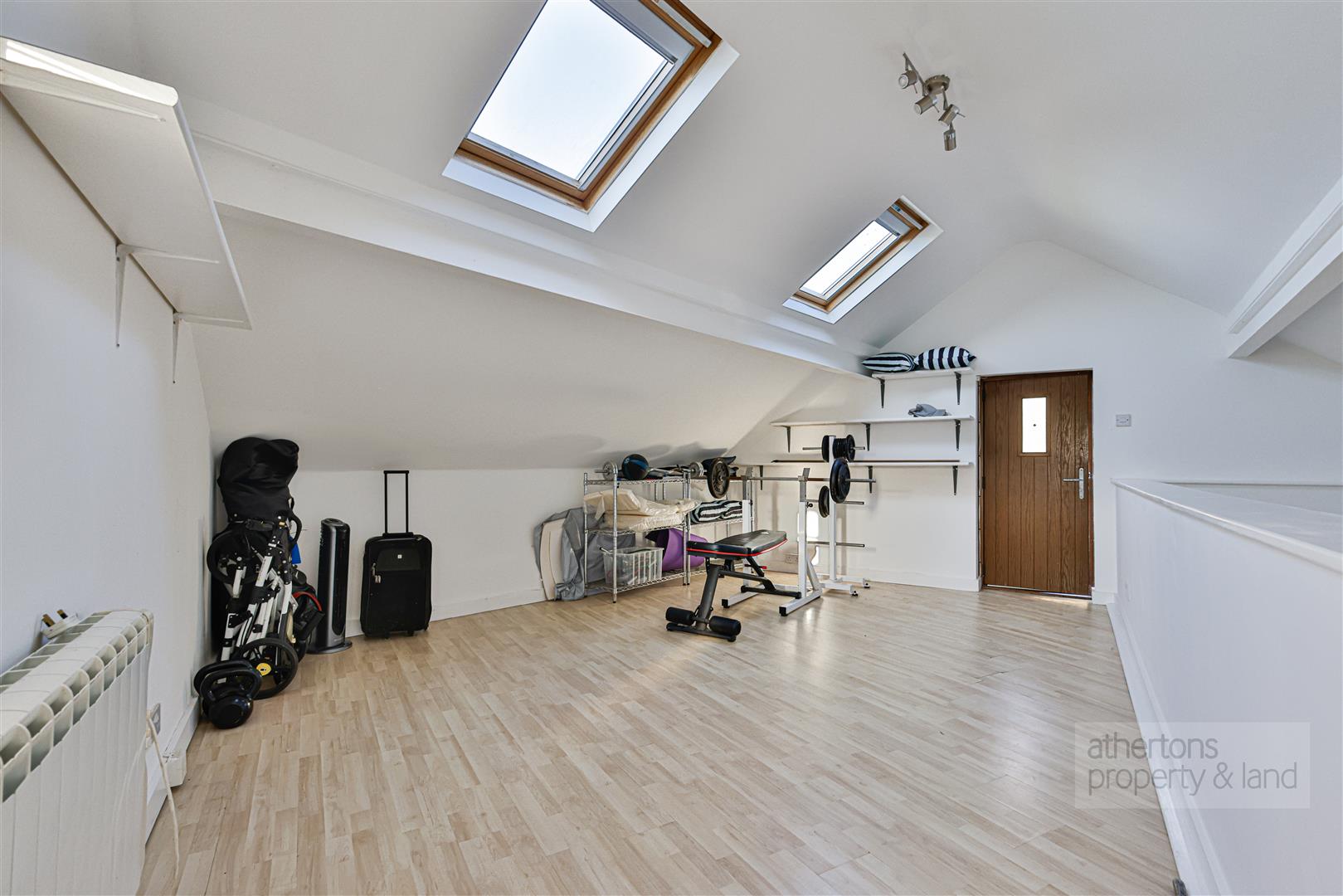 A notable additional feature of the property is the detached double garage, which has been converted into an excellent games room with glazed French doors, spotlighting and electric heating. An external staircase leads to a first-floor mezzanine, currently used as a gym, with Velux windows and full power and lighting — offering flexible space for modern working or hobbies.