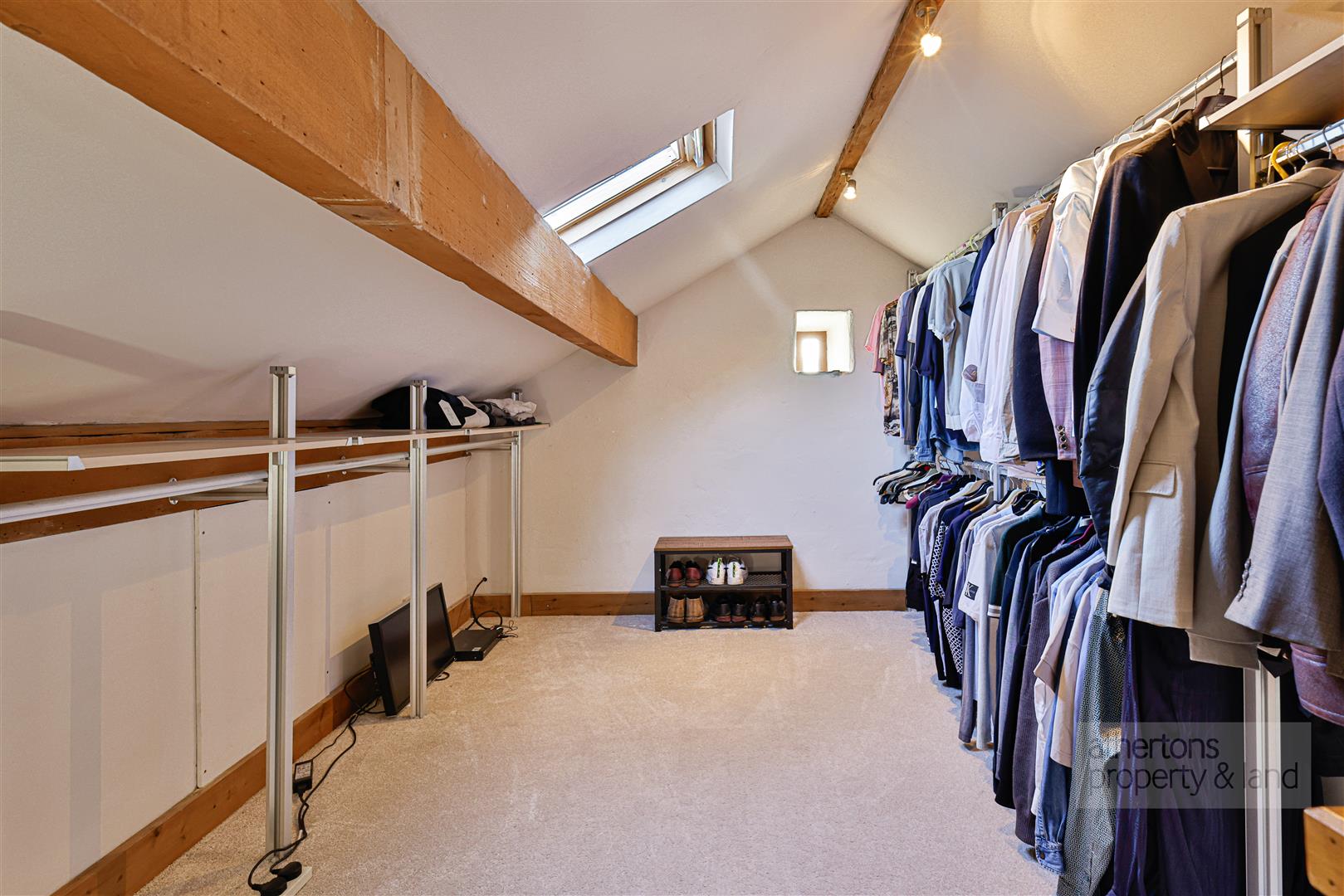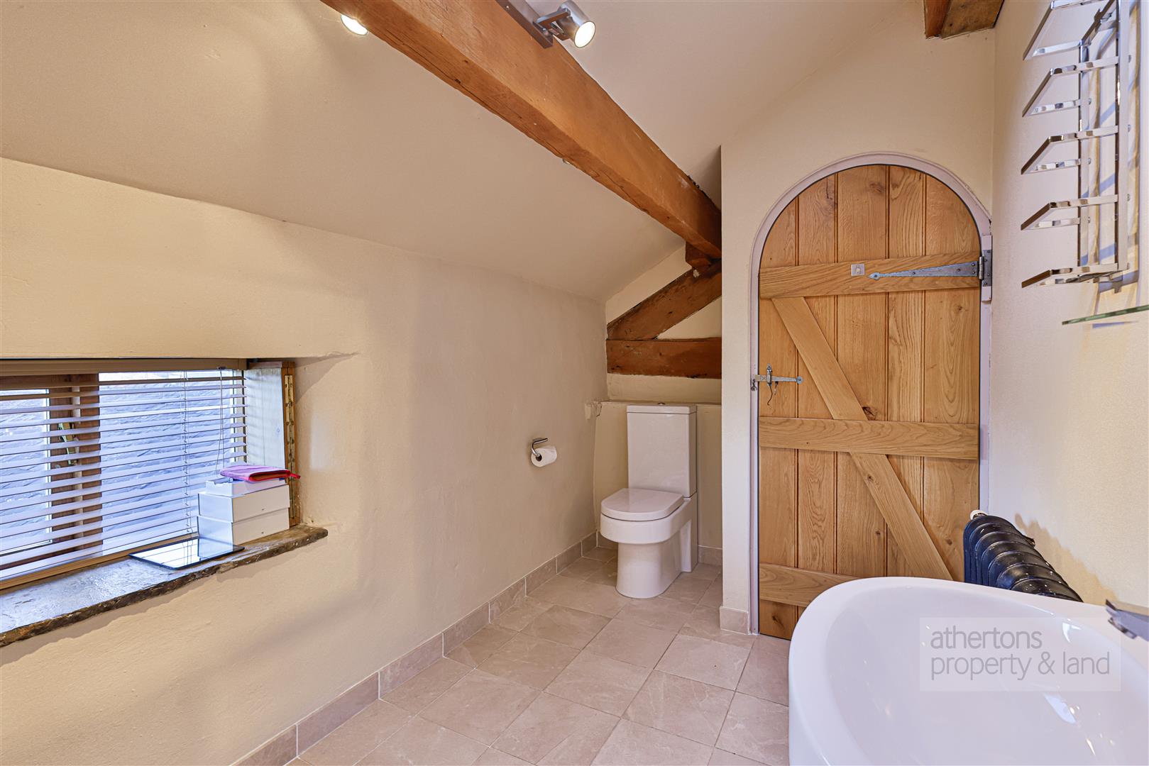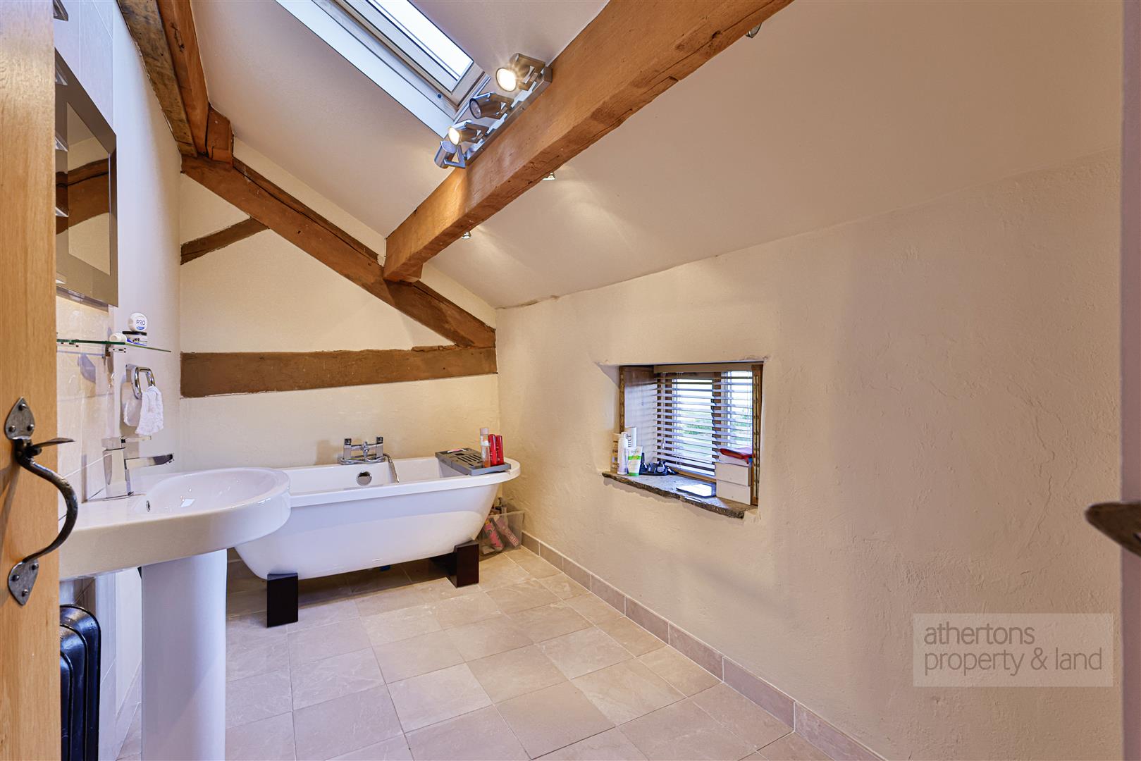 To the first floor, a light-filled and characterful landing with exposed beams, pitched ceiling and Velux windows sets a dramatic tone. The principal bedroom is a generous and elegant suite, featuring exposed beams, multiple windows and a modern en-suite shower room with walk-in wet area and mains shower. A private staircase from the bedroom leads to a dedicated dressing room, fitted with hanging and shelving and illuminated by a Velux window. Two further bedrooms also feature exposed beams and enjoy a combination of Velux and traditional windows, while the family bathroom is fitted with a contemporary white suite including a freestanding roll-top bath, tiled flooring, wash basin and Wc.