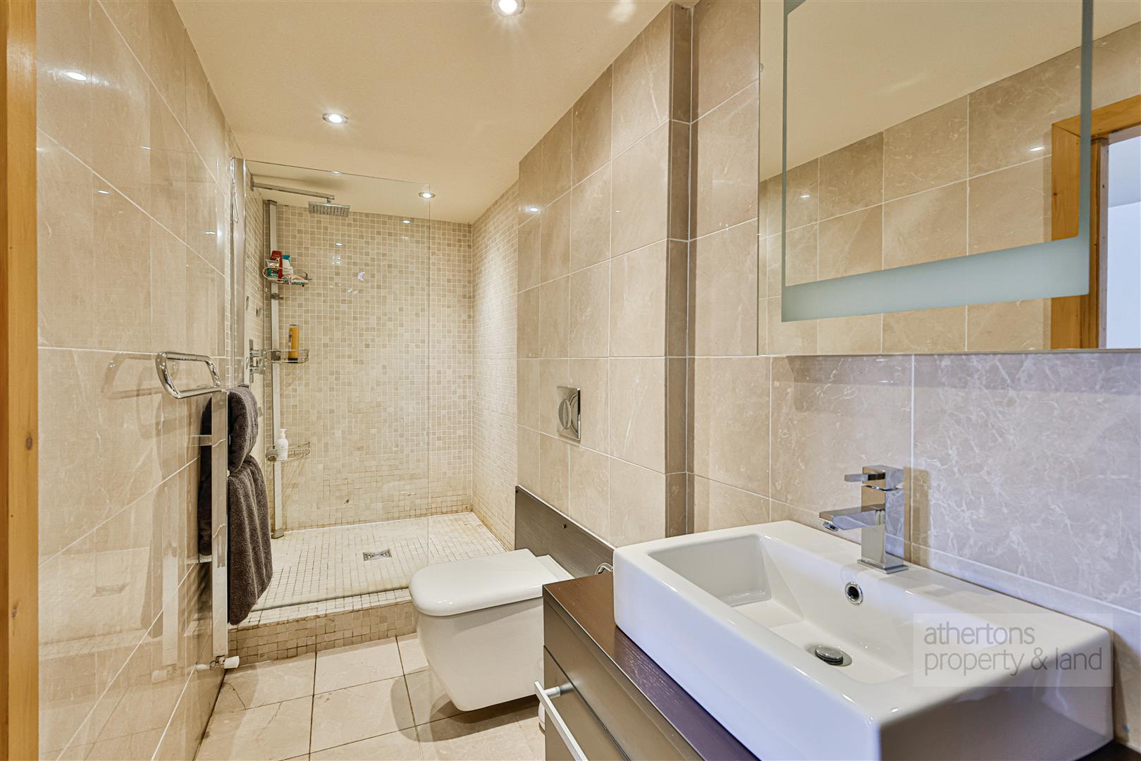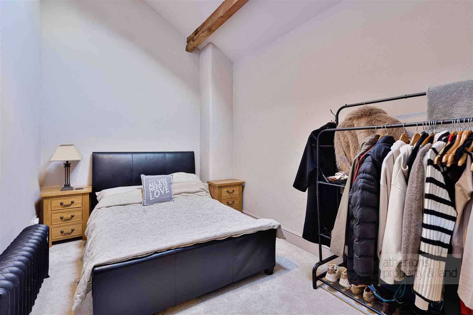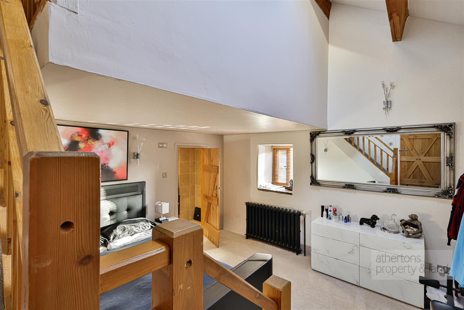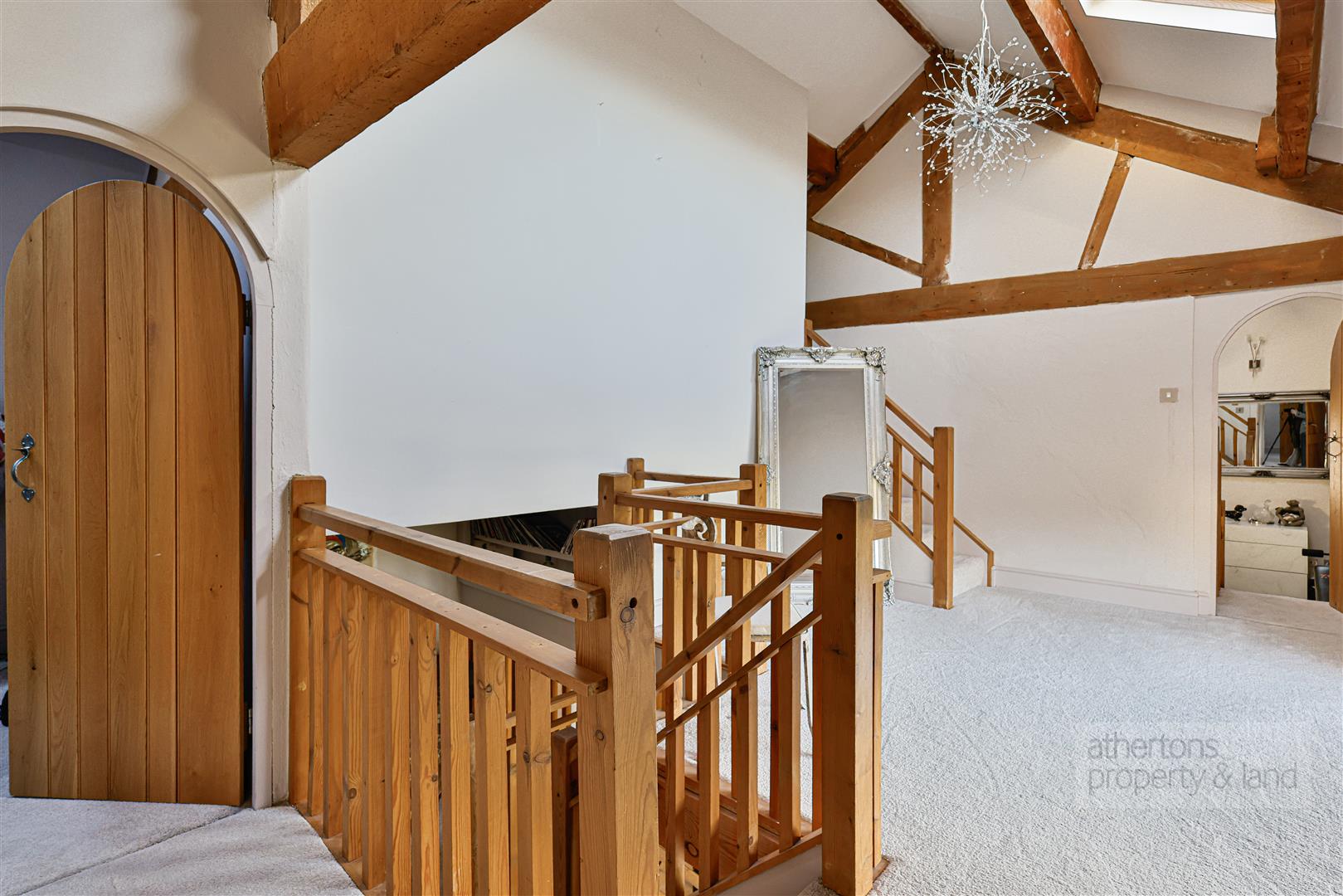 To the first floor, a light-filled and characterful landing with exposed beams, pitched ceiling and Velux windows sets a dramatic tone. The principal bedroom is a generous and elegant suite, featuring exposed beams, multiple windows and a modern en-suite shower room with walk-in wet area and mains shower. A private staircase from the bedroom leads to a dedicated dressing room, fitted with hanging and shelving and illuminated by a Velux window. Two further bedrooms also feature exposed beams and enjoy a combination of Velux and traditional windows, while the family bathroom is fitted with a contemporary white suite including a freestanding roll-top bath, tiled flooring, wash basin and Wc.