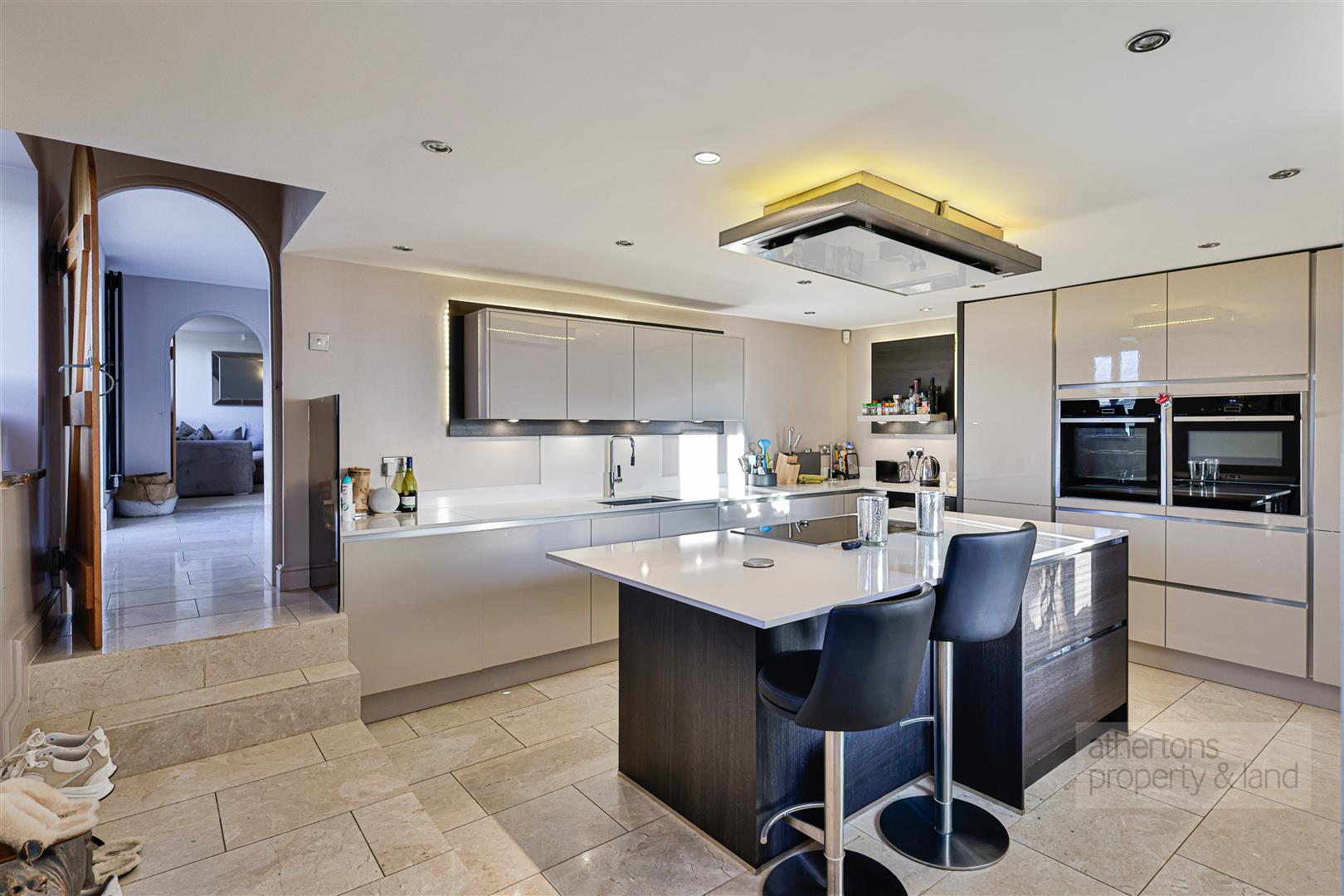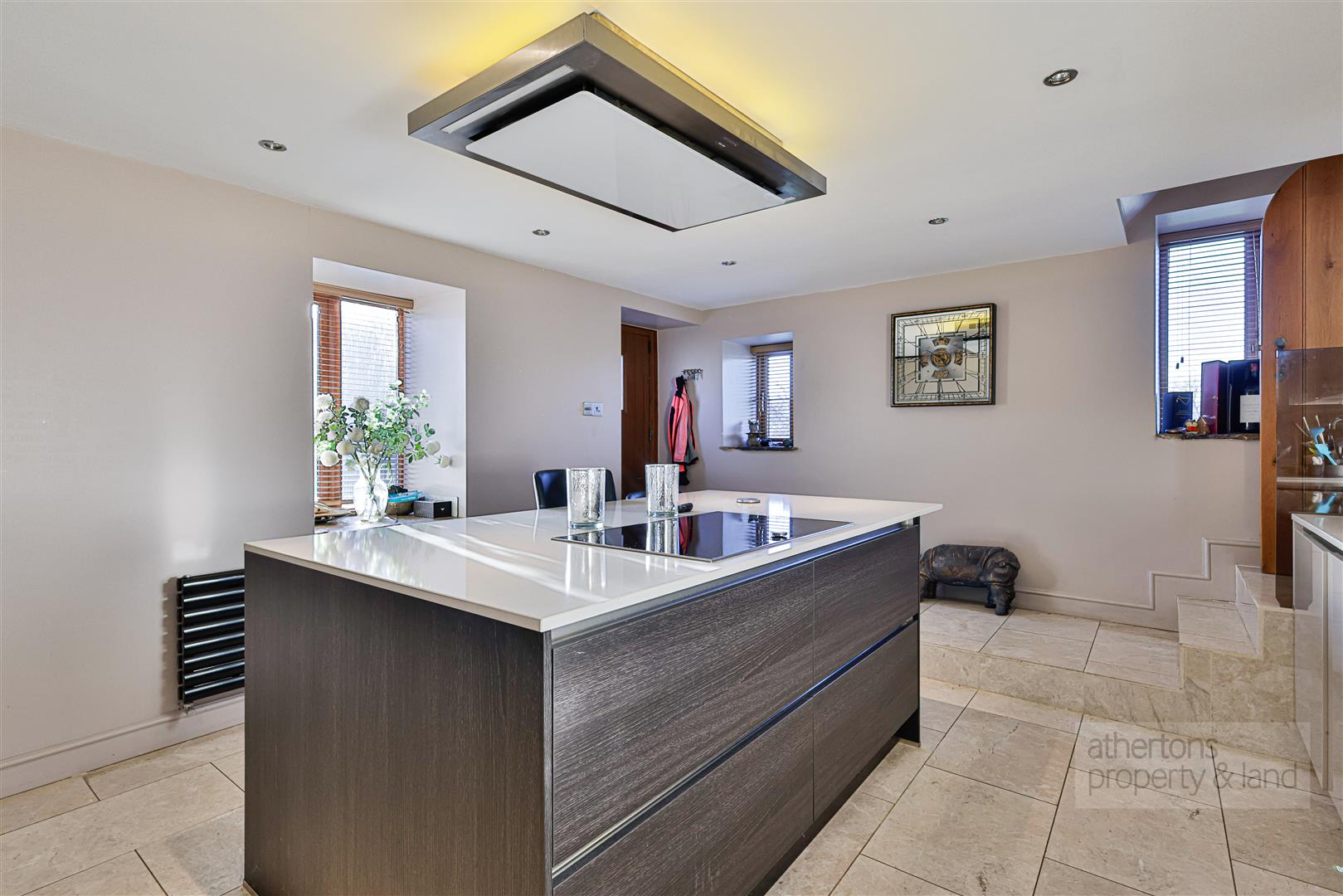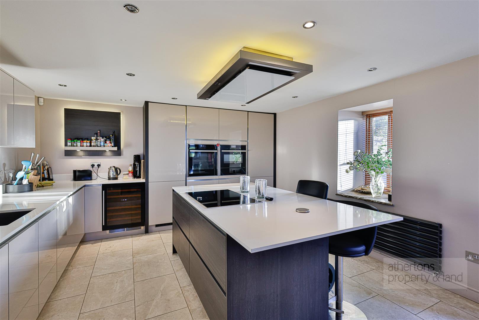 The kitchen is both practical and visually impressive, fitted with sleek gloss wall and base units topped with white Quartz work surfaces and enhanced by under- and over-unit LED lighting. A large central island provides additional storage and seating, ideal for casual dining. Integrated Neff appliances include twin ovens (with hideaway door and combi function), a warming drawer, induction hob with ceiling-mounted extractor, full-height fridge and freezer, wine fridge and dishwasher. A tiled floor, modern radiator and recessed spotlighting complete this stylish and functional space. A separate utility room, off the dining hall, provides further storage, laundry facilities and external access, while a ground floor cloakroom adds everyday convenience.