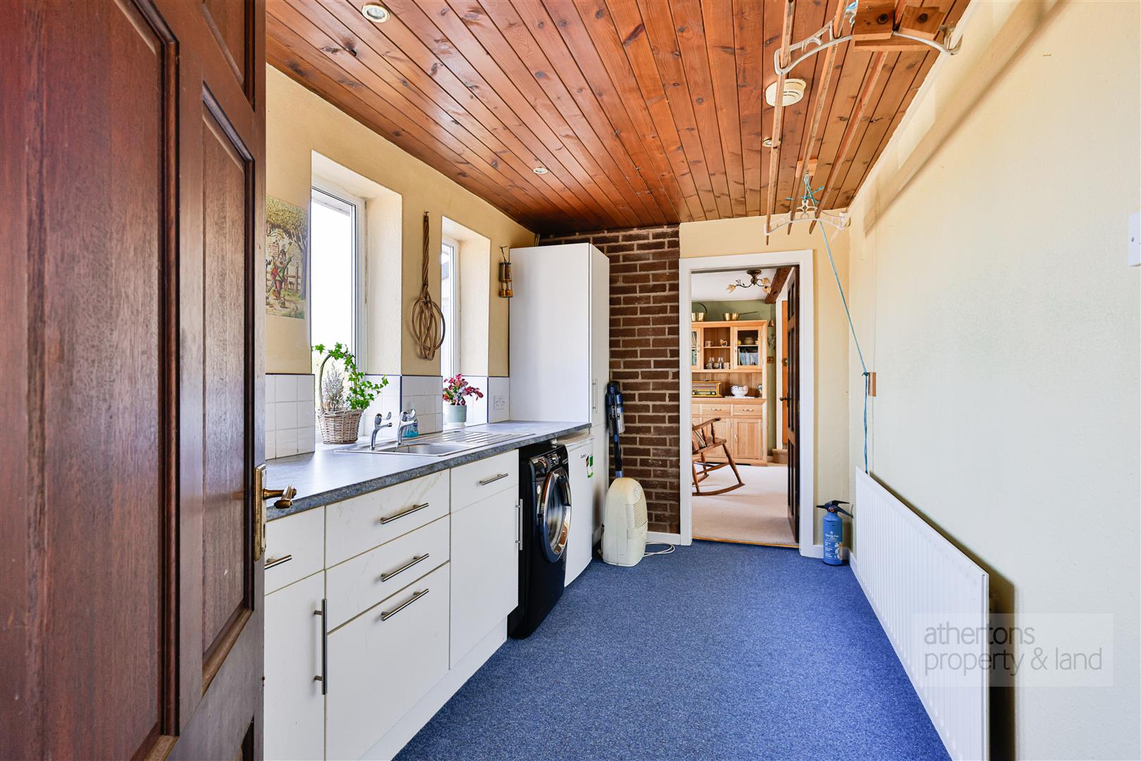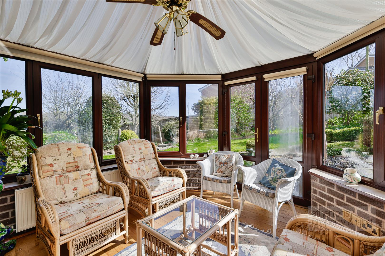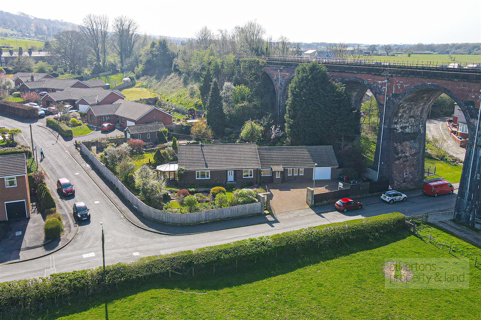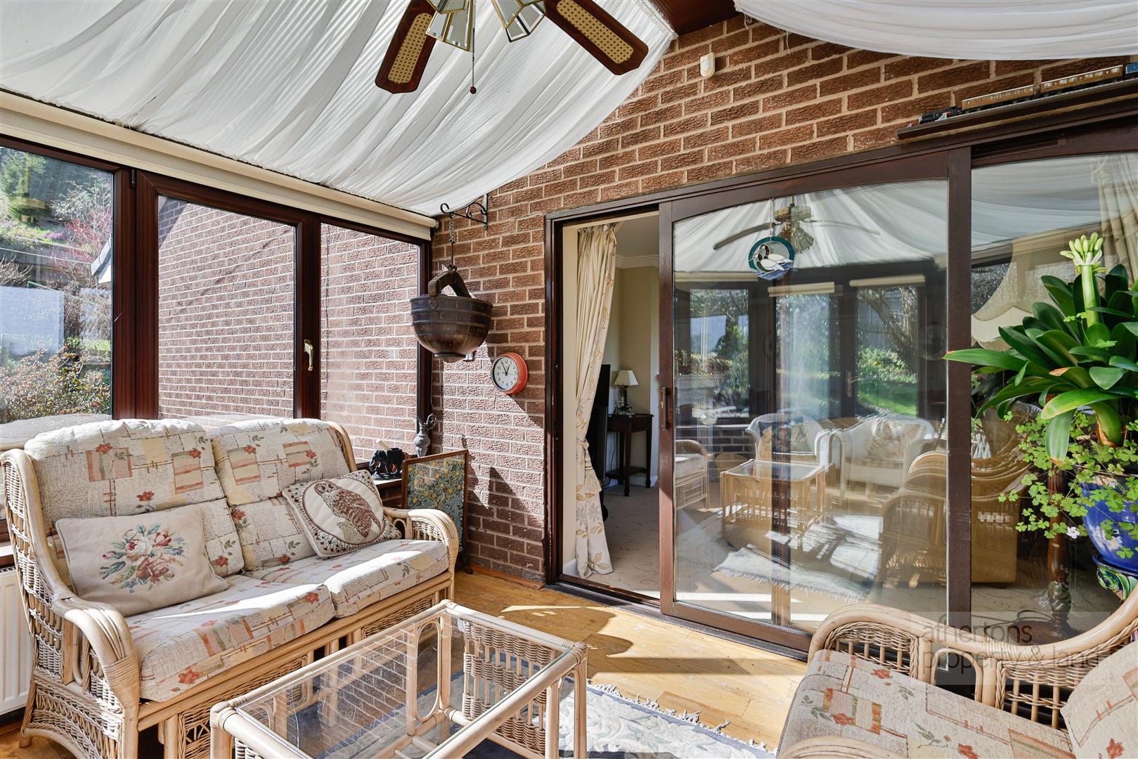 A welcoming L-shaped entrance hall provides access to the loft, which is partially boarded, and houses the gas combination boiler. The main lounge is a particularly attractive reception space, centred around a marble fireplace with inset gas fire, and enjoying delightful views towards the viaduct. Sliding doors open through to a bright conservatory, which takes full advantage of the garden outlook, with UPVC double glazing and French doors leading directly outside.
