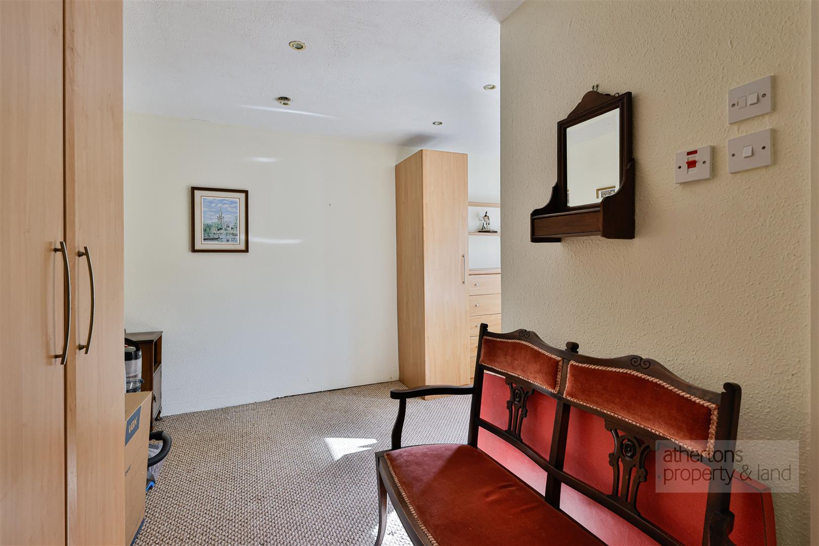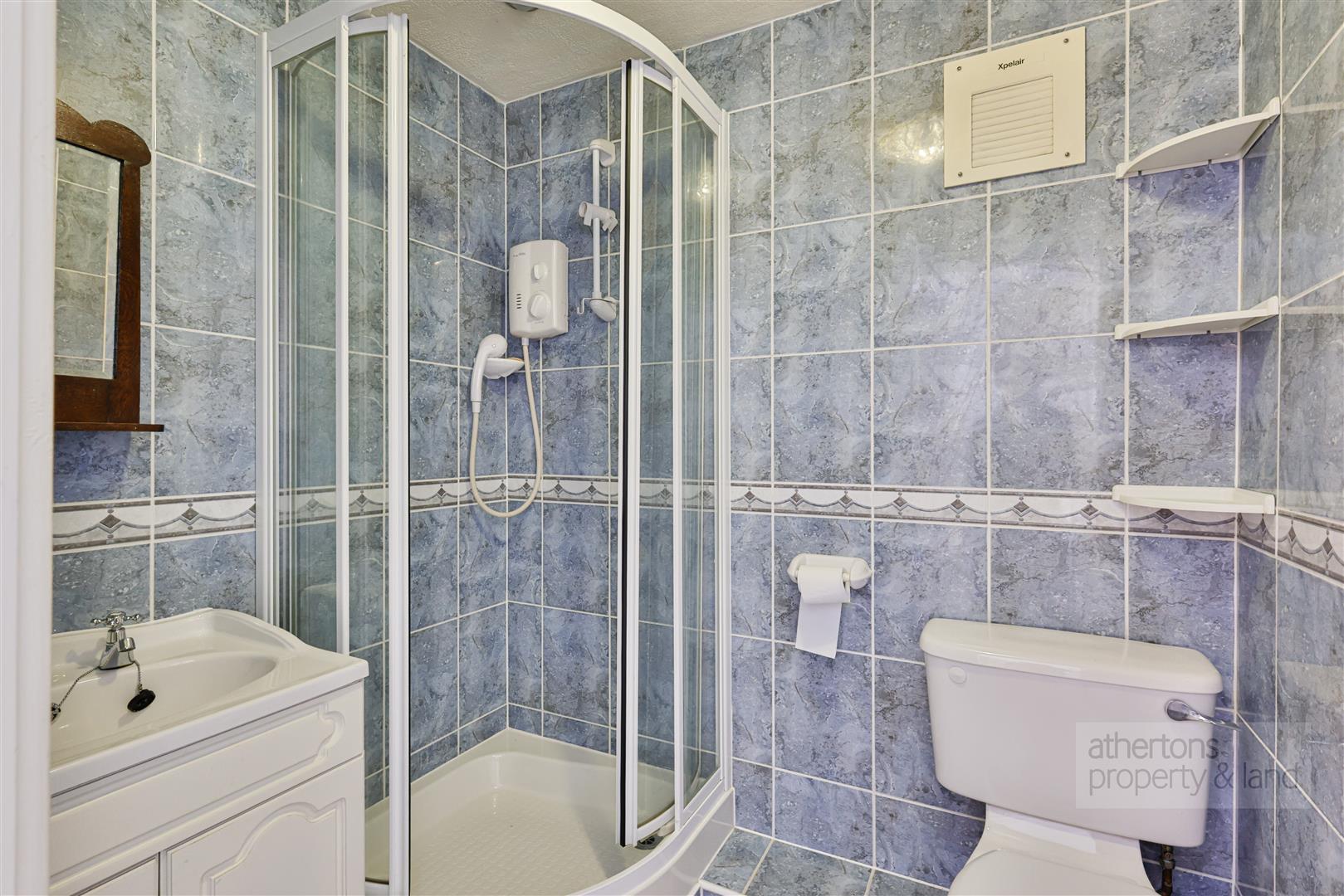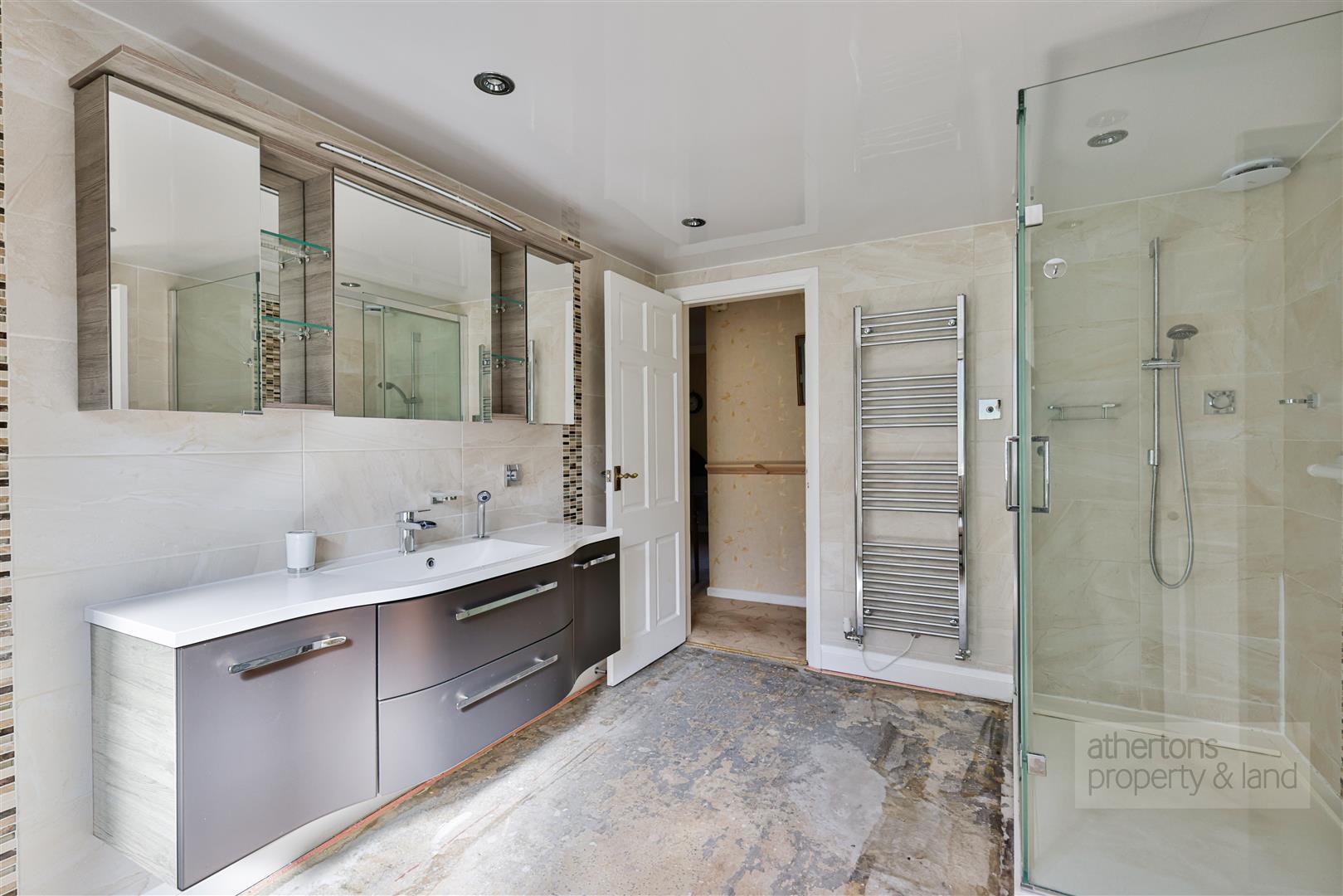 Further accommodation includes two well-proportioned bedrooms, with the principal bedroom benefiting from a range of fitted furniture and access to a Jack and Jill style shower room, fitted with a walk-in mains shower, vanity unit, WC and useful storage. Floor coverings are yet to be laid in the bathroom. A separate cloaks/WC, formerly a single bedroom, provides additional convenience and further scope for reconfiguration if desired. A utility room is also present, offering additional base units, worktop space, a sink and plumbing for laundry appliances. Off the utility room is the integral double garage with electric up and over door and external access to the rear.