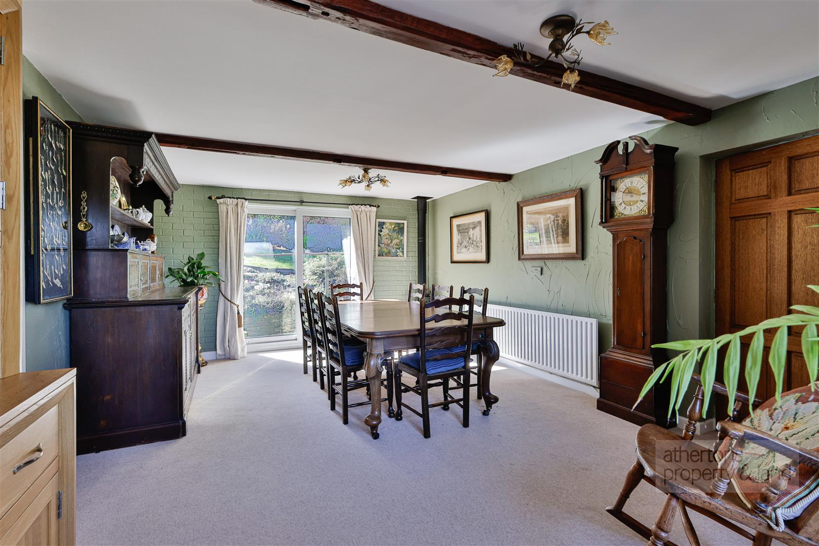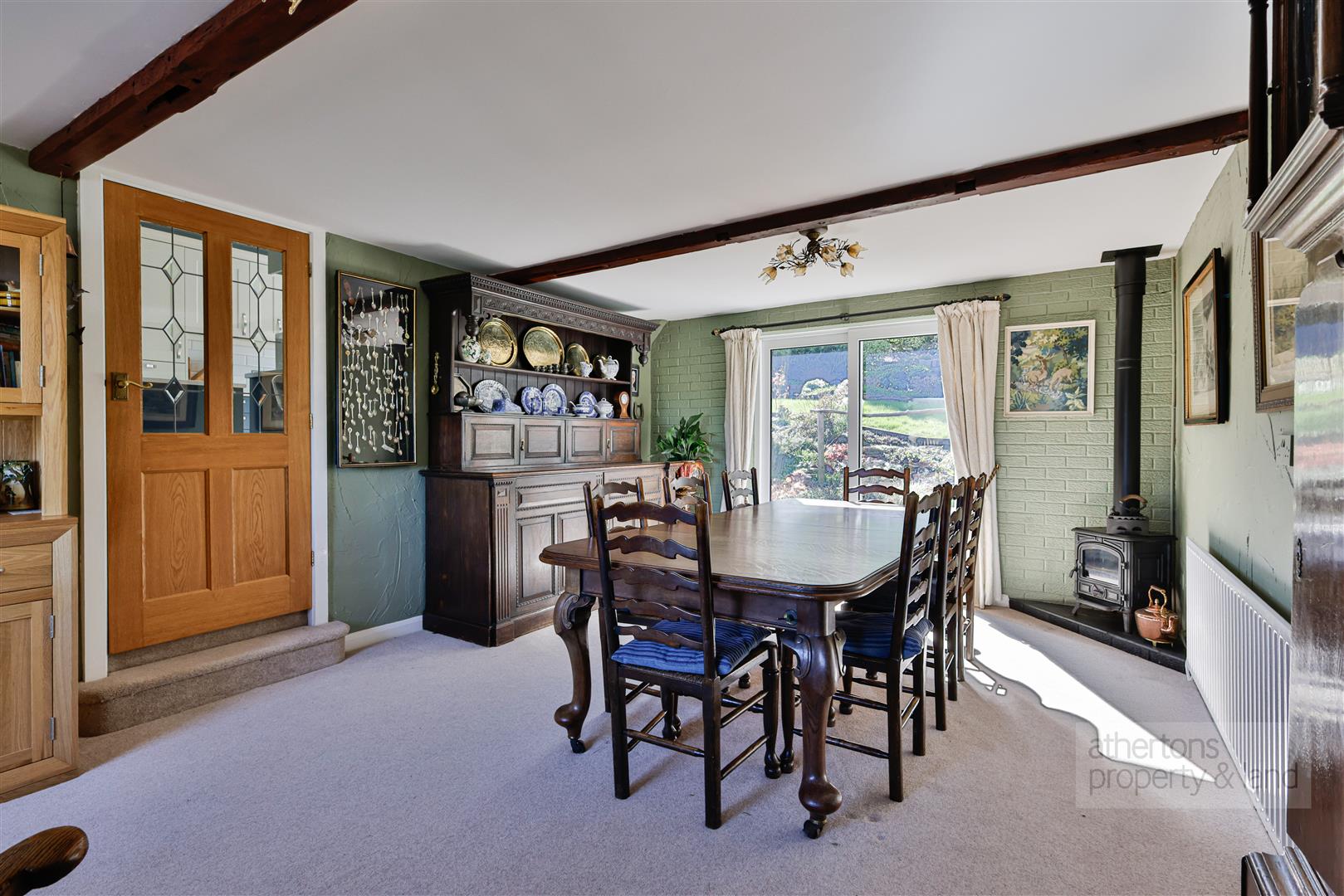 The kitchen is fitted with a modern range of base and eye-level units, complemented by quartz worktops and a comprehensive range of integrated appliances including a fridge/freezer, induction hob with extractor, oven and grill, plate warming drawer and dishwasher. Tiled splashbacks complete the space, while folding doors open into the adjoining dining room, creating a sociable and practical layout. The dining room could be converted back into a bedroom with original doorway being blocked off from the entrance hall. Steps lead down from here to a formal sitting room, a characterful space featuring a cast iron gas stove set upon a hearth, with sliding doors opening to the front porch.