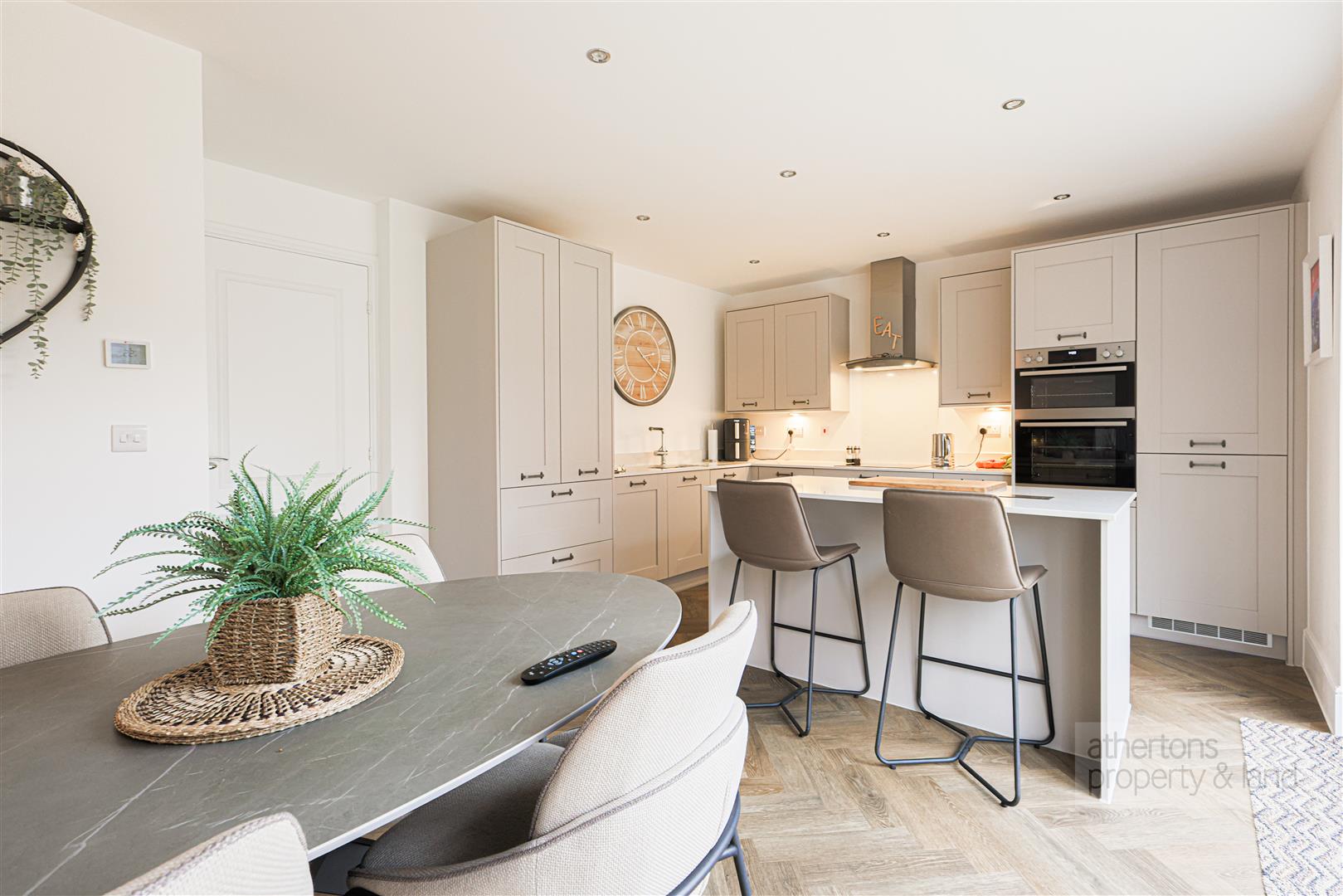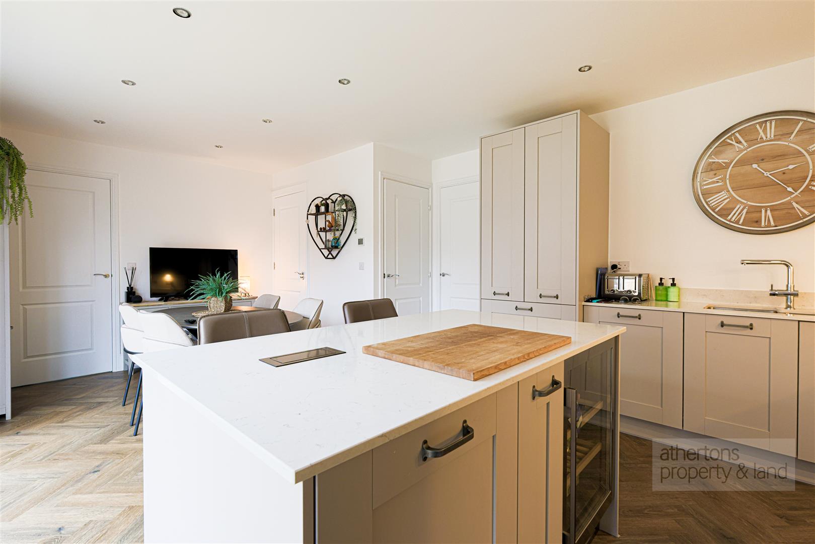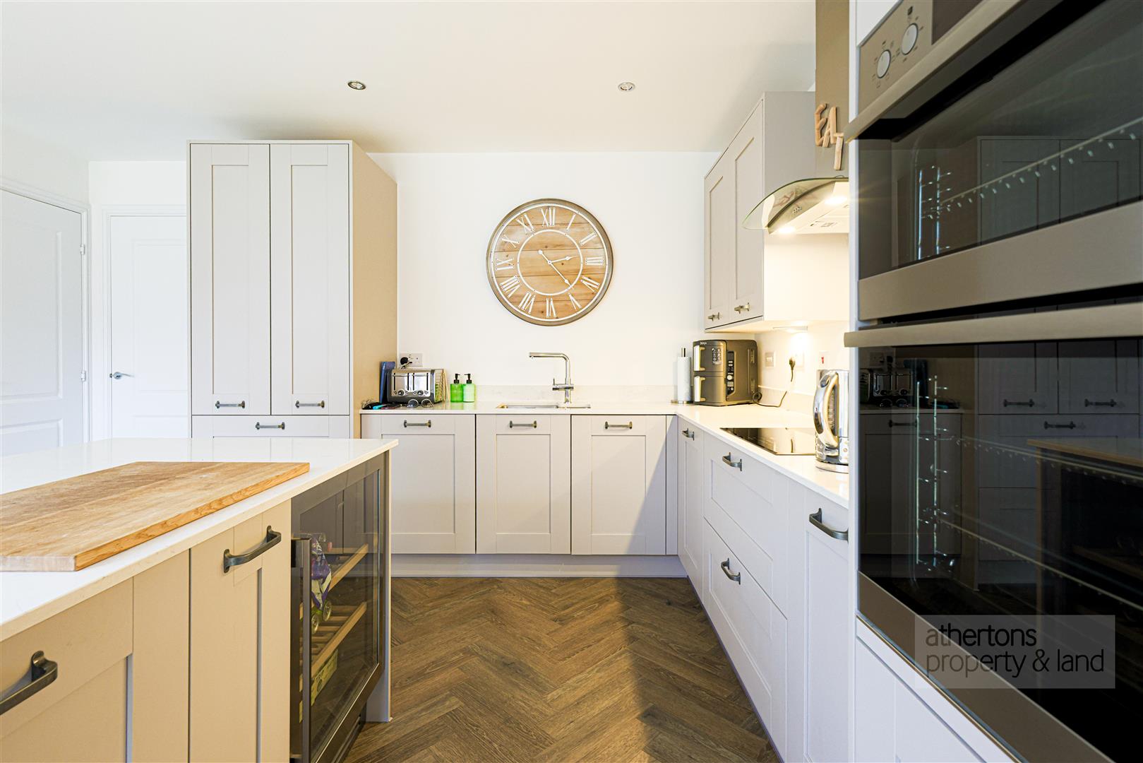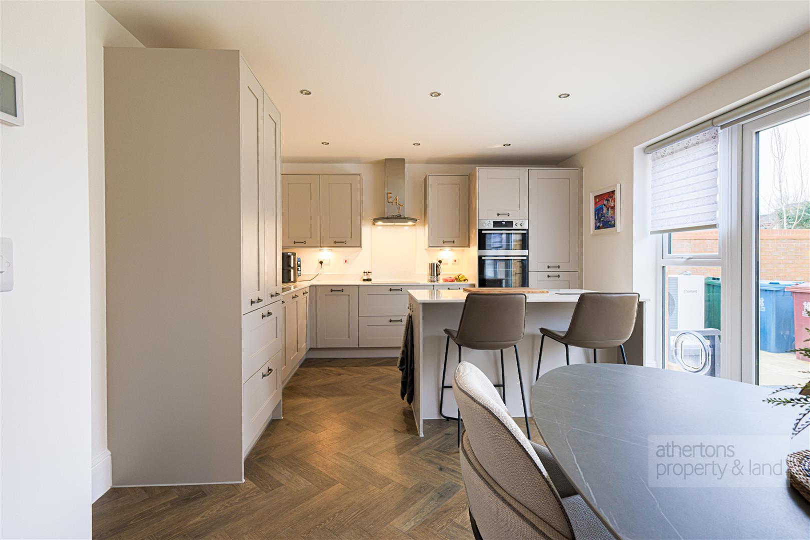 To the rear lies the beautifully upgraded kitchen and dining room. Fitted with an extensive range of Shaker-style base and eye-level cabinetry, the kitchen is complemented by Corian work surfaces and a full suite of integrated AEG appliances including fridge/freezer, double oven, induction hob with extractor, and dishwasher. A central island with matching Corian worktops incorporates a wine fridge and breakfast bar seating, providing both a practical workspace and a sociable focal point. There is ample space for a family dining table, under-stair storage for added convenience, and French doors opening directly onto the rear patio - seamlessly connecting indoor and outdoor living. An integral door has been added by the current owners providing direct access to the spacious garage with power, lighting and up and over manual door.
