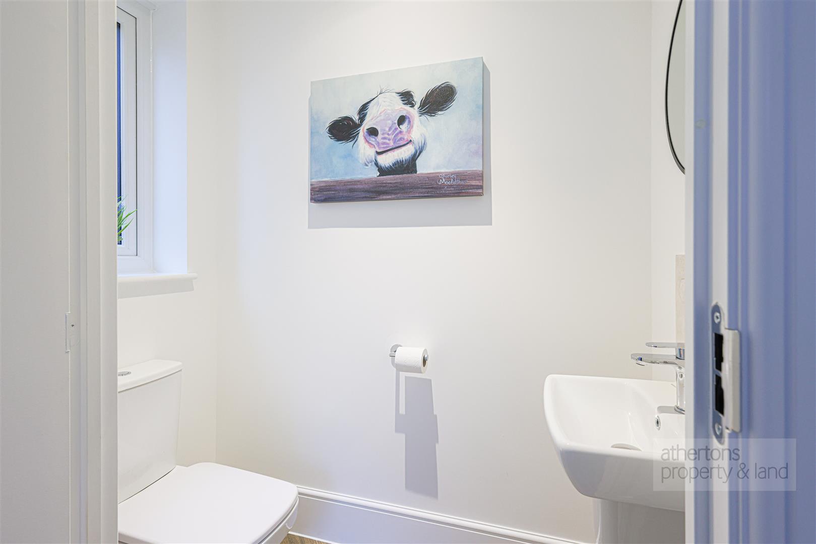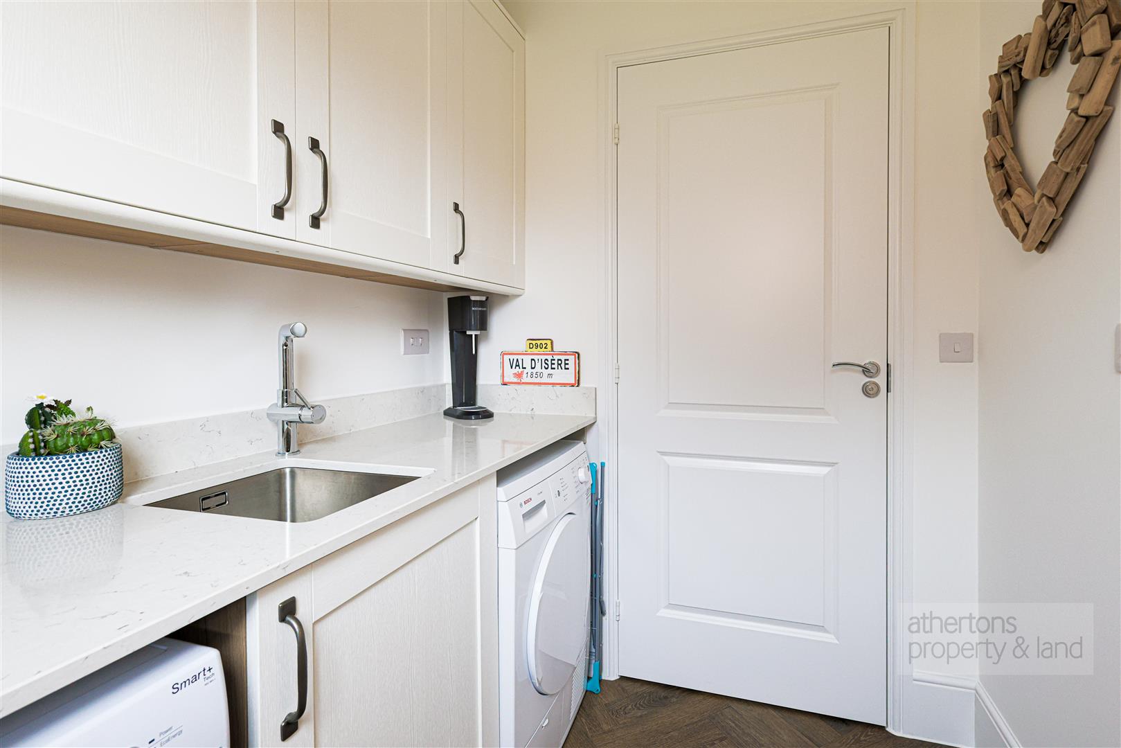 The adjoining utility room continues the high-quality finish with matching cabinetry, Corian worktops, stainless steel sink, plumbing for washer and dryer, and an external door to the side. A two-piece ground floor WC is accessed off the utility, completing the practical ground floor layout.