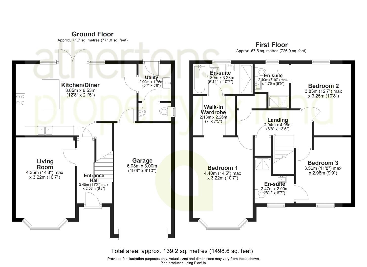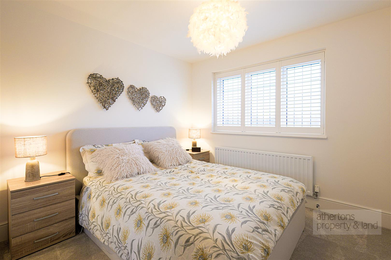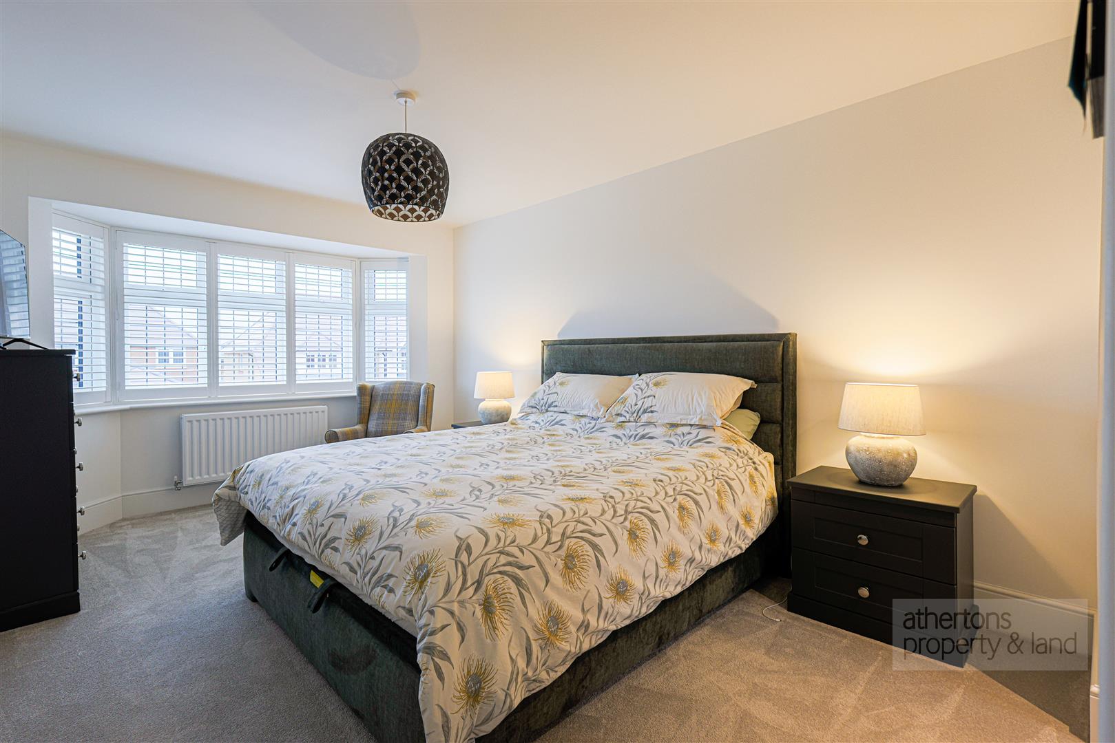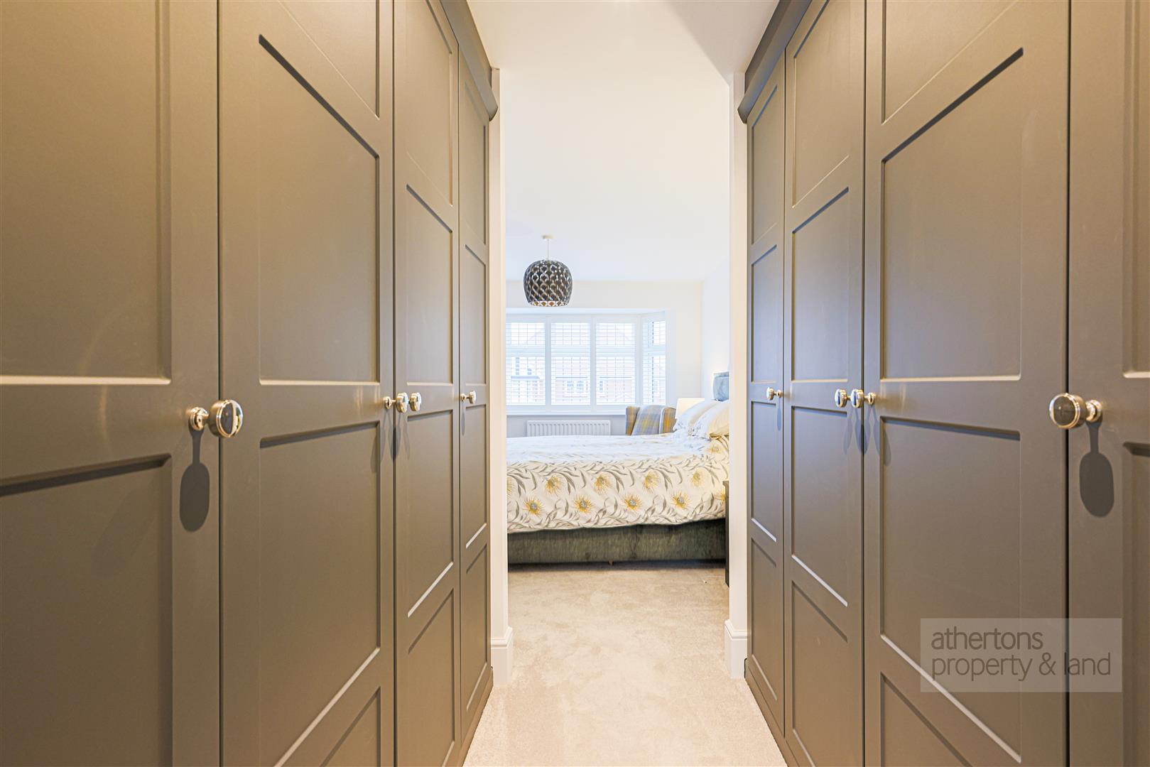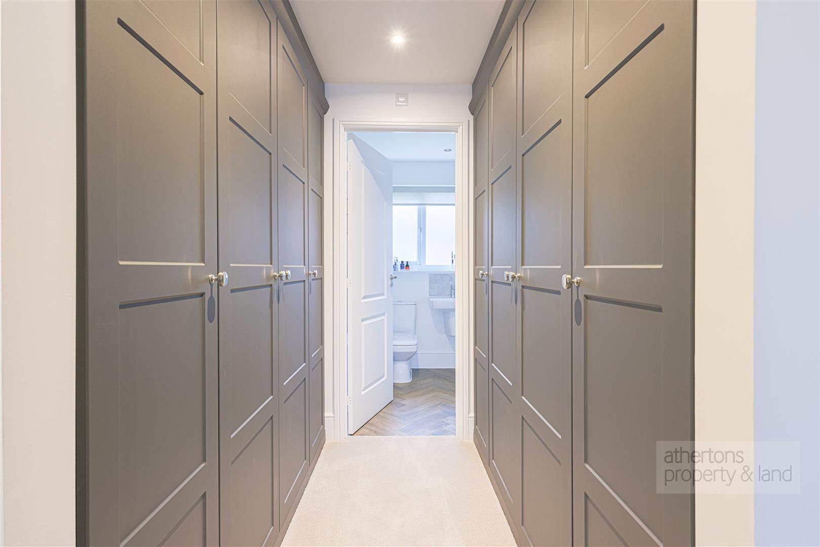 To the first floor, the landing provides loft access and two useful storage cupboards, one housing the hot water cylinder. The principal bedroom is a particularly impressive suite, featuring a bay window to the front with French shutters and open access to a well-appointed walk-in wardrobe with ample fitted wardrobes. The en-suite is finished with a contemporary four-piece suite comprising porcelain basin, dual flush WC, wall-mounted wash basin, tiled elevations, and a spacious walk-in dual-head mains shower.