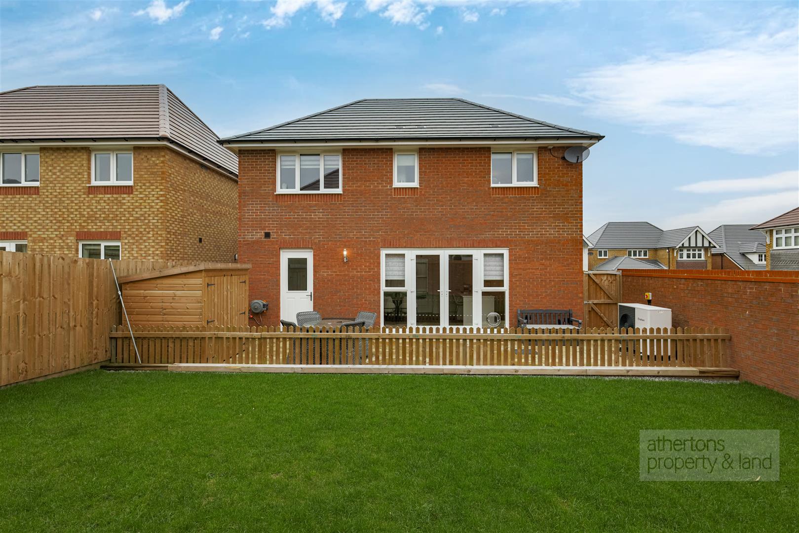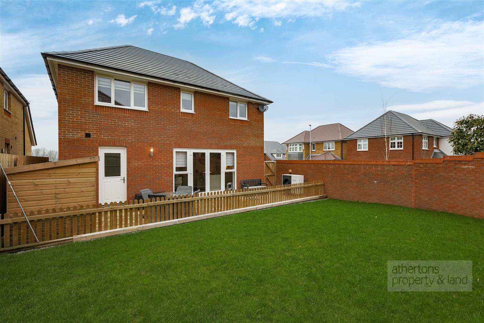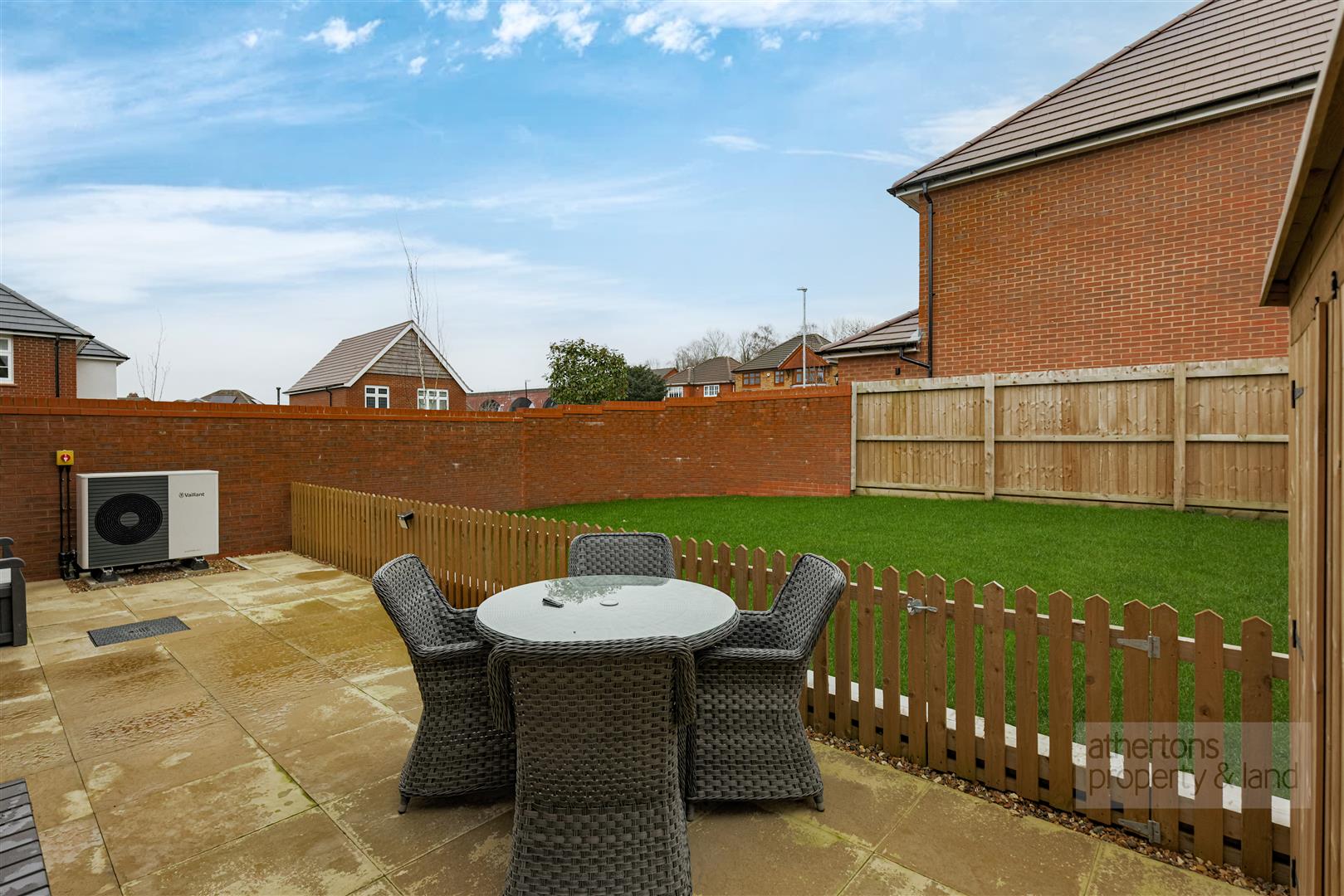 Externally, the rear garden is enclosed by walling and fencing, offering a secure and private outdoor space. A tiled patio provides the perfect setting for outdoor dining and entertaining, leading onto a generous lawned area with gated side access.