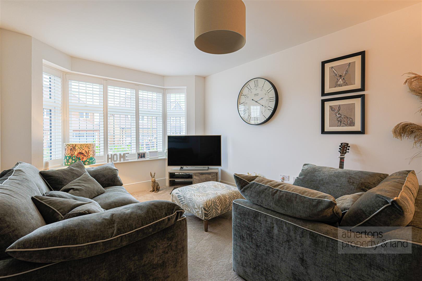 Stepping inside, the welcoming entrance hall features herringbone Amtico flooring and a staircase rising to the first floor, setting the tone for the quality and finish found throughout. The lounge is bright and generously proportioned, enhanced by a walk-in bay window fitted with elegant French shutters, creating a light-filled yet cosy reception space ideal for relaxing or entertaining.