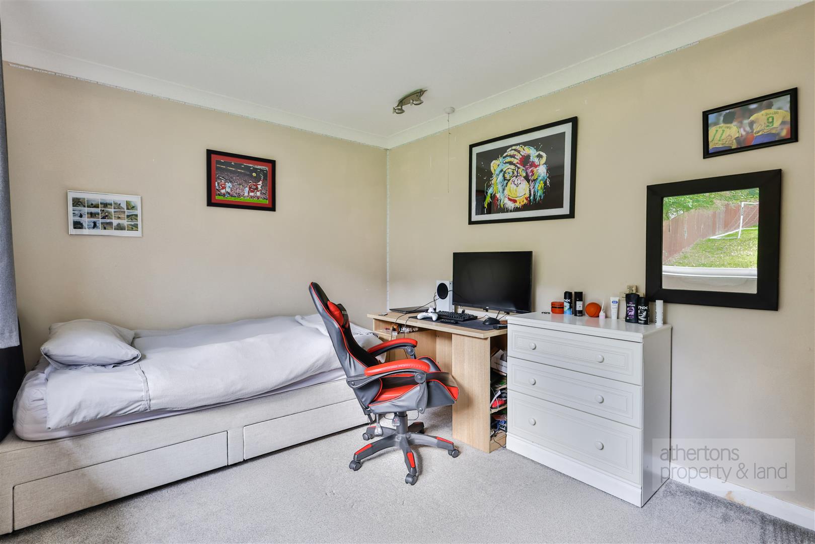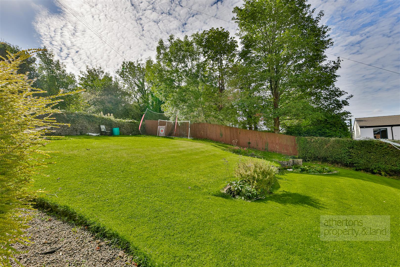 Outside, the stone boundary wall, raised planting, and gravel driveway create an attractive frontage. The detached double garage benefits from power, lighting, and personal access door. The rear garden combines lawn, raised patio, and mature planting, with excellent scope for further landscaping to fully capitalise on the unrivalled views.