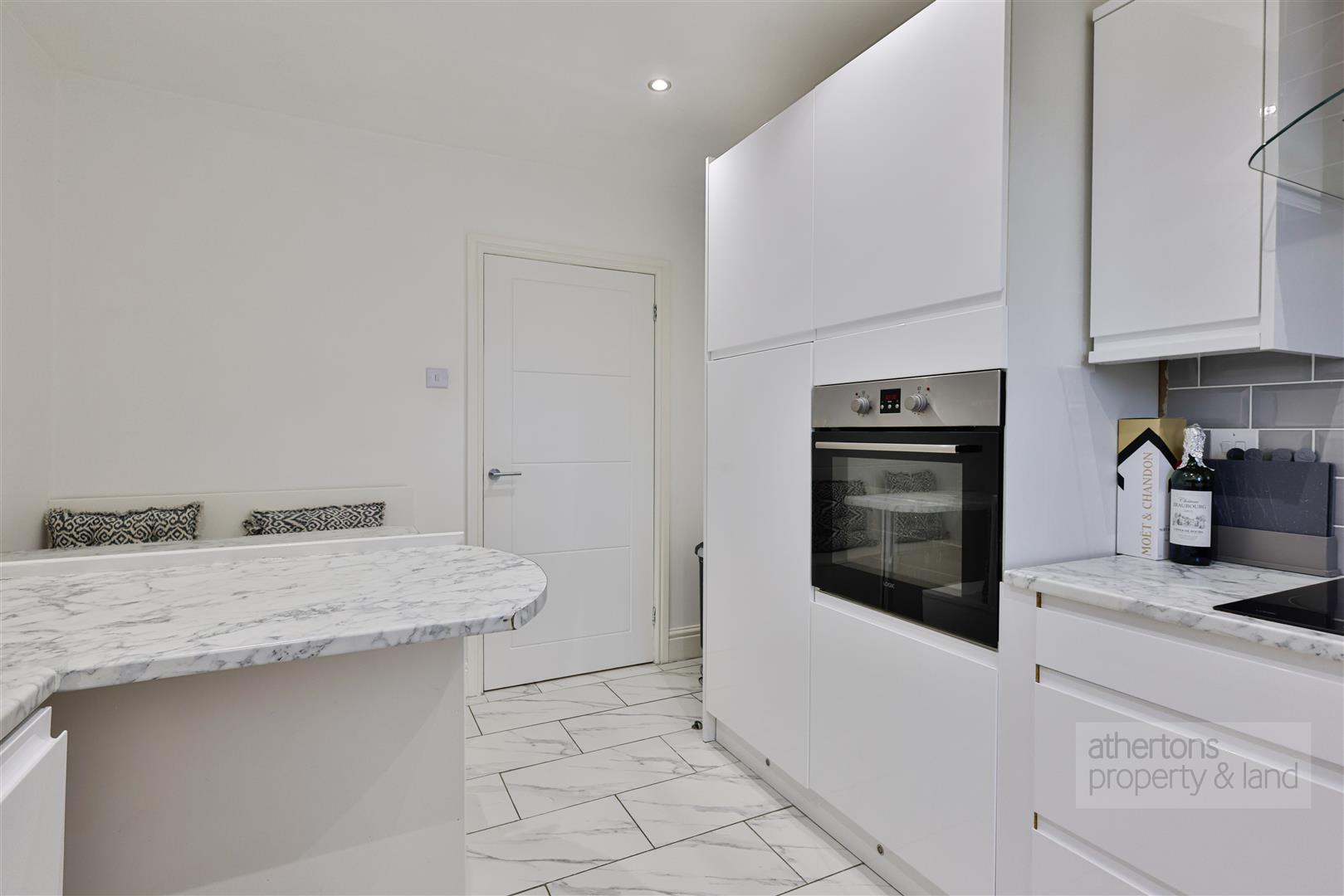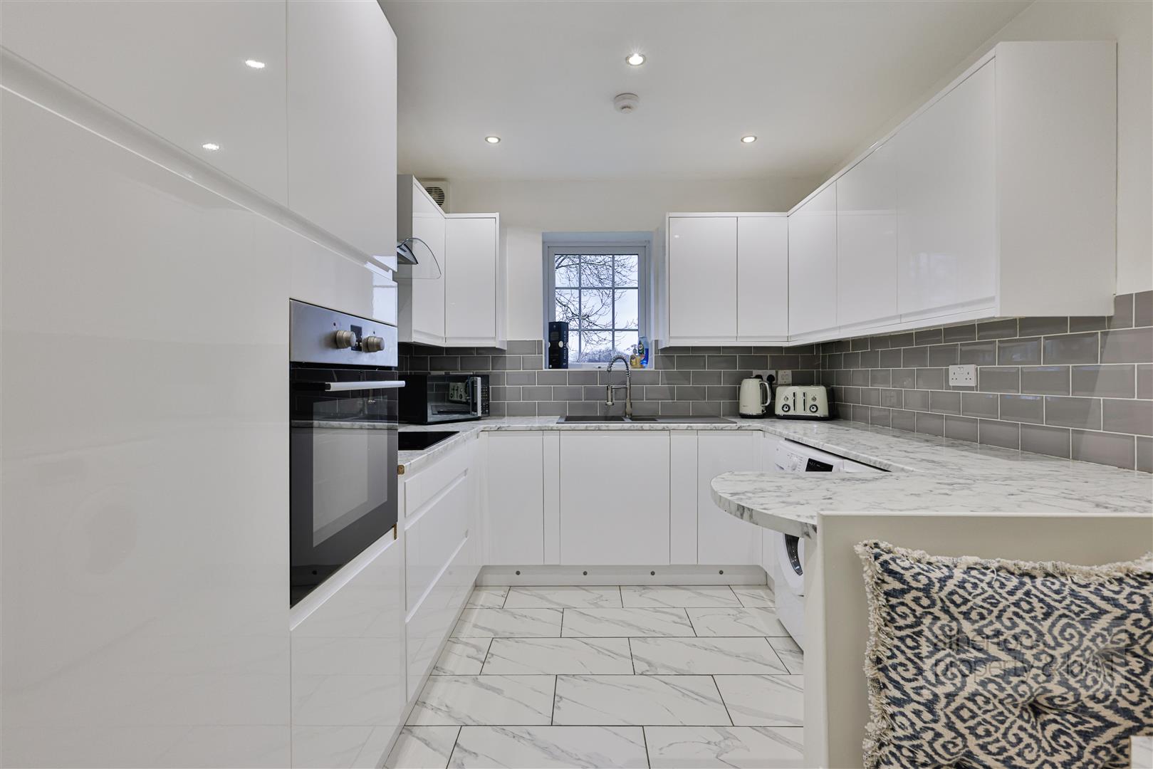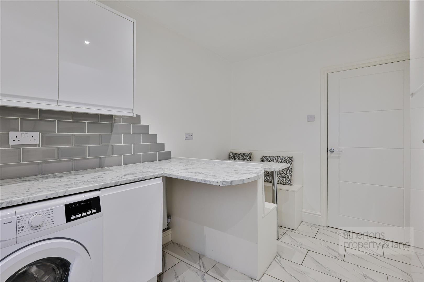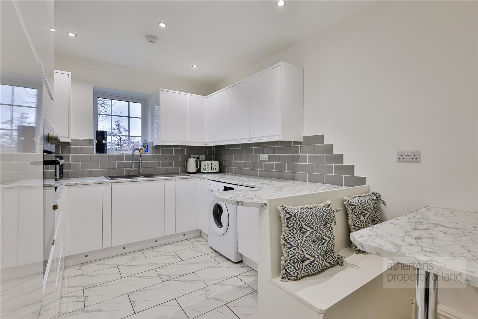 The separate kitchen is well-appointed and stylishly finished, fitted with a range of modern wall and base units complemented by marble-effect work surfaces, tiled splashbacks and flooring. Integrated appliances include a dishwasher and fridge-freezer, along with a four-ring electric hob and extractor. There is also a fitted bench dining area with table maximising space and providing a great social area.