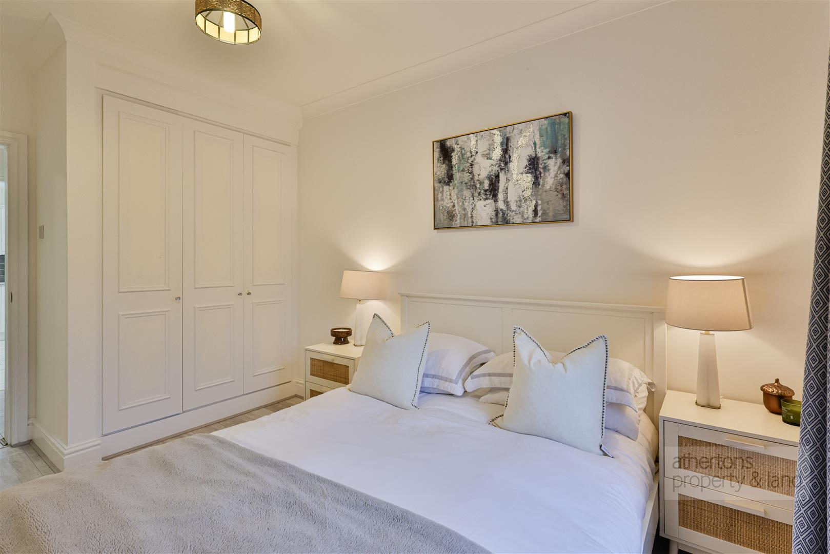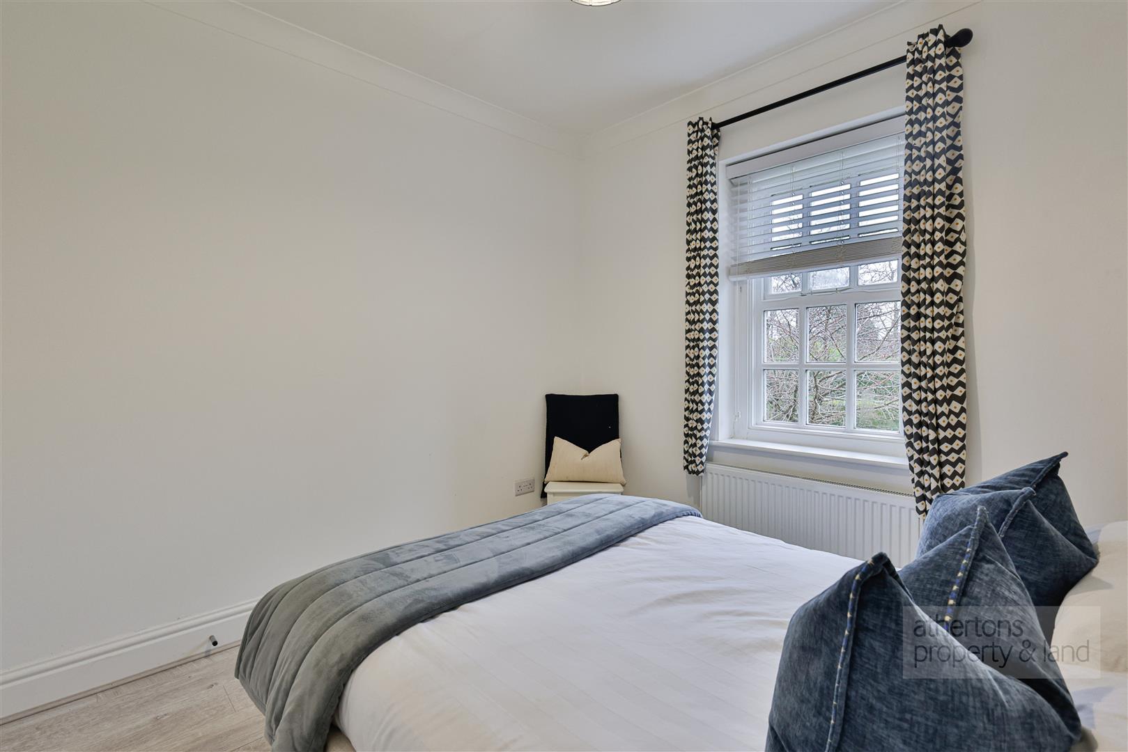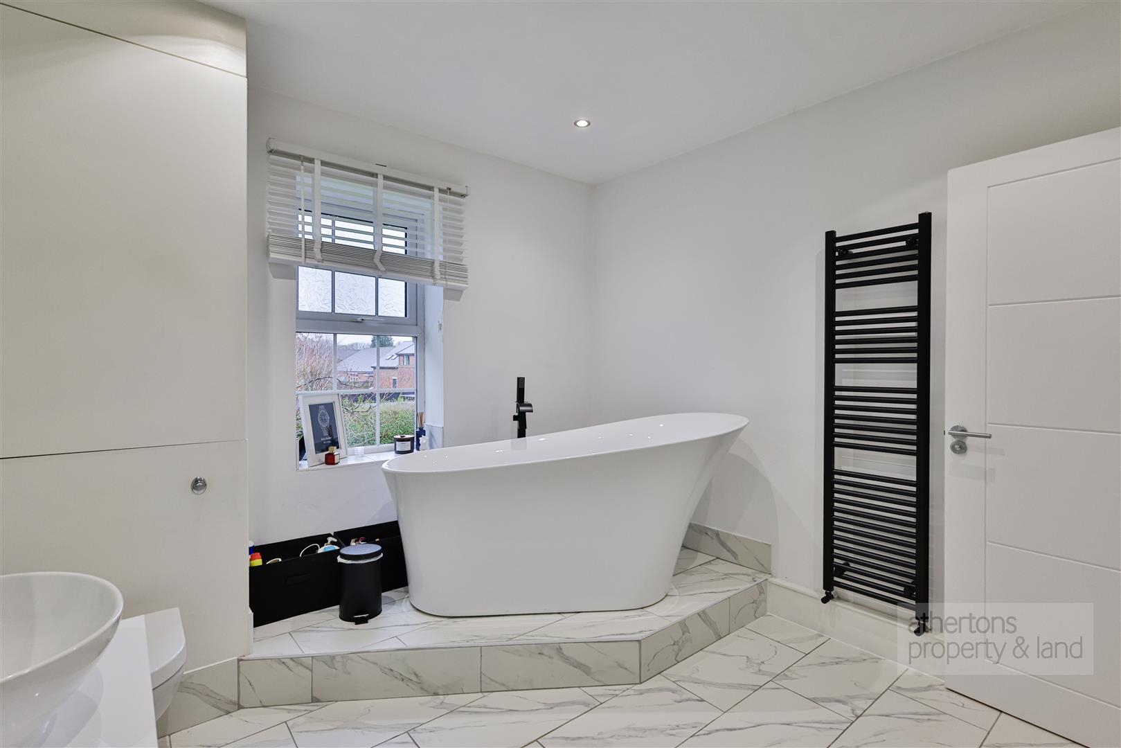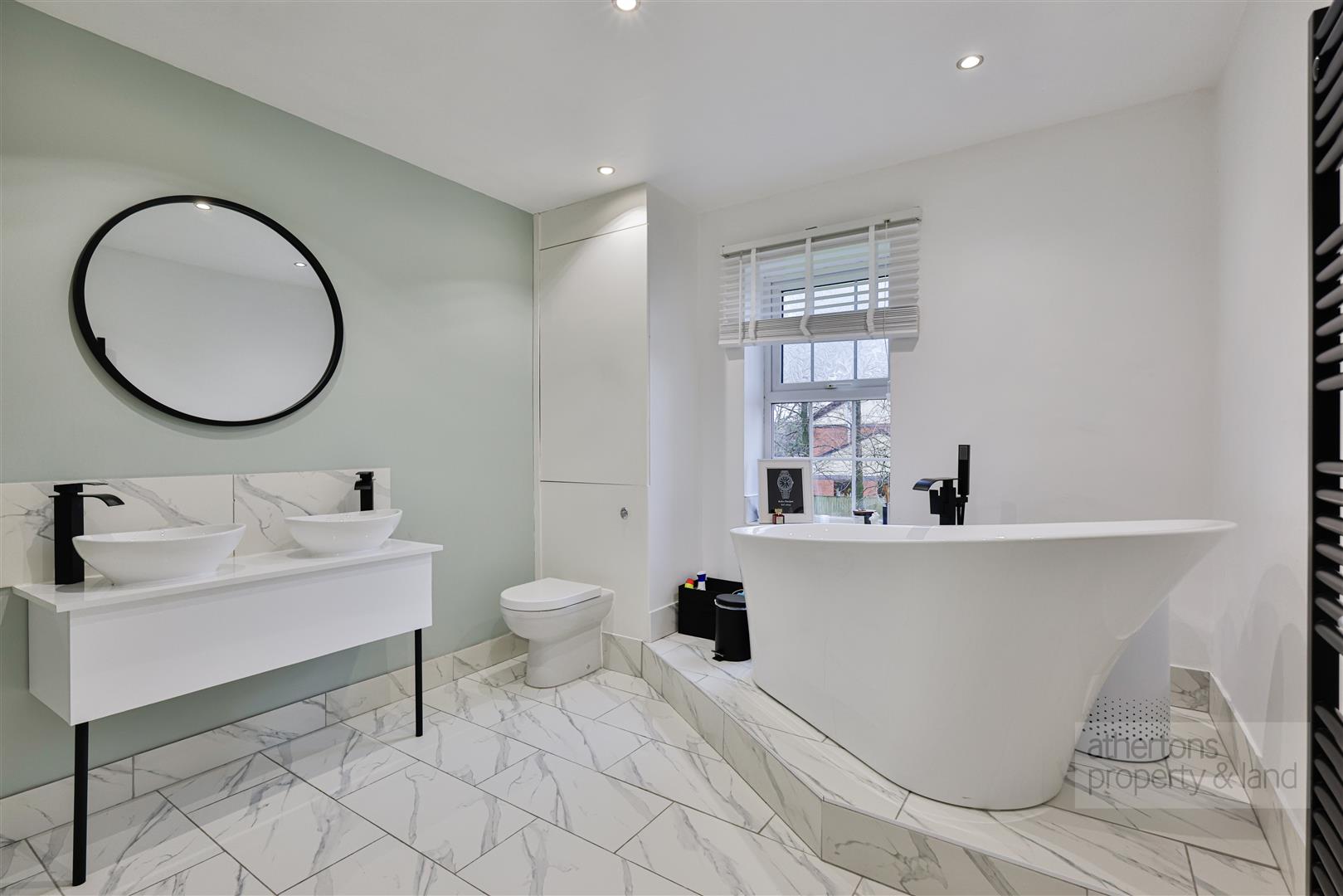 The bathroom is finished to an excellent standard and offers a contemporary four-piece suite comprising a striking freestanding bath, mains-fed shower enclosure, twin wash basins, WC and a heated towel radiator. Ceiling spotlights, tiled flooring and a useful storage cupboard housing the Worcester Bosch combination boiler complete the space.