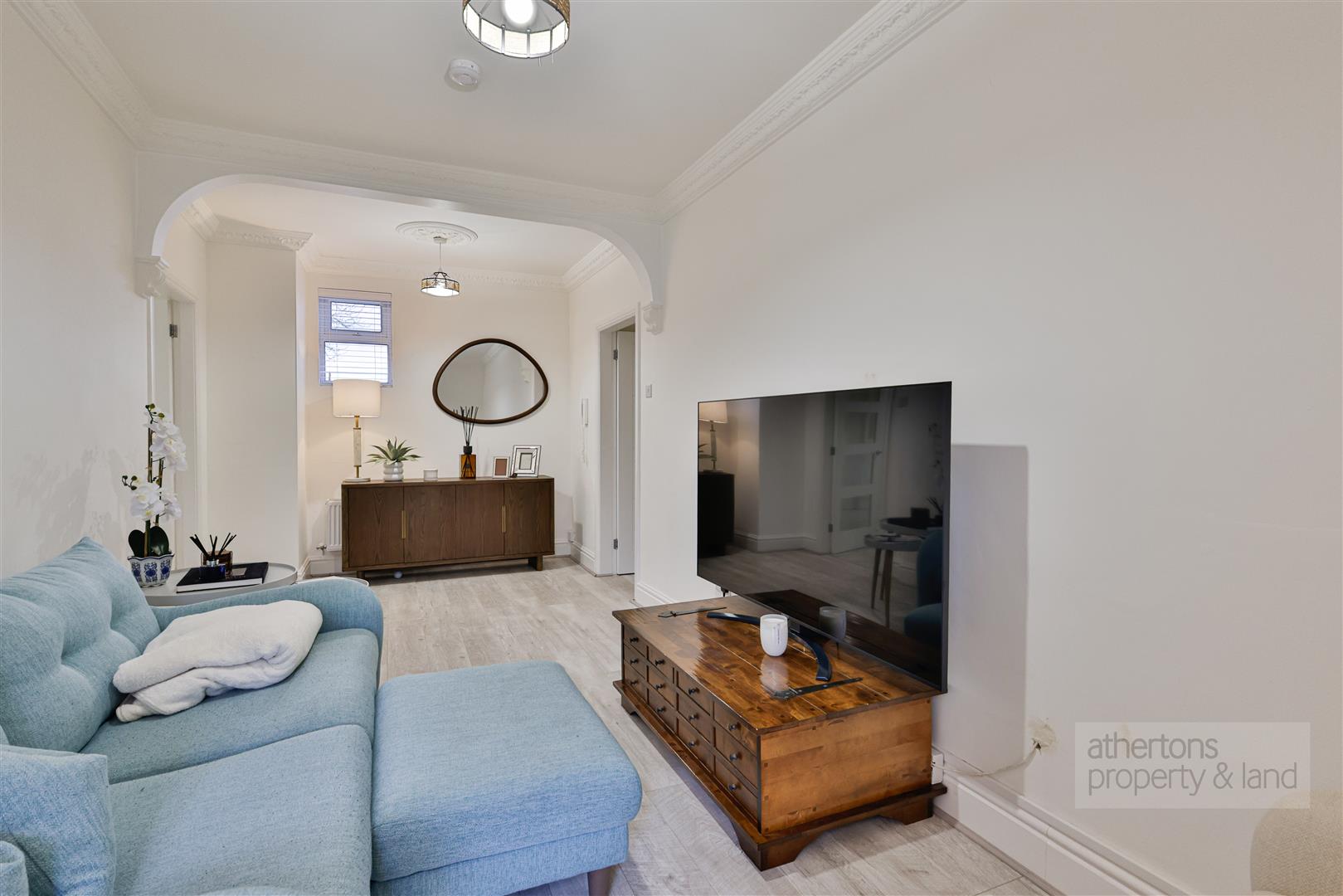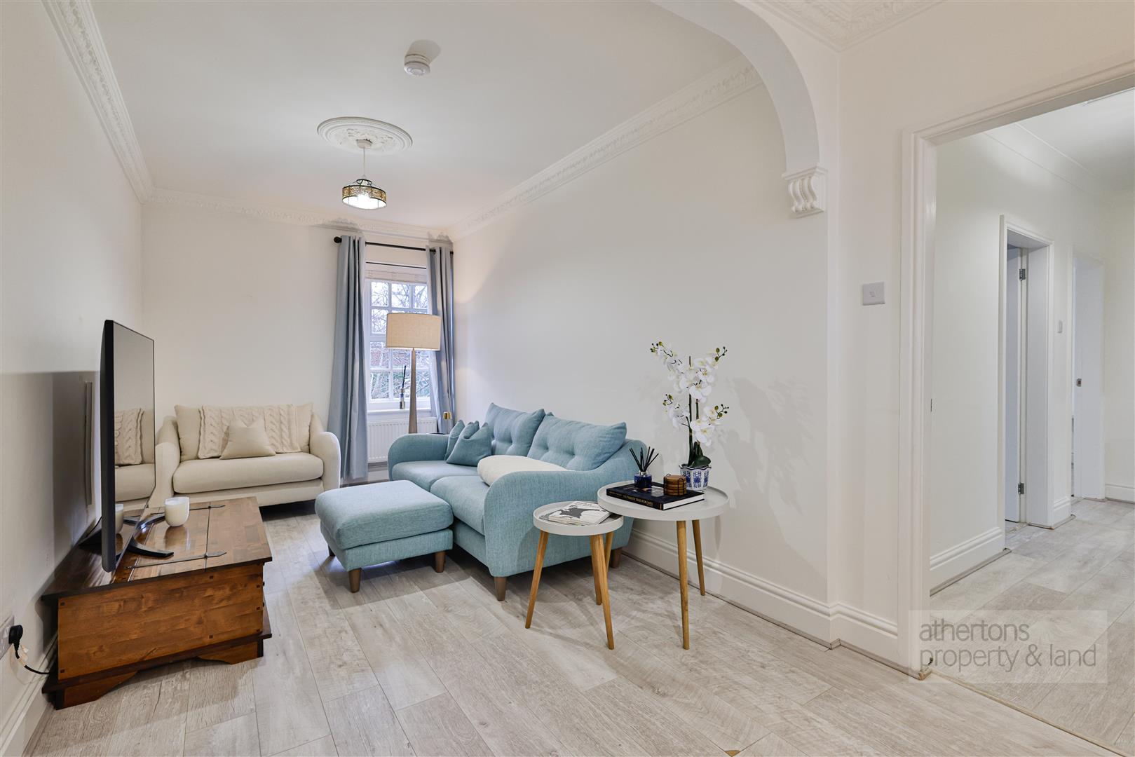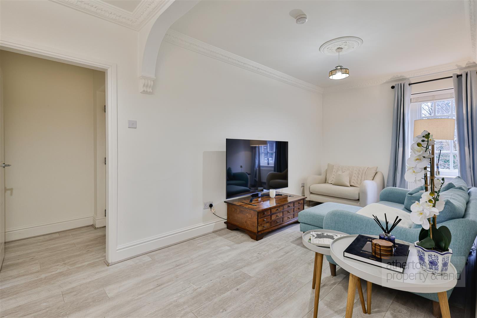 Accessed via a communal entrance, the apartment opens into a welcoming vestibule with laminate flooring and a useful storage cupboard. The generous lounge is a particular highlight, featuring dual-aspect windows, stylish coving, two panel radiators and ample space for both living and dining furniture, making it ideal for relaxing or entertaining.