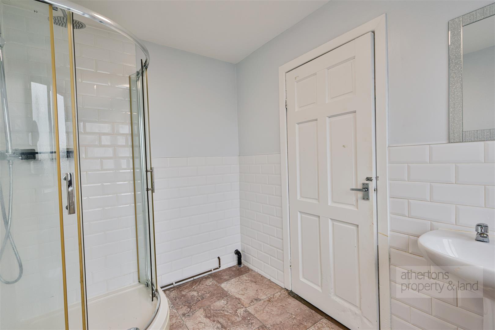 The fitted kitchen is well-appointed with a range of wall, base, and drawer units, complemented by coordinating worktops and tiled splashbacks. A Rangemaster-style oven with extractor hood, one-and-a-half bowl sink and drainer, breakfast bar seating area, plumbing for a washing machine, and wall-mounted boiler provide both practicality and functionality. A rear porch with UPVC double glazing offers additional access and utility space. The ground floor is further enhanced by a modern shower room comprising a shower cubicle, low-suite WC, pedestal wash basin, part-tiled walls, and heated radiator.