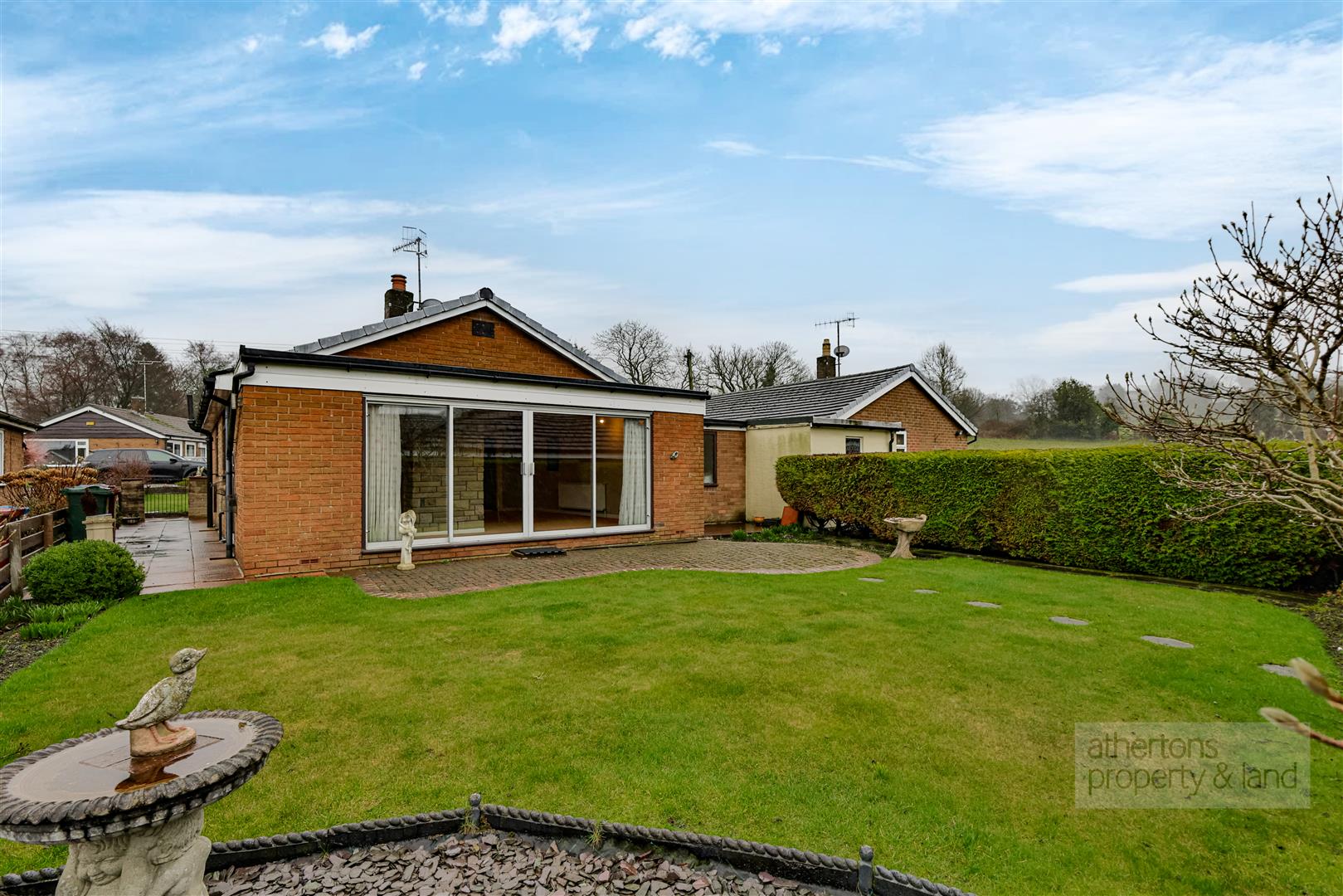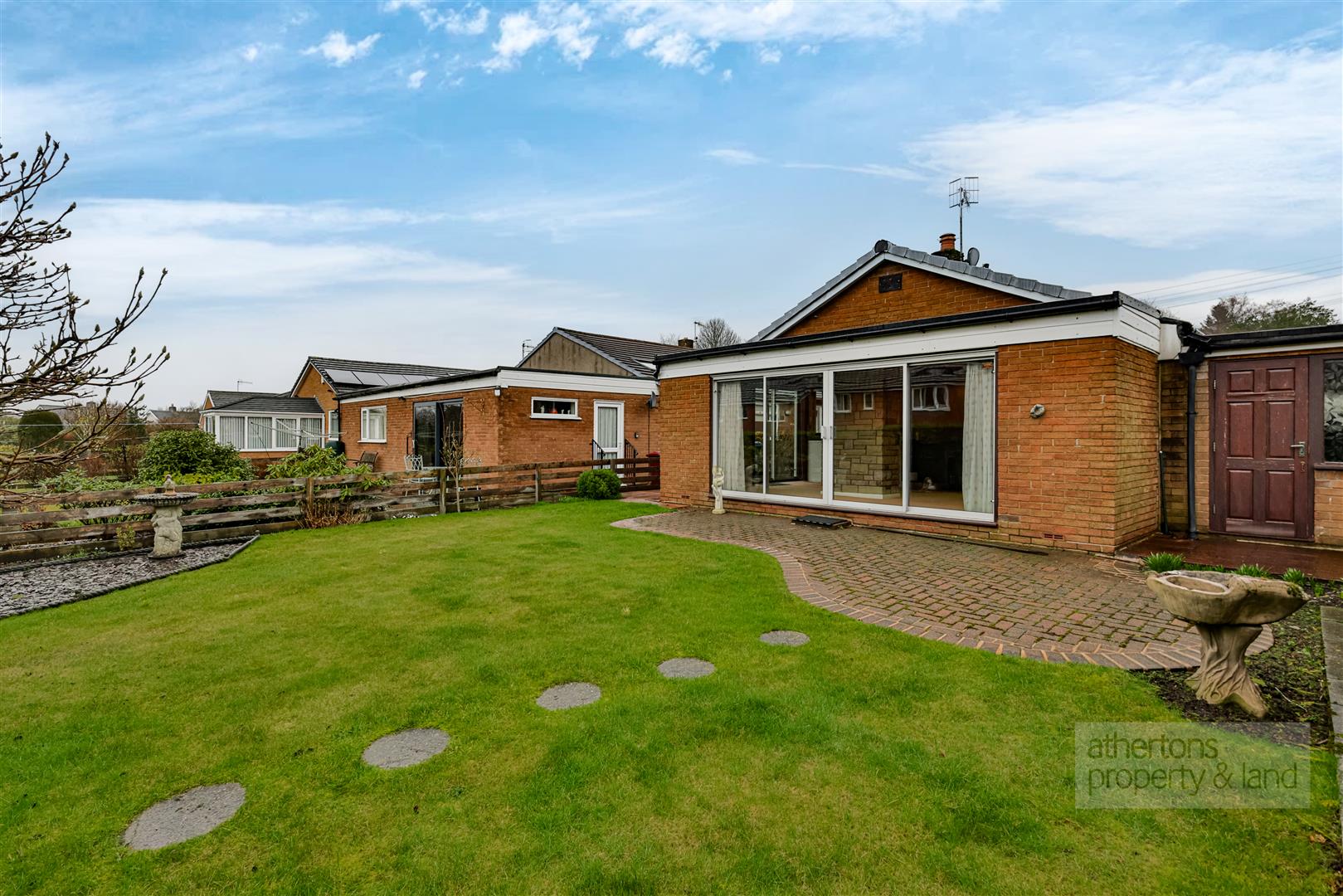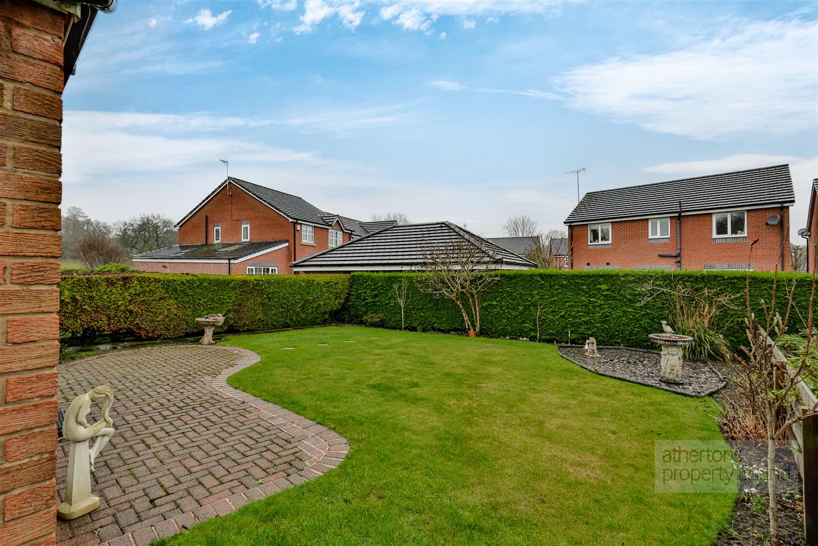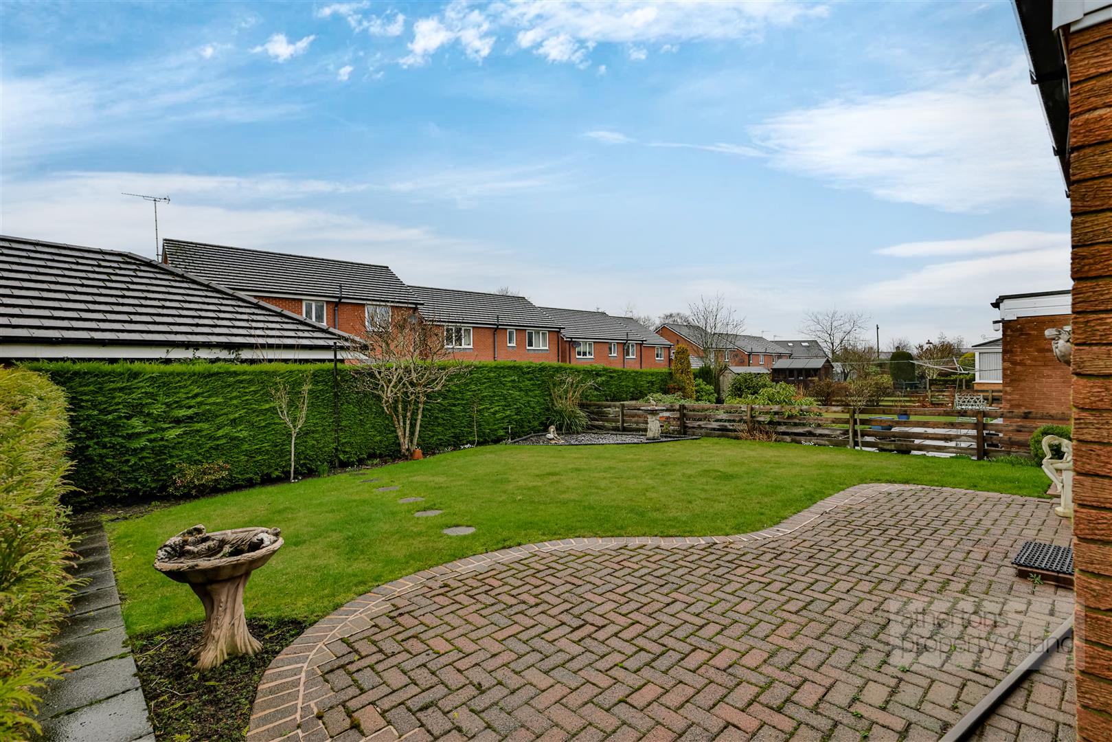 The rear garden is particularly spacious and beautifully maintained, featuring a manicured lawn, block-paved patio seating area, chipped and planted borders, and paved pathways leading around the property - ideal for those who enjoy gardening or outdoor relaxation.