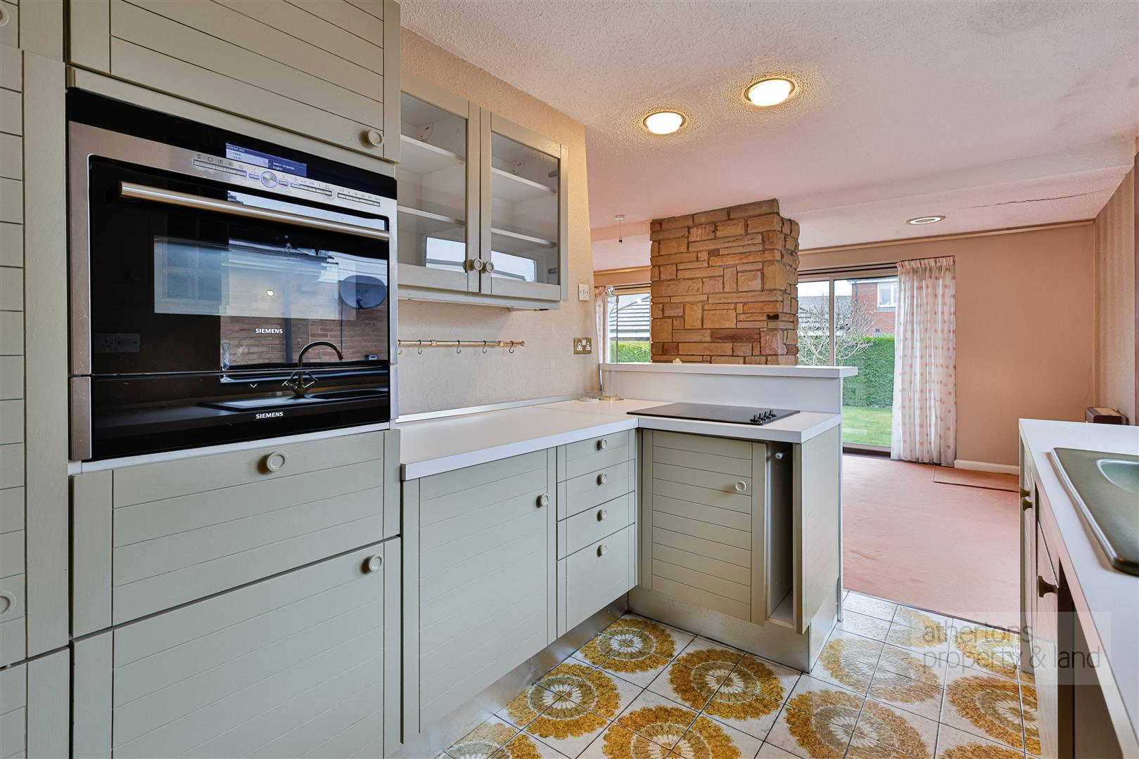The open-plan lounge/dining space forms the heart of the home and is notably bright and spacious, arranged in an L-shape and enhanced by a rear extension. A striking feature stone fireplace with electric fire and a central stone supporting pillar reflect the property’s original era and add character to the room. Two sets of aluminium sliding double-glazed doors open to the rear and side, allowing for excellent natural light and direct access to the garden, creating a seamless connection between indoor and outdoor living. Open access leads into the kitchen.