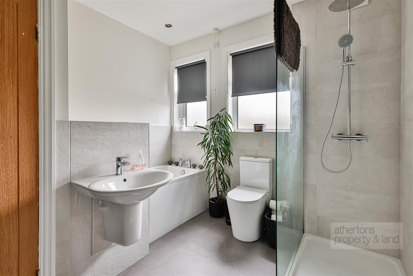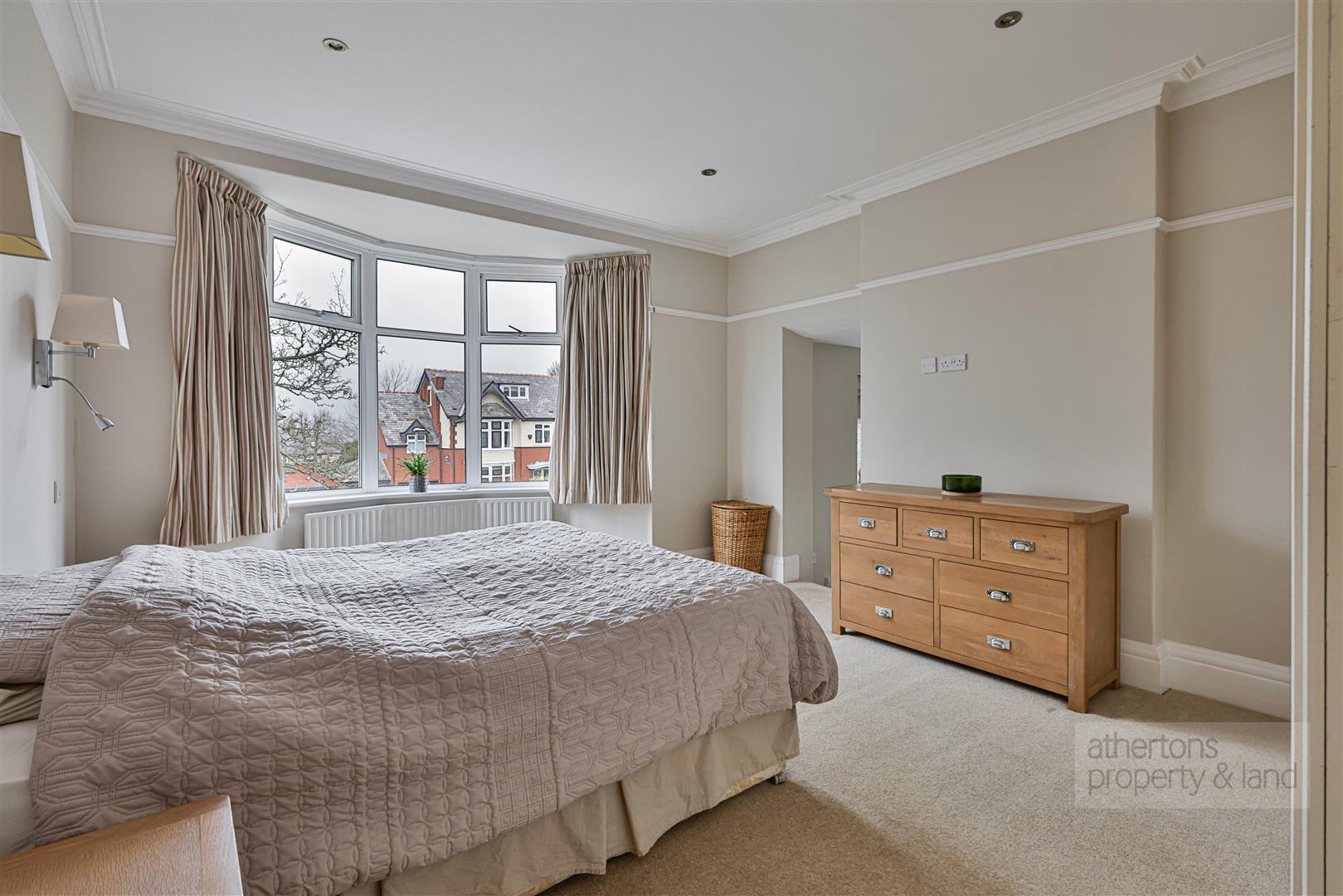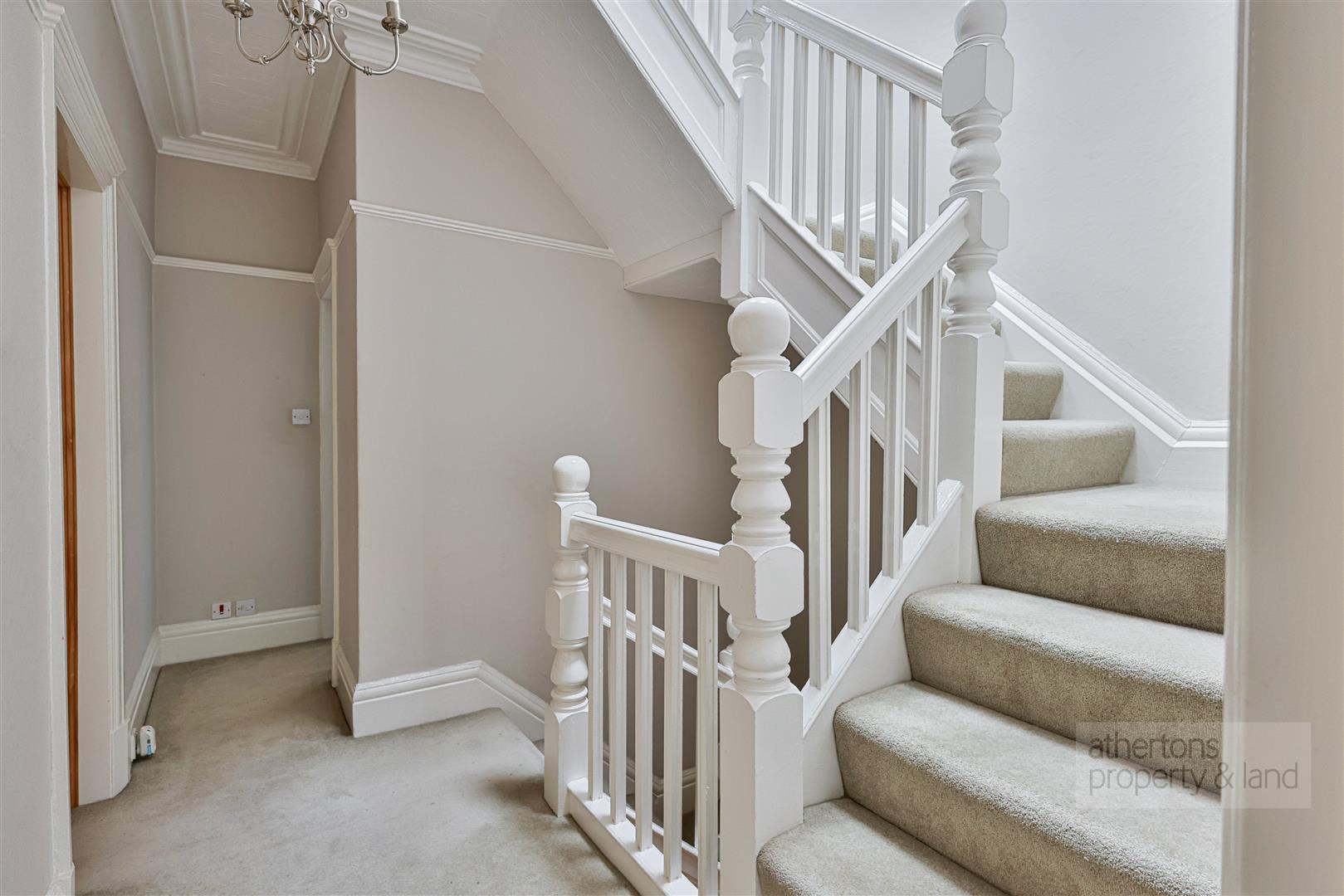 To the first floor, a spacious landing with a striking return staircase leads to the second floor. Bedroom five is a generous single room, while the family bathroom is fitted with a contemporary four-piece suite comprising panelled bath, wall-mounted wash basin, cubicle mains shower, WC, tiled elevations and flooring, and useful airing cupboards. Bedrooms two and three are substantial and beautifully proportioned double suites, mirror images of one another, each benefiting from fitted wardrobes, a walk-in dressing area, and stylish three-piece tiled en-suite shower rooms. The second floor hosts an impressive vaulted attic bedroom with fitted wardrobes and eaves storage, offering a wonderful sense of character and space. A small adjoining door leads to a separate office or snug area - an ideal teenage den, study space, or quiet retreat.