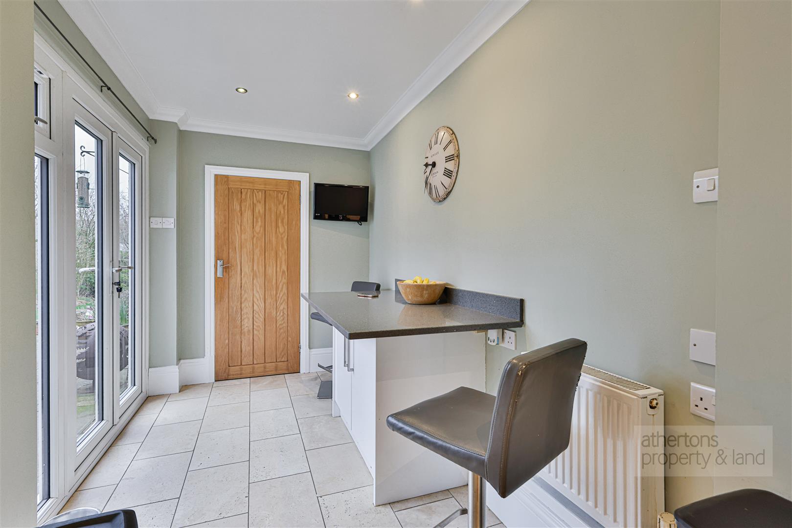 The main kitchen has been stylishly fitted with a range of base and eye-level units topped with Quartz work surfaces and matching splashbacks. Integrated Neff appliances include a fridge/freezer, double oven, dishwasher, hob and microwave, alongside a stainless steel sink and tiled flooring. A central Quartz island with breakfast bar provides additional preparation and seating space, while French doors and open access to a breakfast area enhance the sociable layout and outlook to the garden beyond. A well-equipped utility room offers additional base units, plumbing for washer and dryer, useful storage, and access to a two-piece ground floor WC.