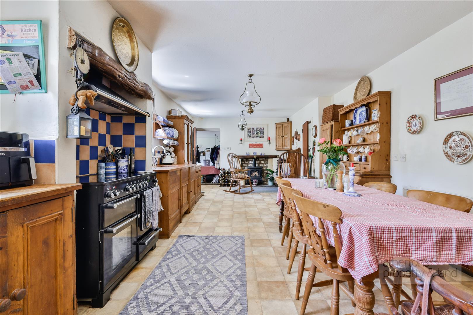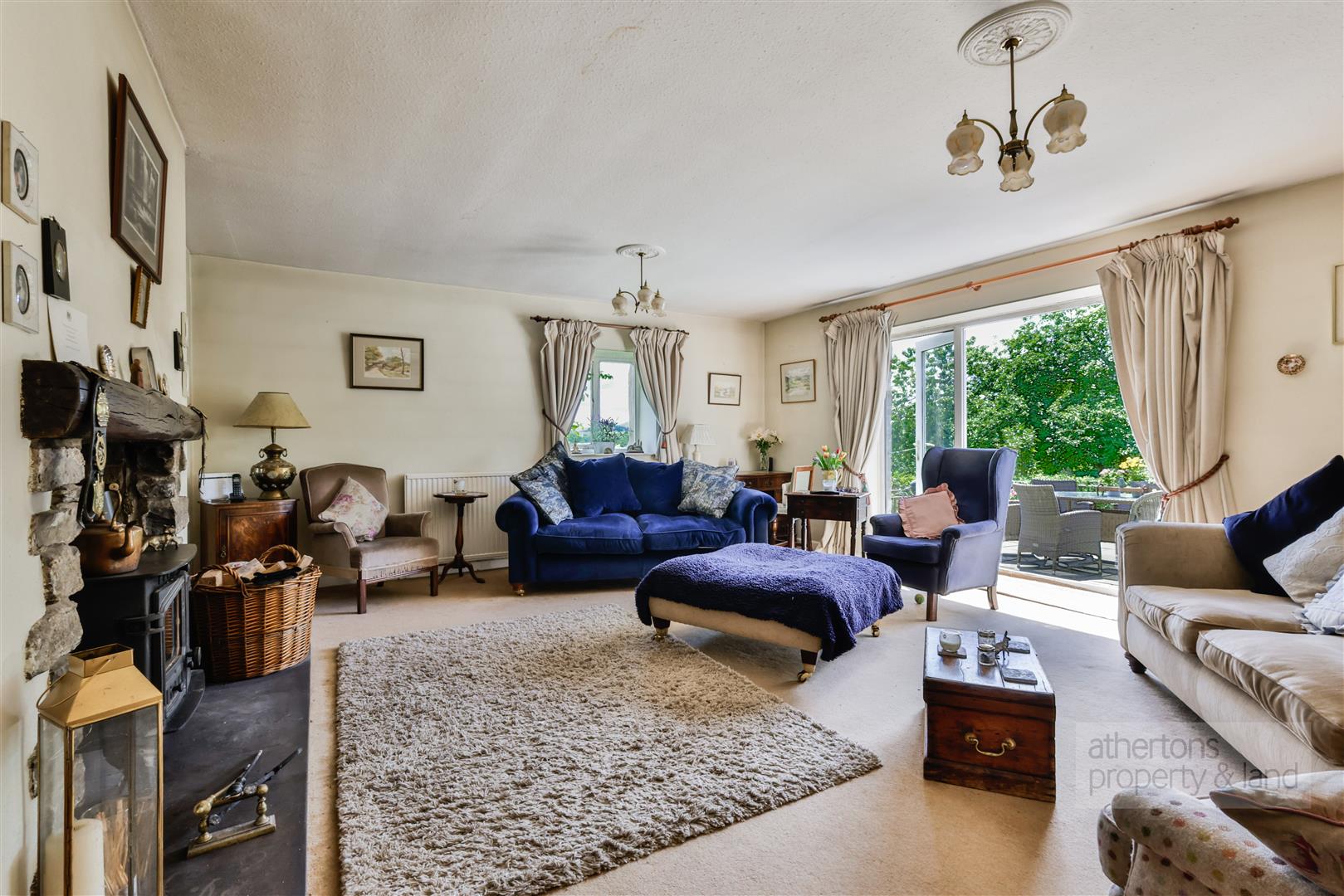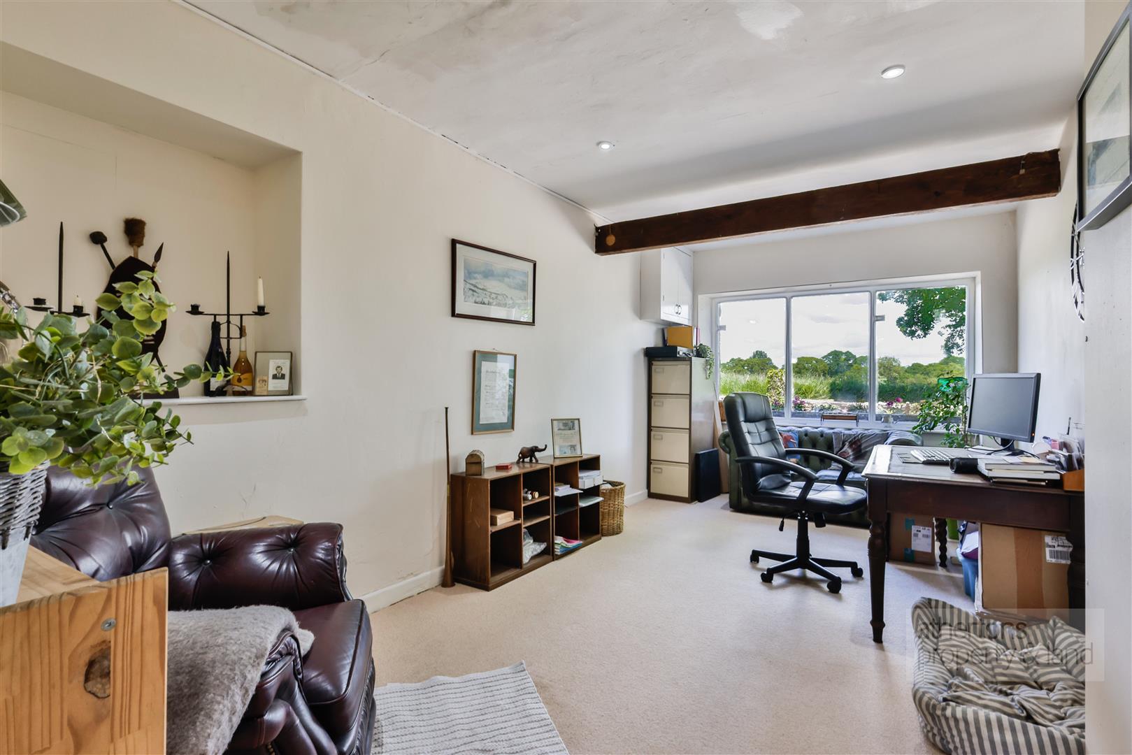 At the heart of the home, the kitchen/diner features traditional shaker-style cabinetry, maple worktops, and a Rangemaster induction hob and four-drawer oven. A feature stone fireplace, integrated dishwasher, and ample space for dining complete this welcoming, functional space—ready to be re-imagined. Also on the ground floor, a large office with an expansive picture window is flooded with natural light and would make an ideal creative studio or work-from-home hub. A children’s playroom, which could also serve as a second office or snug, adds to the home's flexibility. A generously sized utility room provides further practicality, with worktops, plumbing for laundry appliances, and internal access to the integral double garage with electric up-and-over door and rear workshop area.