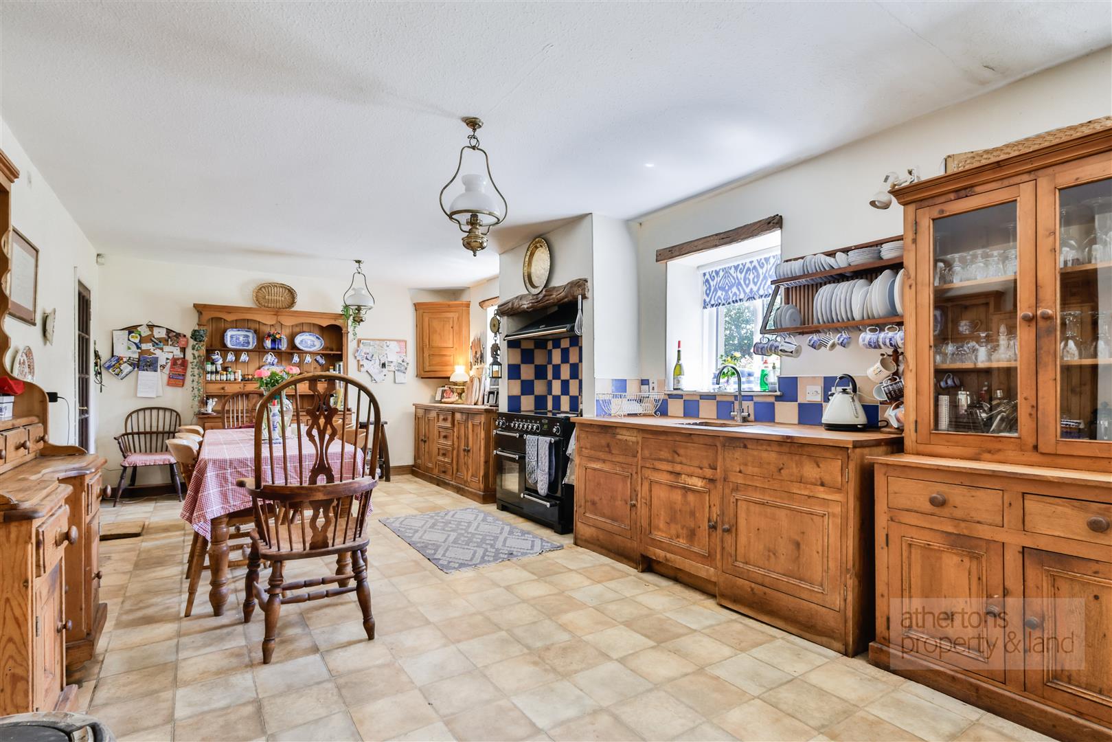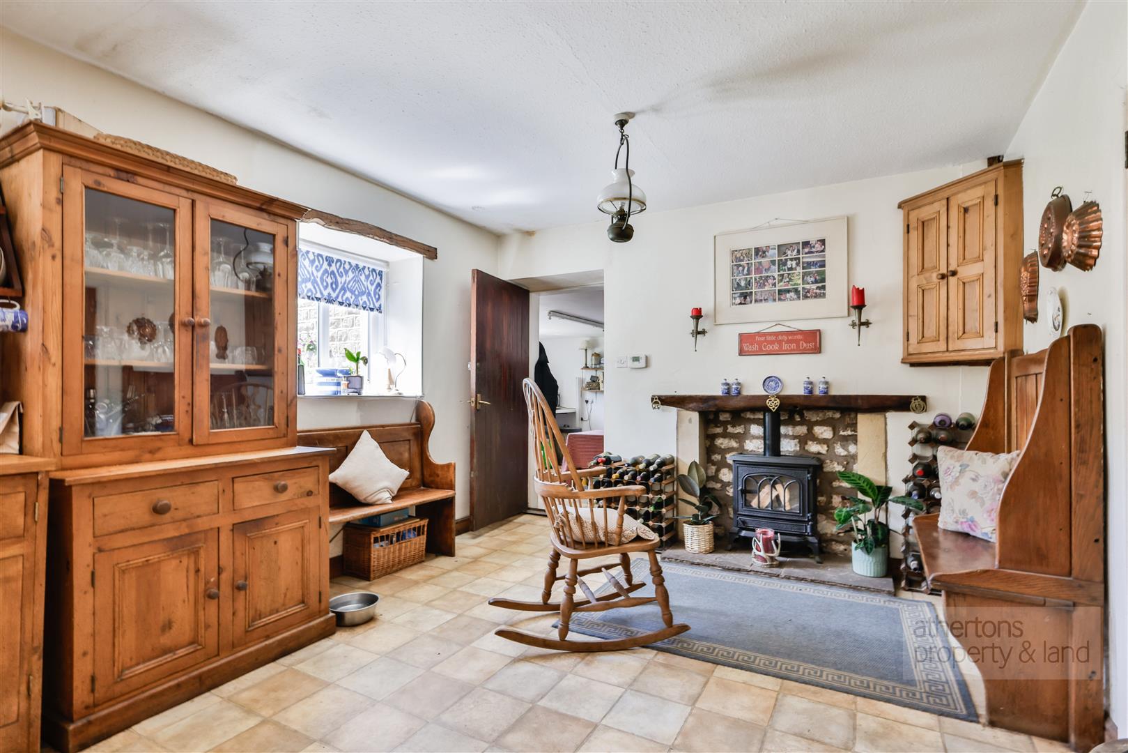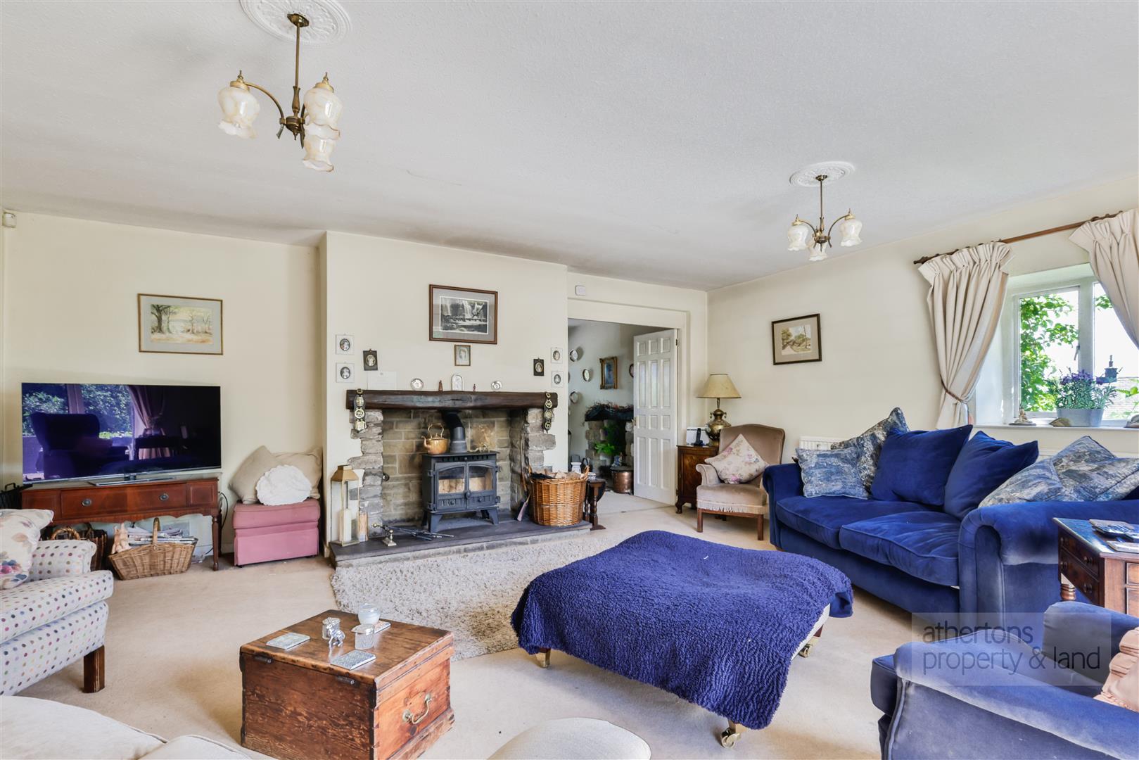 Stepping inside, the entrance vestibule opens into a generous L-shaped hallway, complete with cloakroom WC and stairs rising to the first floor. The ground floor flows through a series of well-proportioned reception rooms, each framing spectacular rural views from every window—each one resembling a landscape painting. The dining room, with a central fireplace and French doors, leads seamlessly into the living room, a warm and characterful space anchored by a large stone fireplace with a log-burning stove. French doors open onto the rear garden, while a side window perfectly frames Pendle Hill in the distance.