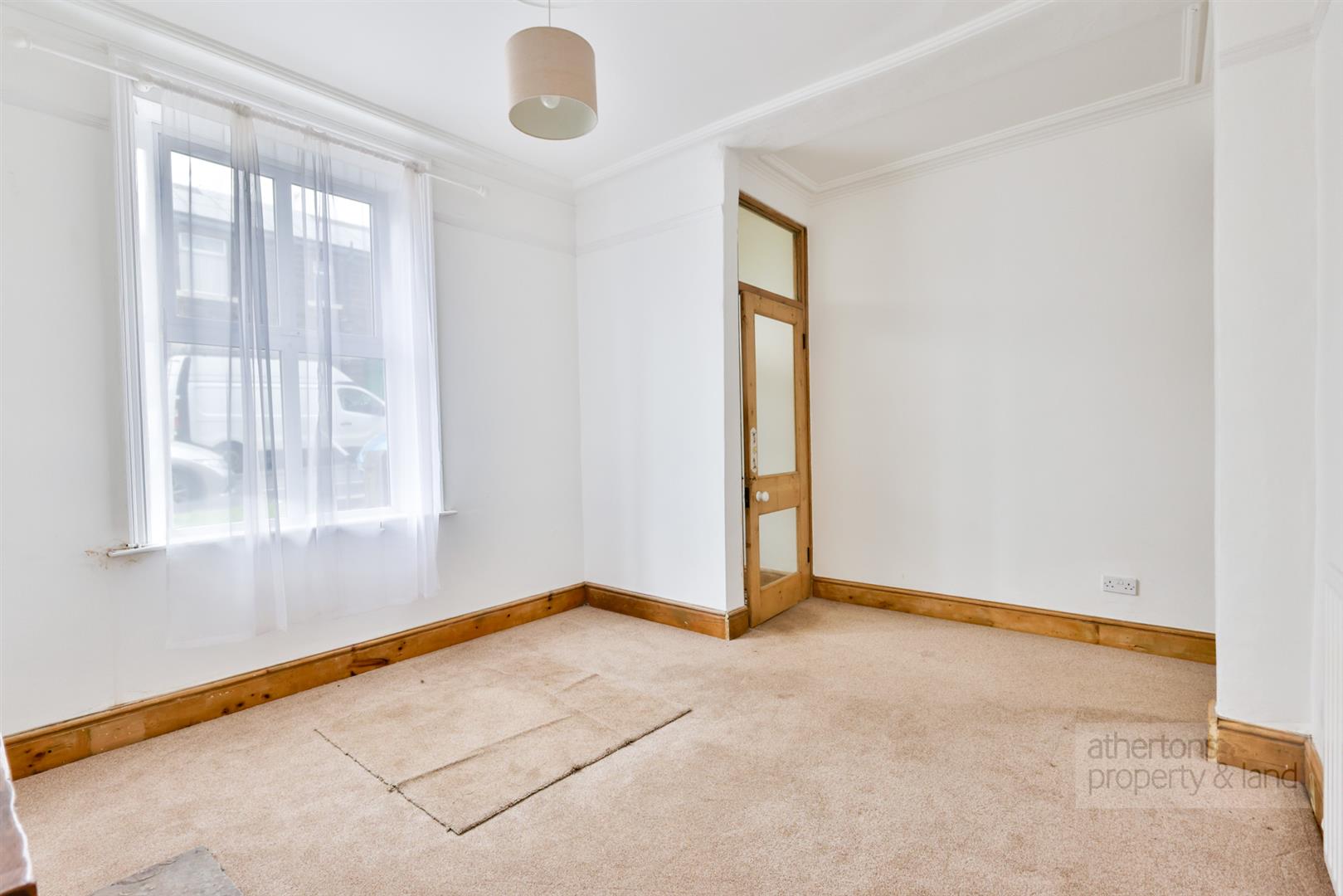 The ground floor opens with a welcoming vestibule, retaining its original tiled floor, which leads into a generous lounge. This inviting room is centred around a feature open fire with stone surround and hearth, providing both warmth and character.