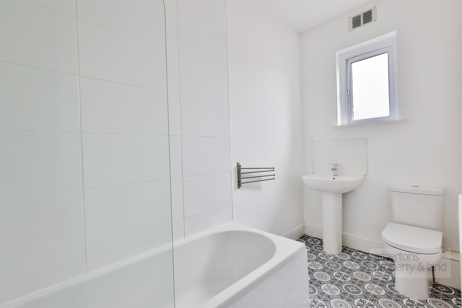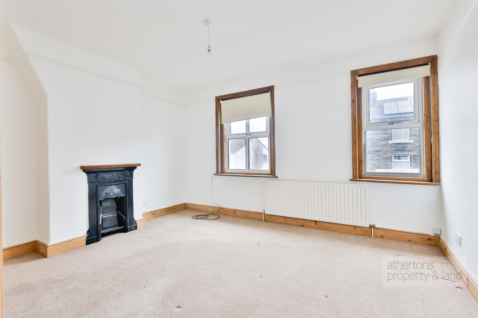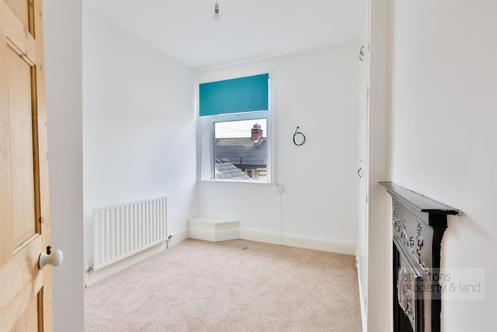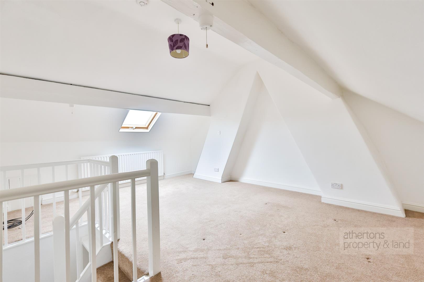 On the first floor, there are two well-sized bedrooms: one large, spacious double and another with fitted wardrobe space, along with a three-piece house bathroom finished with a panelled bath, tiled elevations, wash basin and WC. From the landing, a U-shaped staircase rises to a spacious attic bedroom, providing excellent flexibility as a third bedroom, home office, or hobby space, complete with vaulted ceiling and eaves storage.