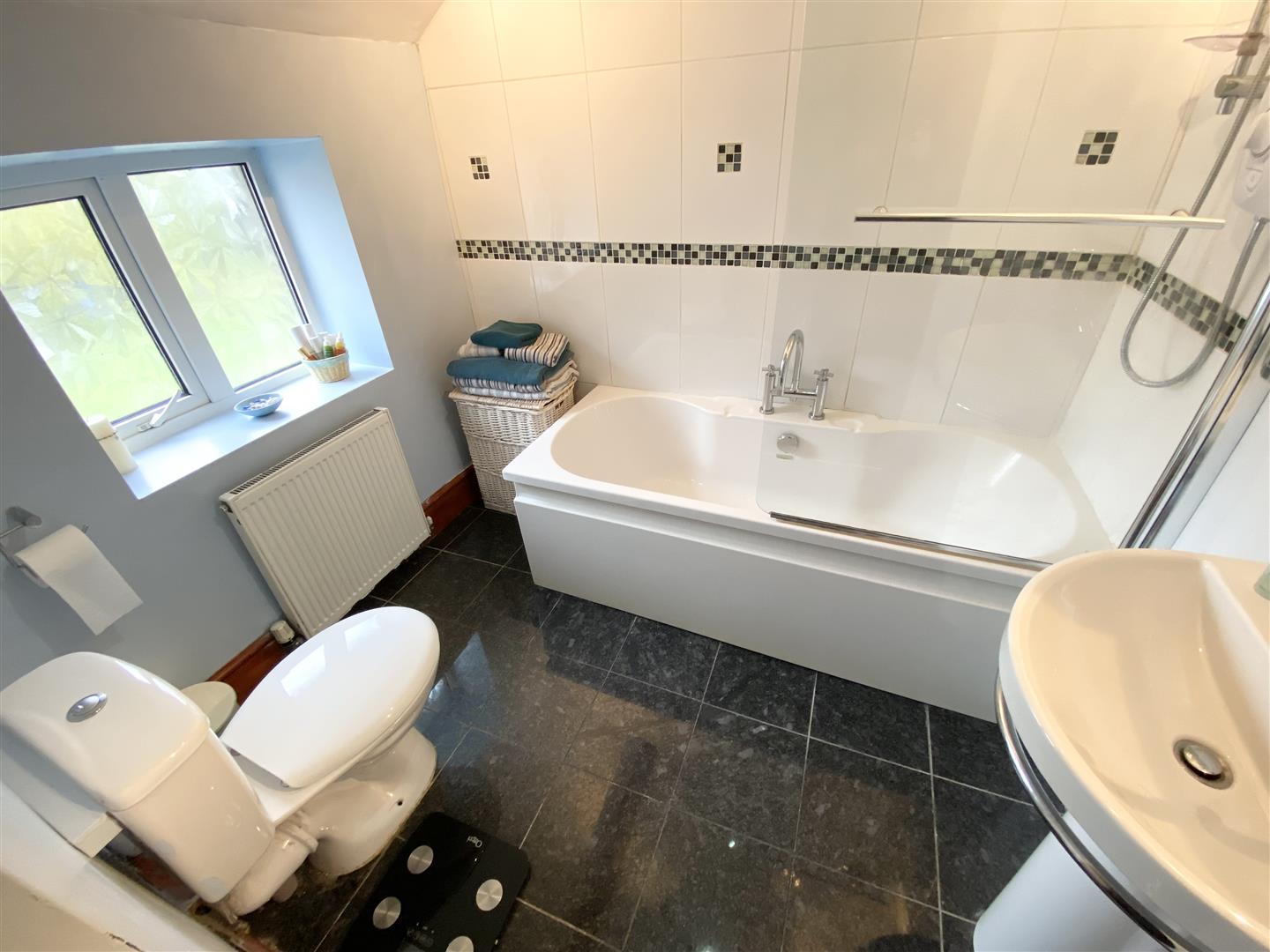 A modern 3 piece suite in white comprising a WC, wash hand basin and bath with electric shower over. A central heating radiator, double glazed window to the rear and tiled floor.
