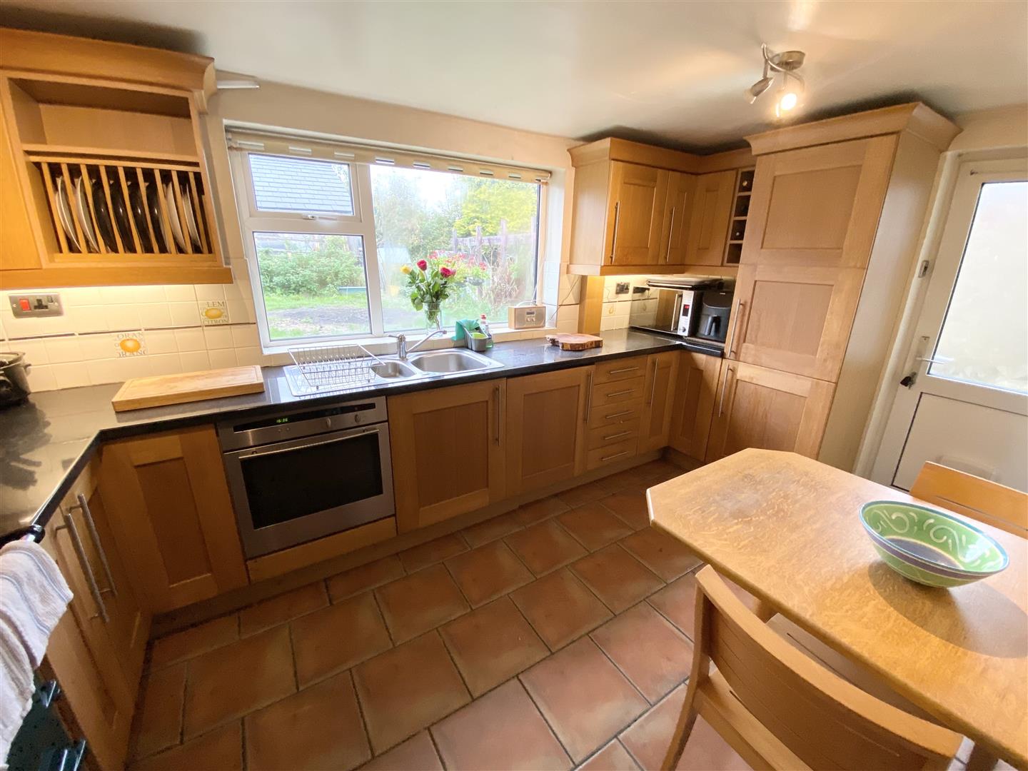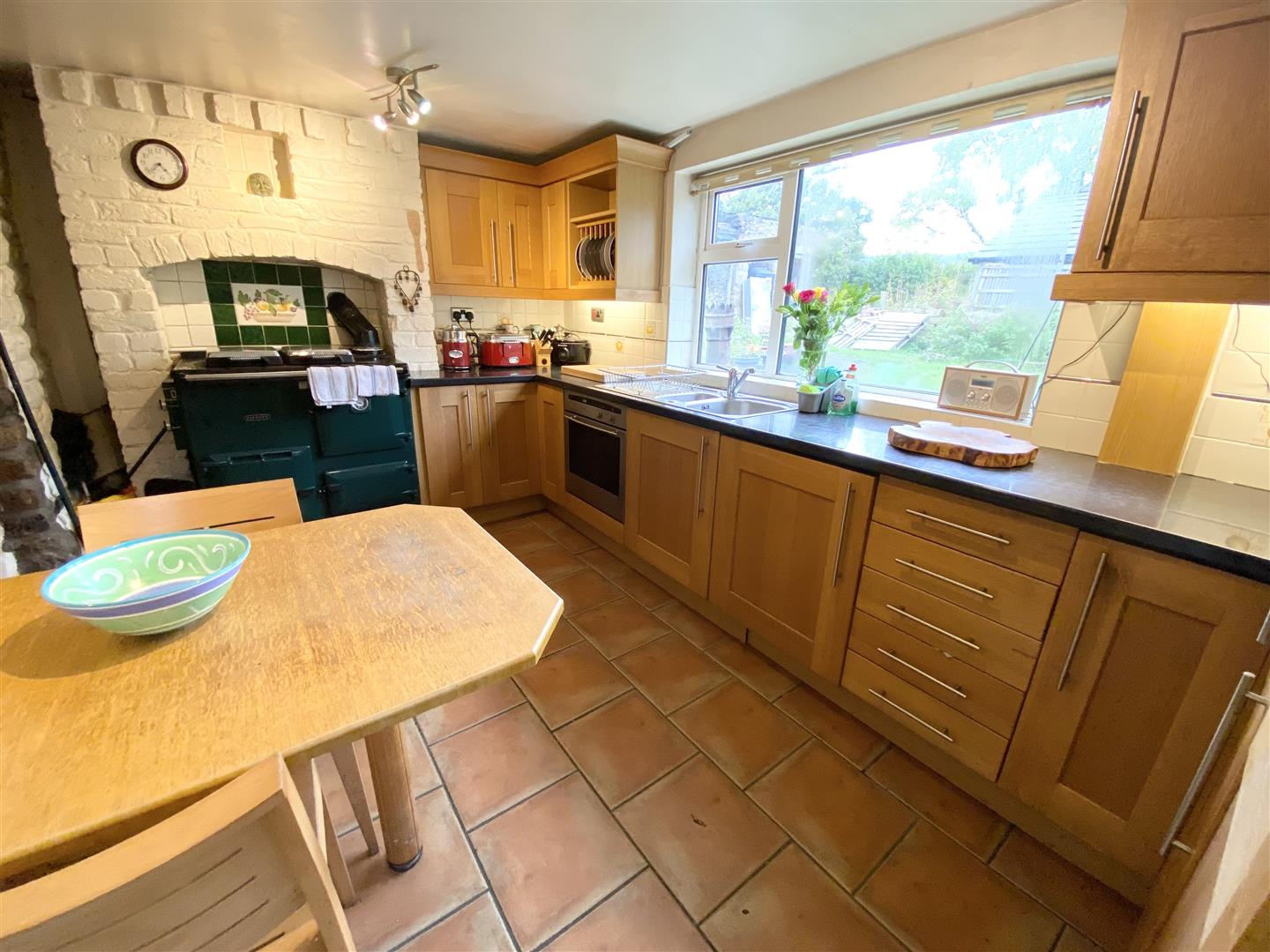 A modern fitted kitchen with a range of wall and base units with complementing work tops over. There is an oil fired Rayburn oven and 2 ring hob, an electric oven and a built in fridge and freezer. There is a double glazed window and door to rear.