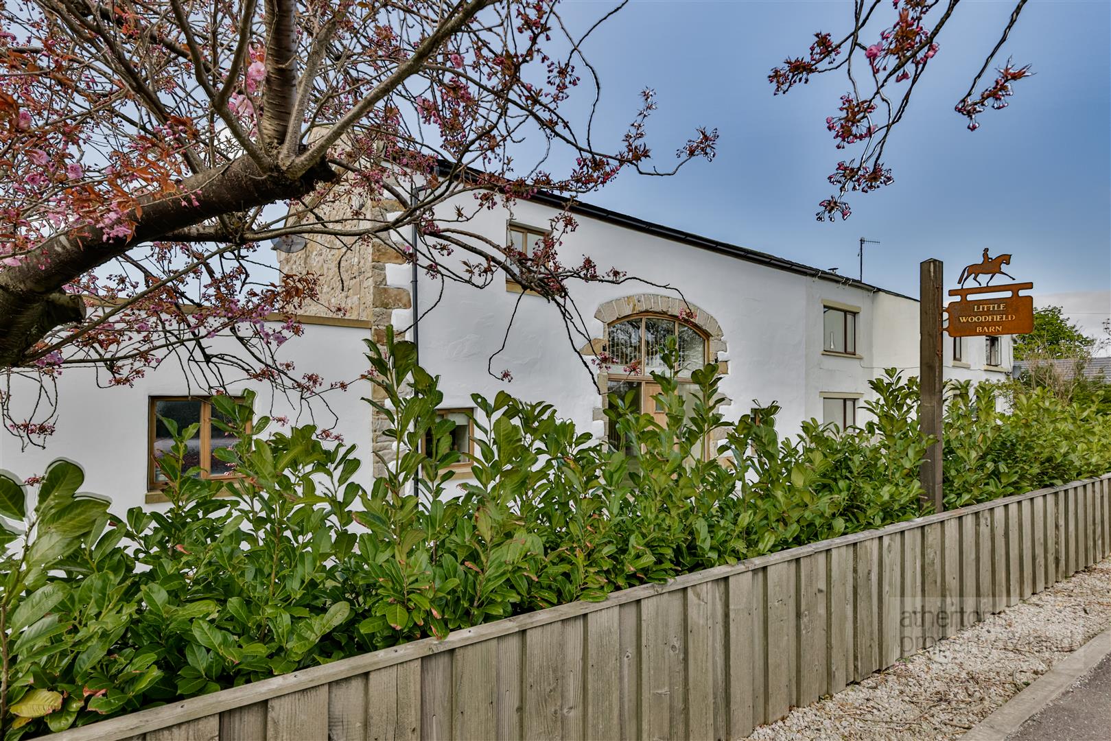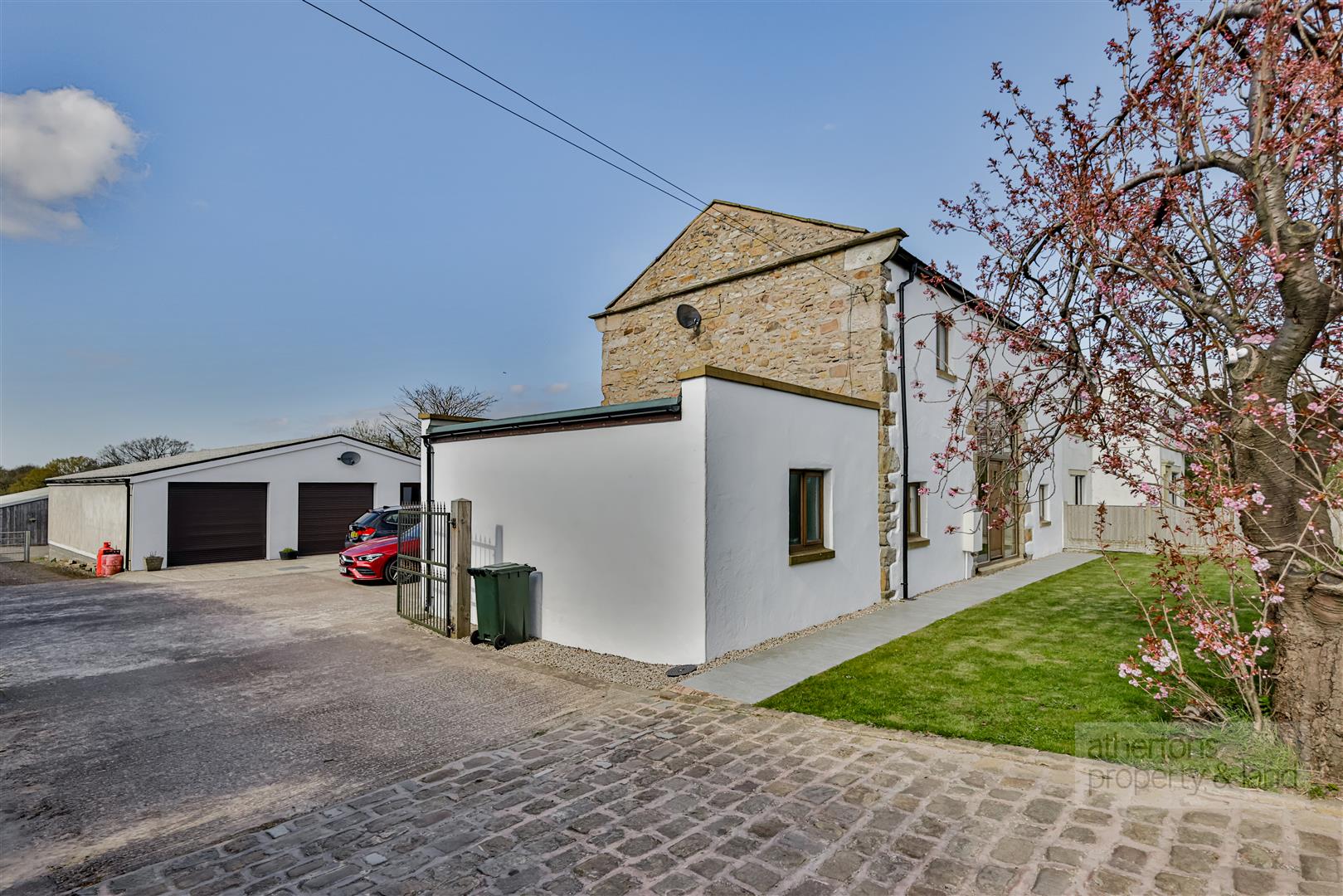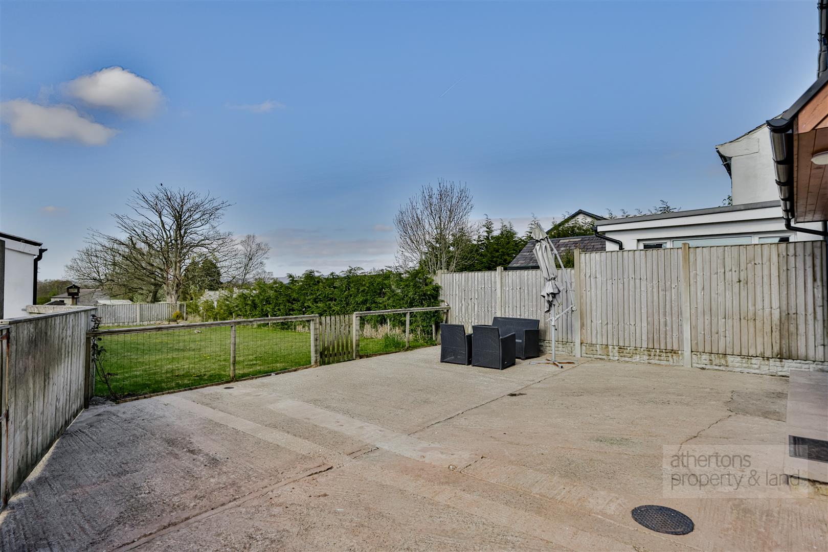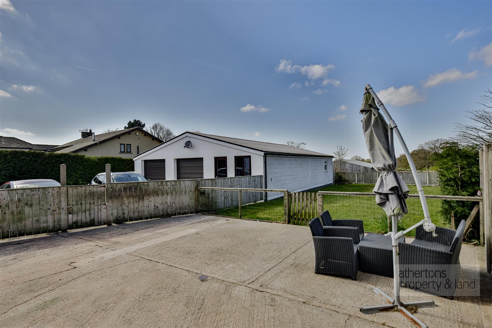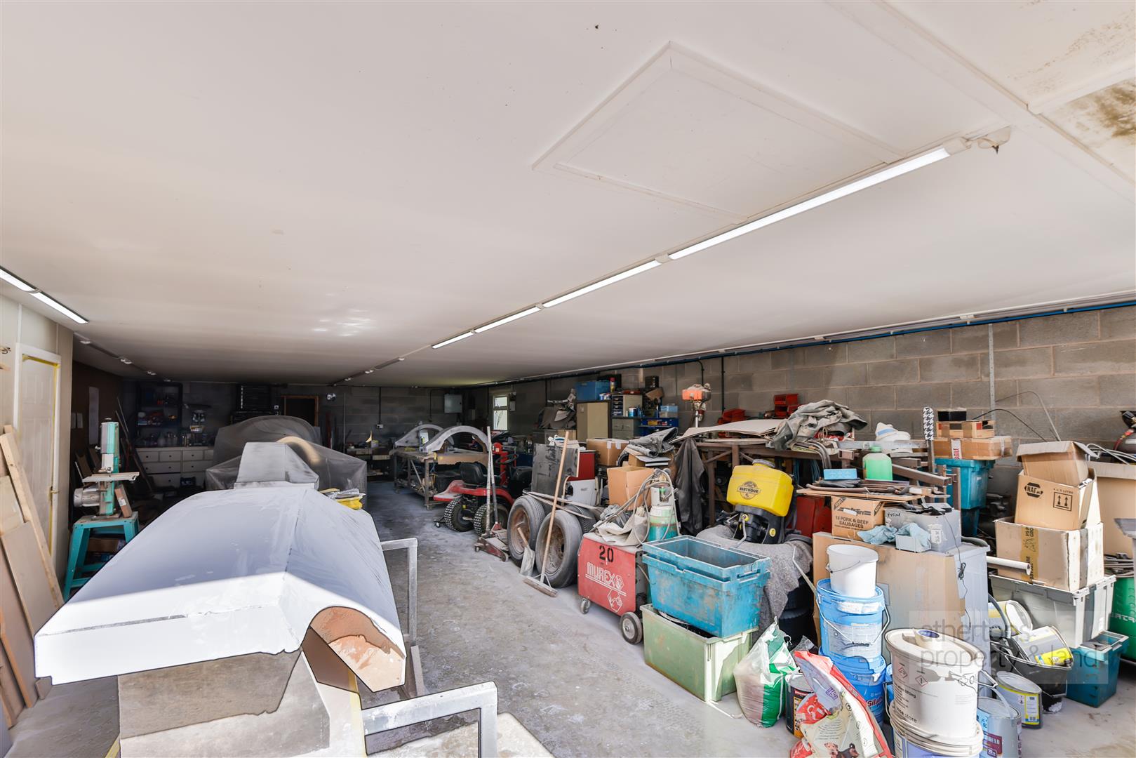 Adjoining the property is a substantial single garage, currently used as a workshop, with the potential to be converted into further internal accommodation. Constructed with robust footings suitable for a two-storey extension, this space offers significant development potential (subject to the necessary consents). The property is approached via a generous driveway providing ample parking and turning space. The front garden is attractively landscaped, while to the rear, extensive paved seating areas and a large lawned garden are bordered by mature trees and hedging, affording stunning open views.