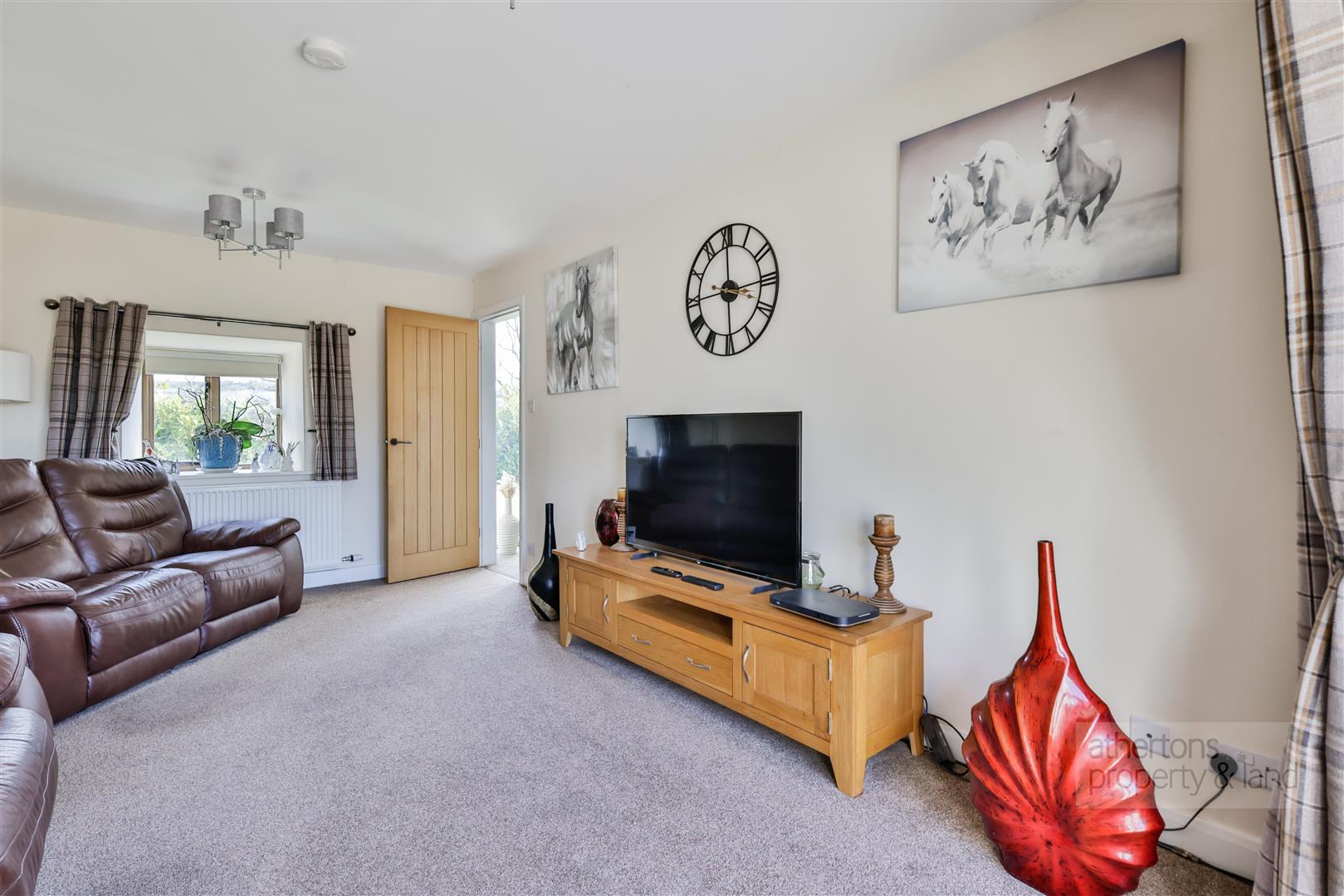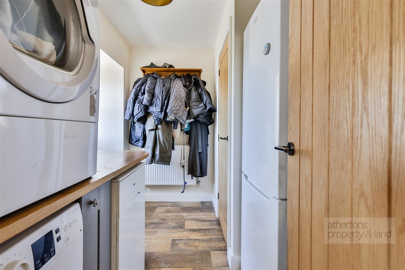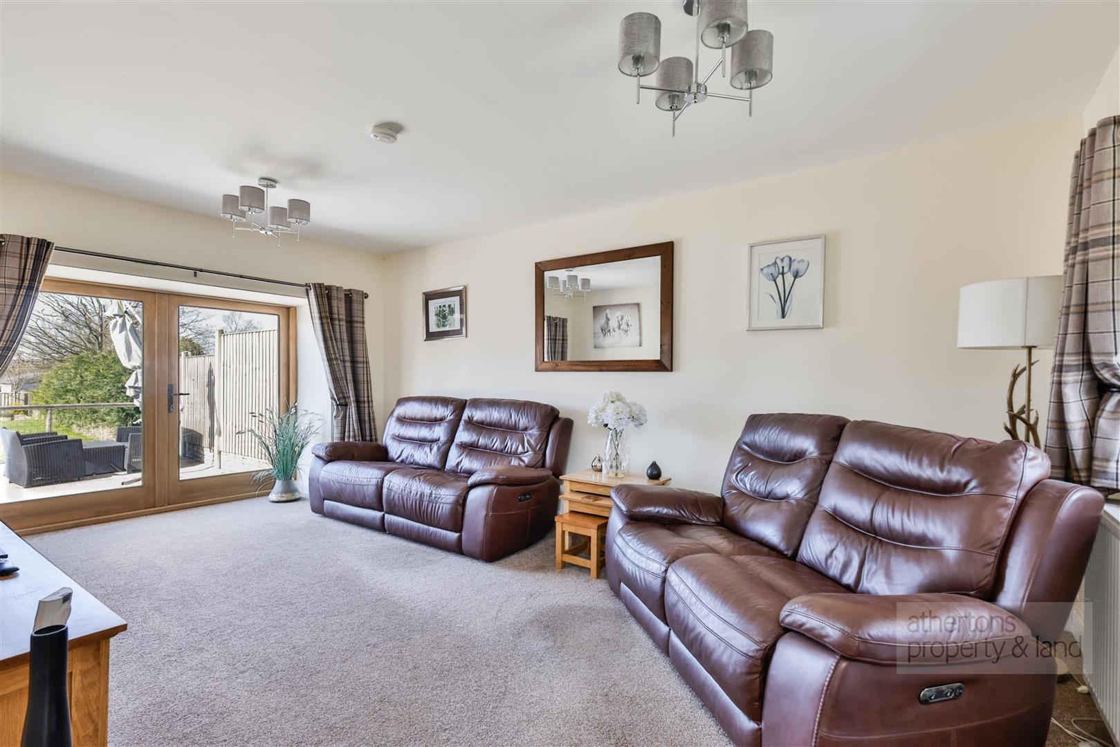 There is ample space for a family dining table, with direct access into the utility room, which houses base units, plumbing for a washing machine and dryer, a Worcester Bosch combination boiler, and external access to the rear. A convenient two-piece cloakroom is accessed from the utility. The generous family lounge spans the full depth of the property, flooded with natural light and featuring French doors that open onto the rear garden.
