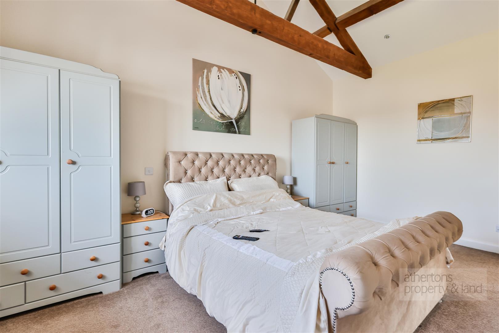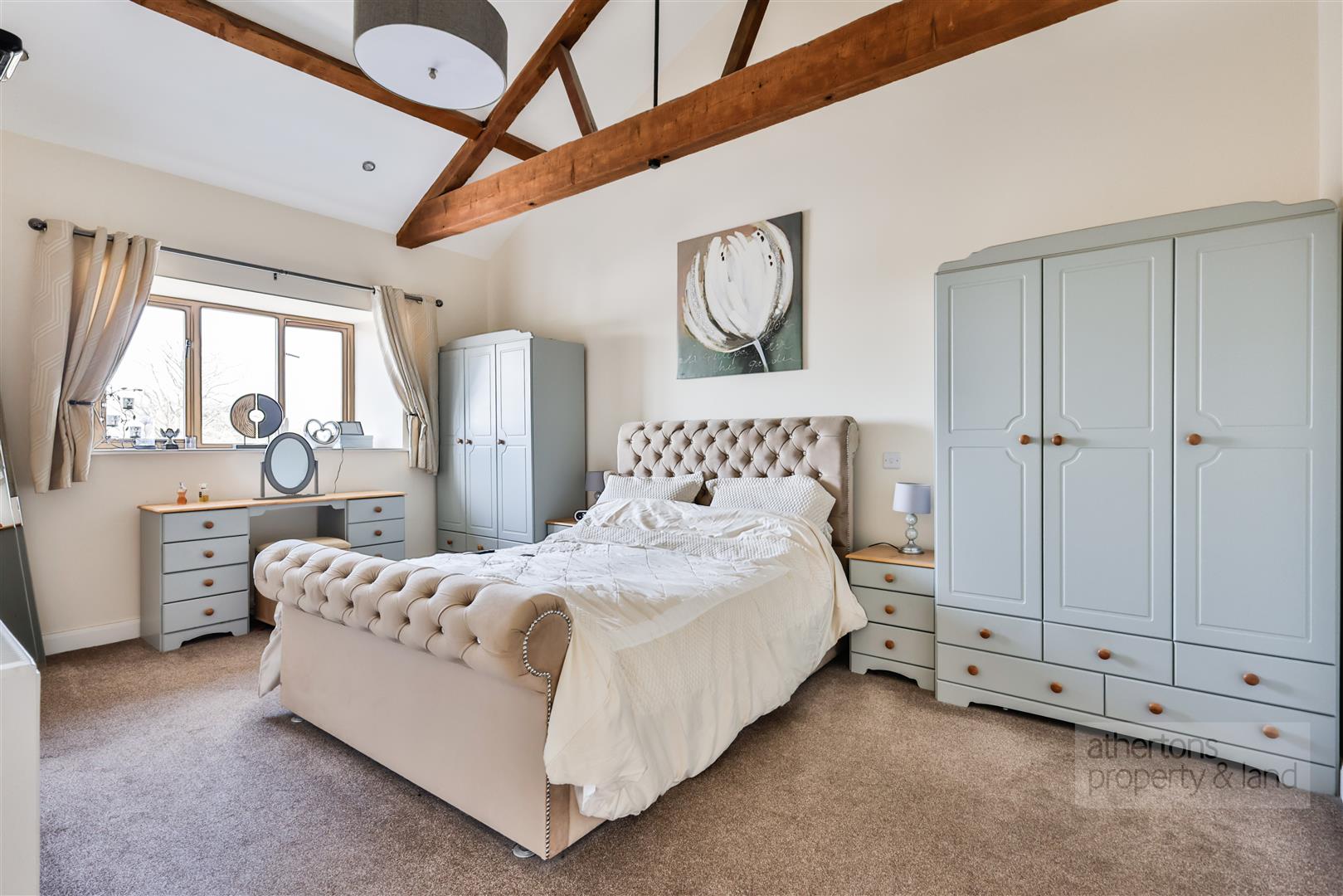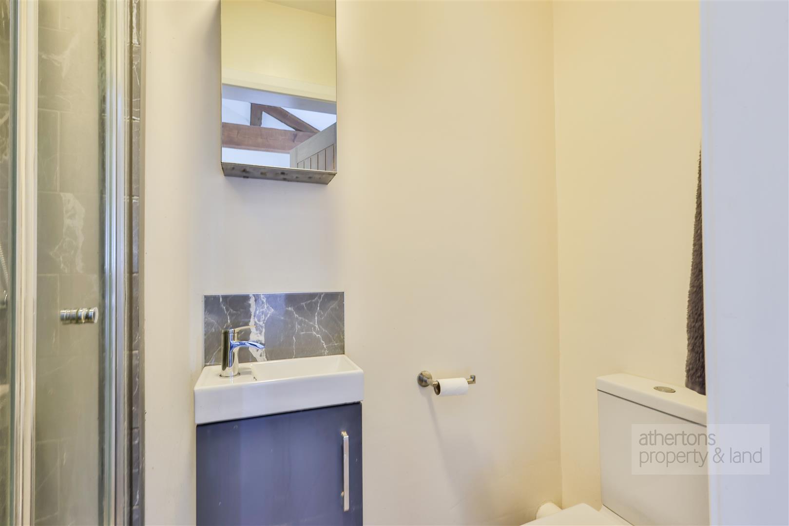 Upstairs, the accommodation comprises three double bedrooms. The principal bedroom enjoys a vaulted ceiling with exposed King Post Truss and stretches the full length of the house. It is served by a contemporary three-piece en-suite shower room. Bedrooms two and three are served by a stylish family bathroom, tastefully fitted with a P-shaped bath and shower over, dual-flush WC, and wash basin.