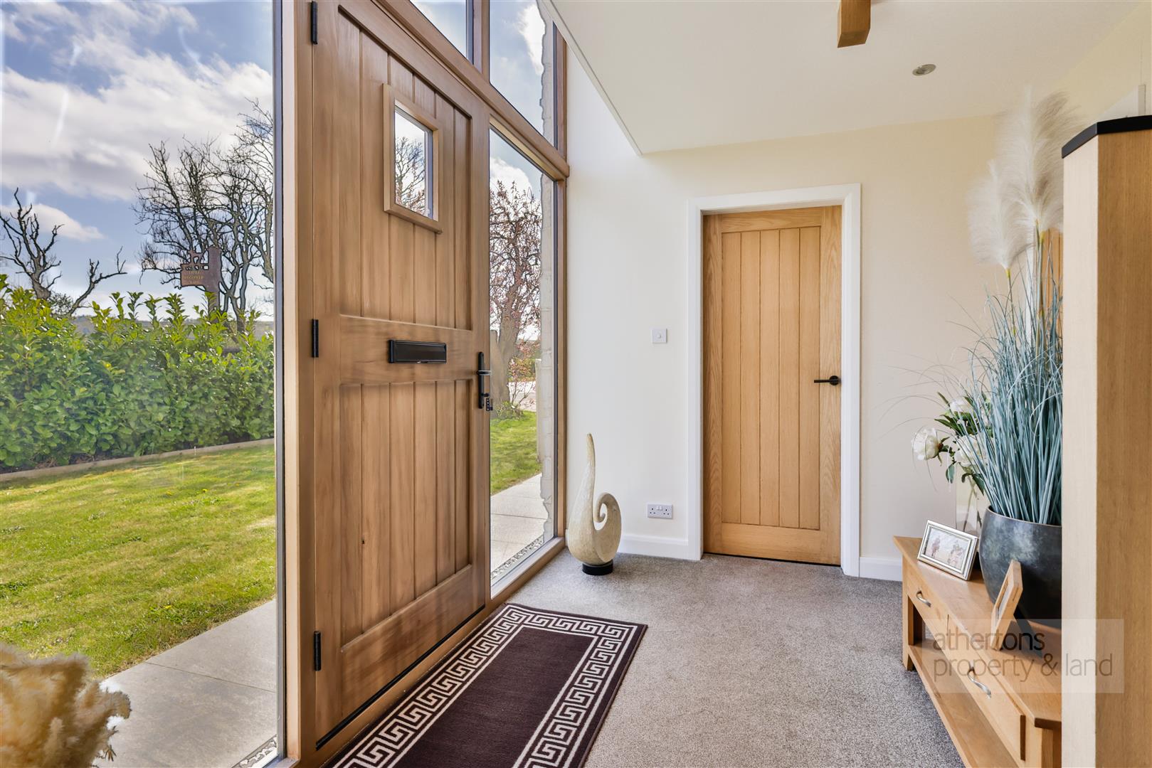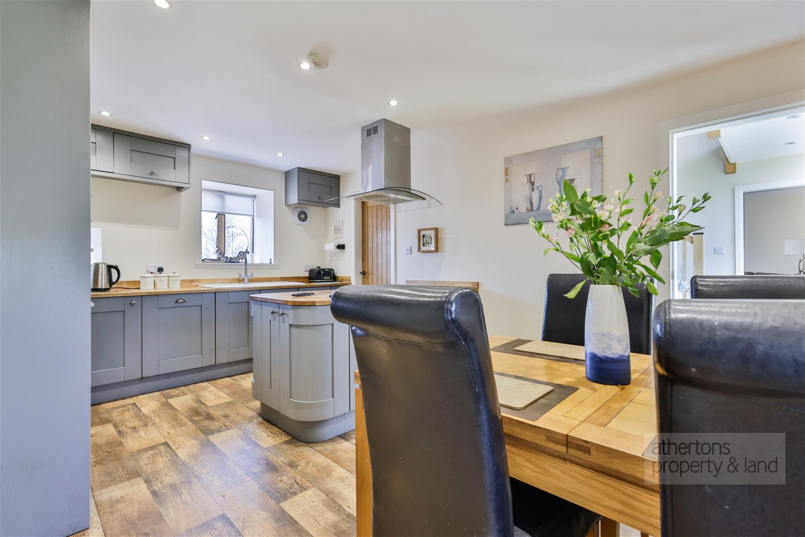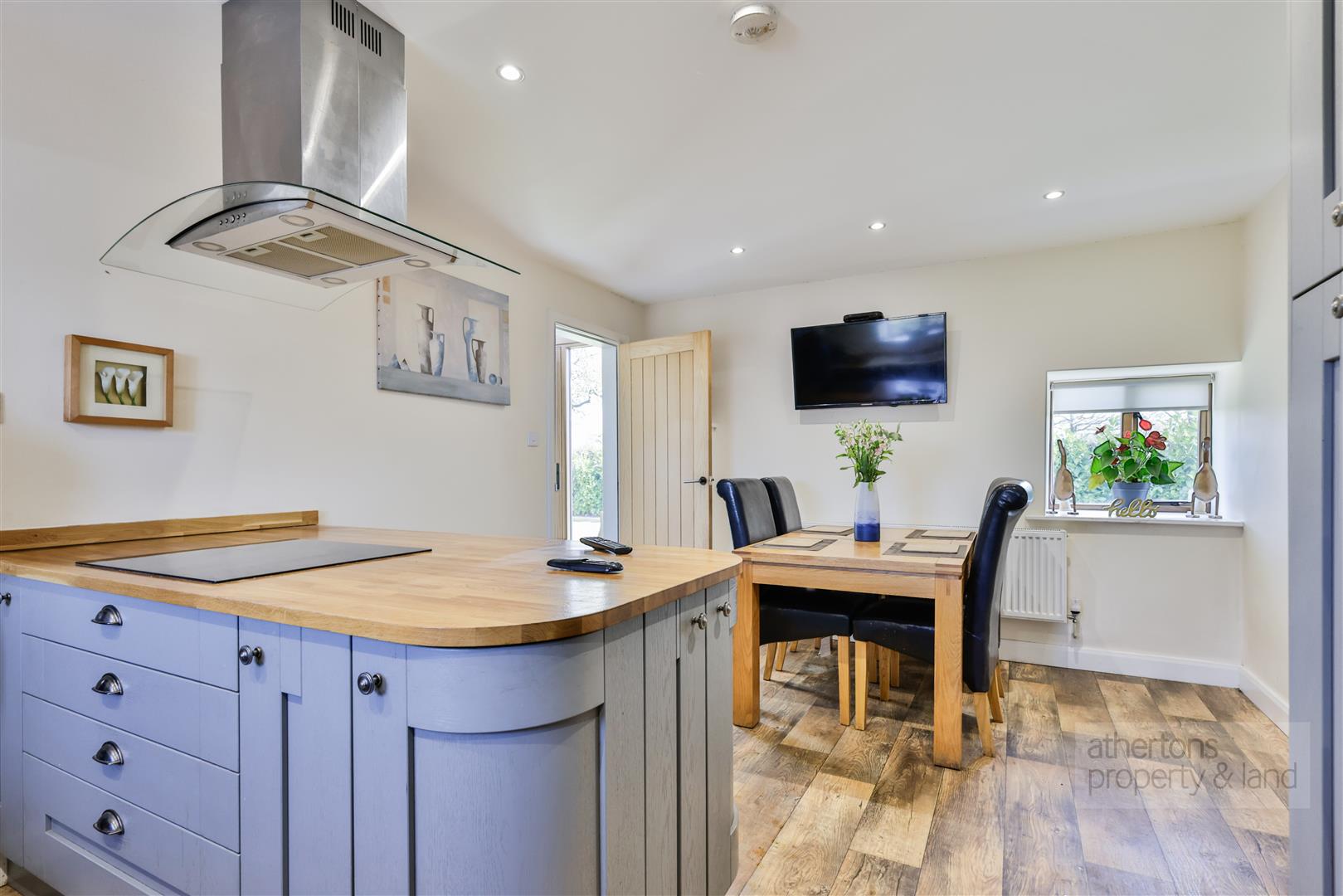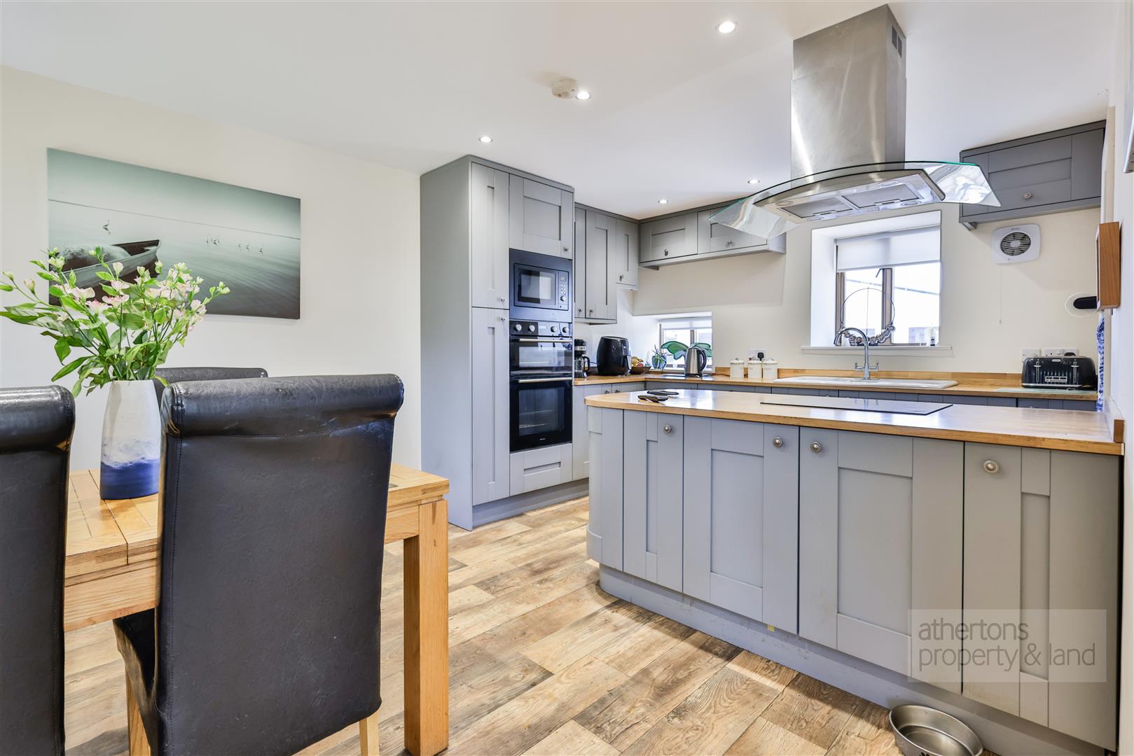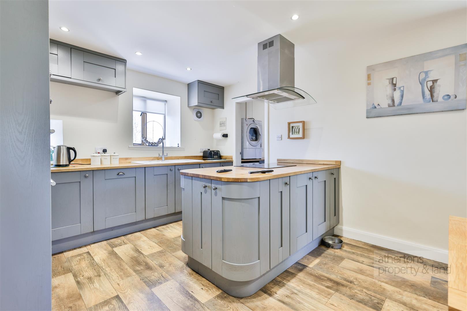 Finished to an impeccable standard, the principal residence blends traditional charm with modern convenience and provides well-proportioned living accommodation arranged over two floors. A welcoming vaulted entrance hallway, complete with a large understairs storage cupboard, leads into a spacious and light-filled kitchen/dining area. The kitchen is fitted with classic Shaker-style base and wall units, solid maple worktops, a central island with induction hob and extractor, dual ceramic sink with drainer, and integrated appliances including a fridge/freezer, dishwasher, double oven and microwave.
