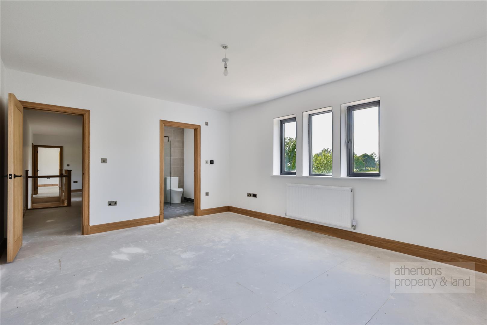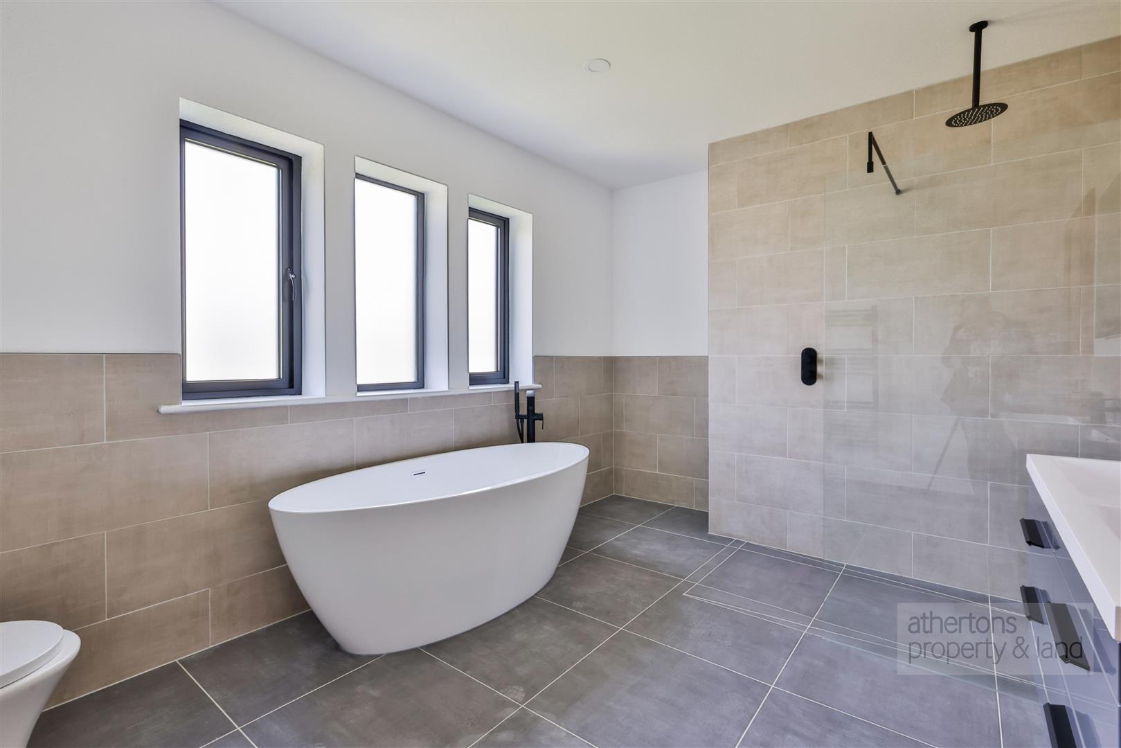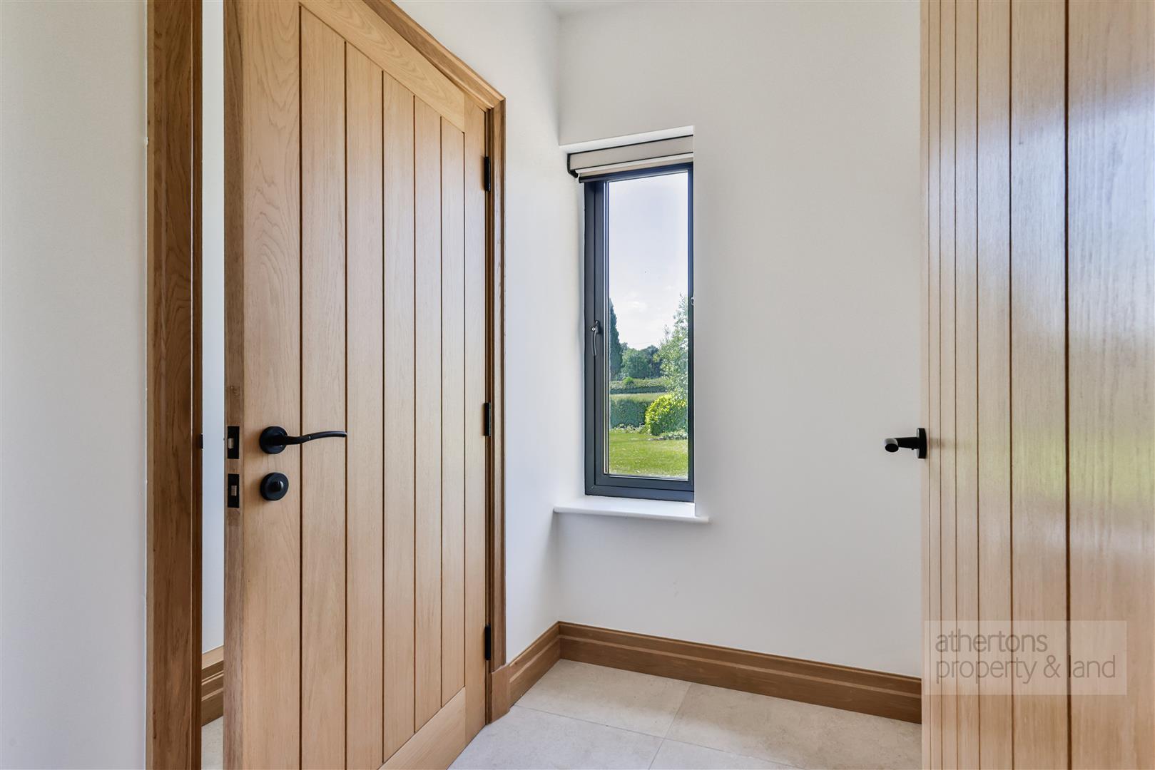 The first floor is equally impressive, with a spacious central landing giving access to five double bedrooms, all offering charming rural aspects. The principal suite benefits from a fitted dressing room and stylish tiled en suite shower room, while bedroom two also features an en suite. Bedrooms three and four are generous doubles with picturesque outlooks, and bedroom five includes a fitted dressing area with built-in wardrobes. A luxurious four-piece family bathroom completes the floor, featuring a freestanding bath, walk-in rainfall shower, and twin ‘his and hers’ sinks set in a floating vanity.