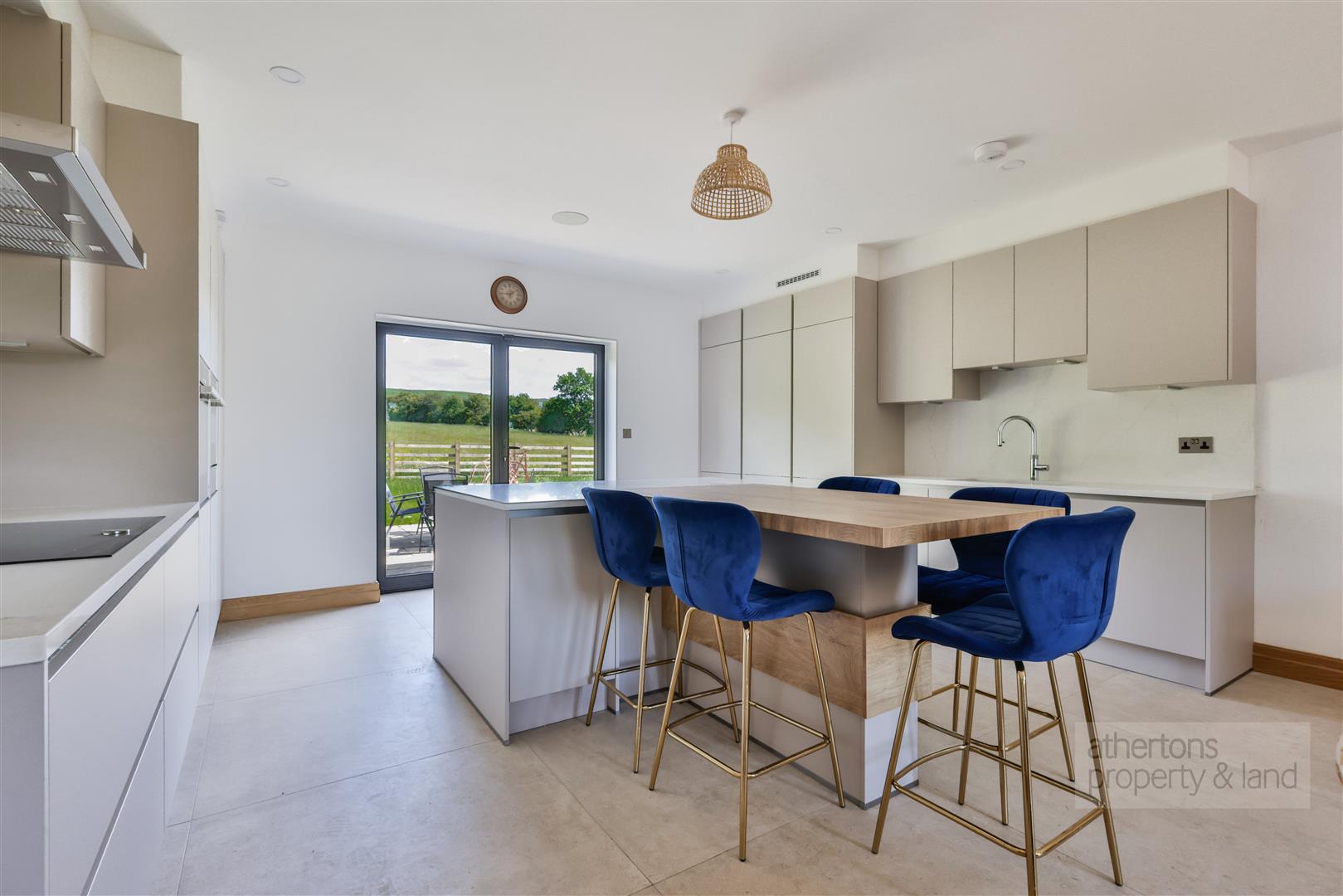 The generous internal layout includes five spacious double bedrooms, five reception rooms, and a spectacular open-plan kitchen/dining/living area equipped with a full suite of Neff integrated appliances, Corian work surfaces, and a central island with breakfast bar. A Quooker instant boiling water tap, media wall, and French doors opening onto the garden further elevate the space.