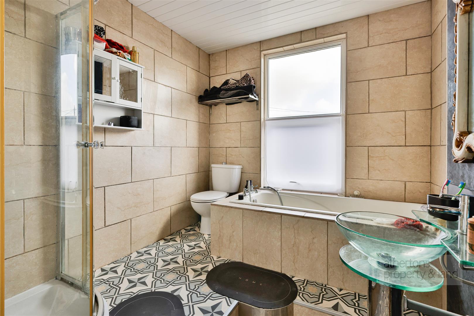 To the first floor, the landing offers further versatility with a storeroom/walk-in wardrobe area and access to an additional office/store housing the combination boiler. The accommodation comprises two well-proportioned double bedrooms, both with fitted wardrobes. The rear bedroom enjoys delightful long-range views towards Pendle Hill, while the front bedroom overlooks the nearby cricket club. The house bathroom is fitted with a four-piece suite, including a freestanding bath, corner shower, wash basin and WC.