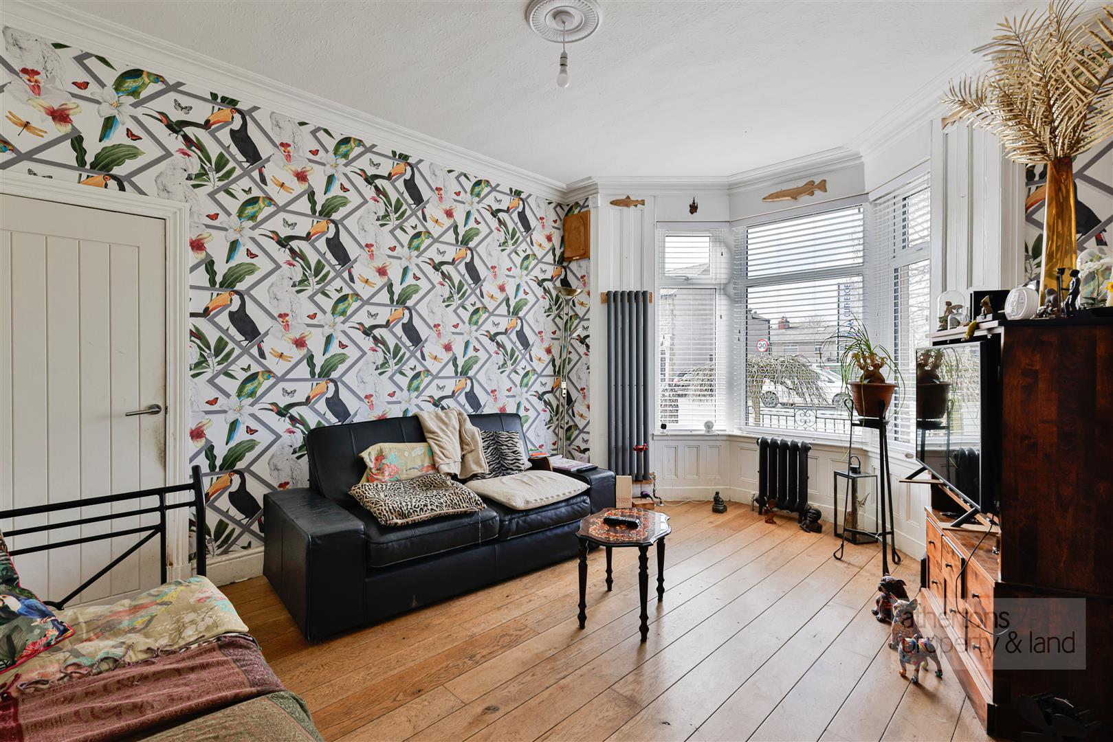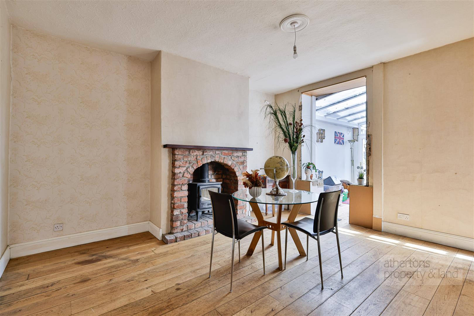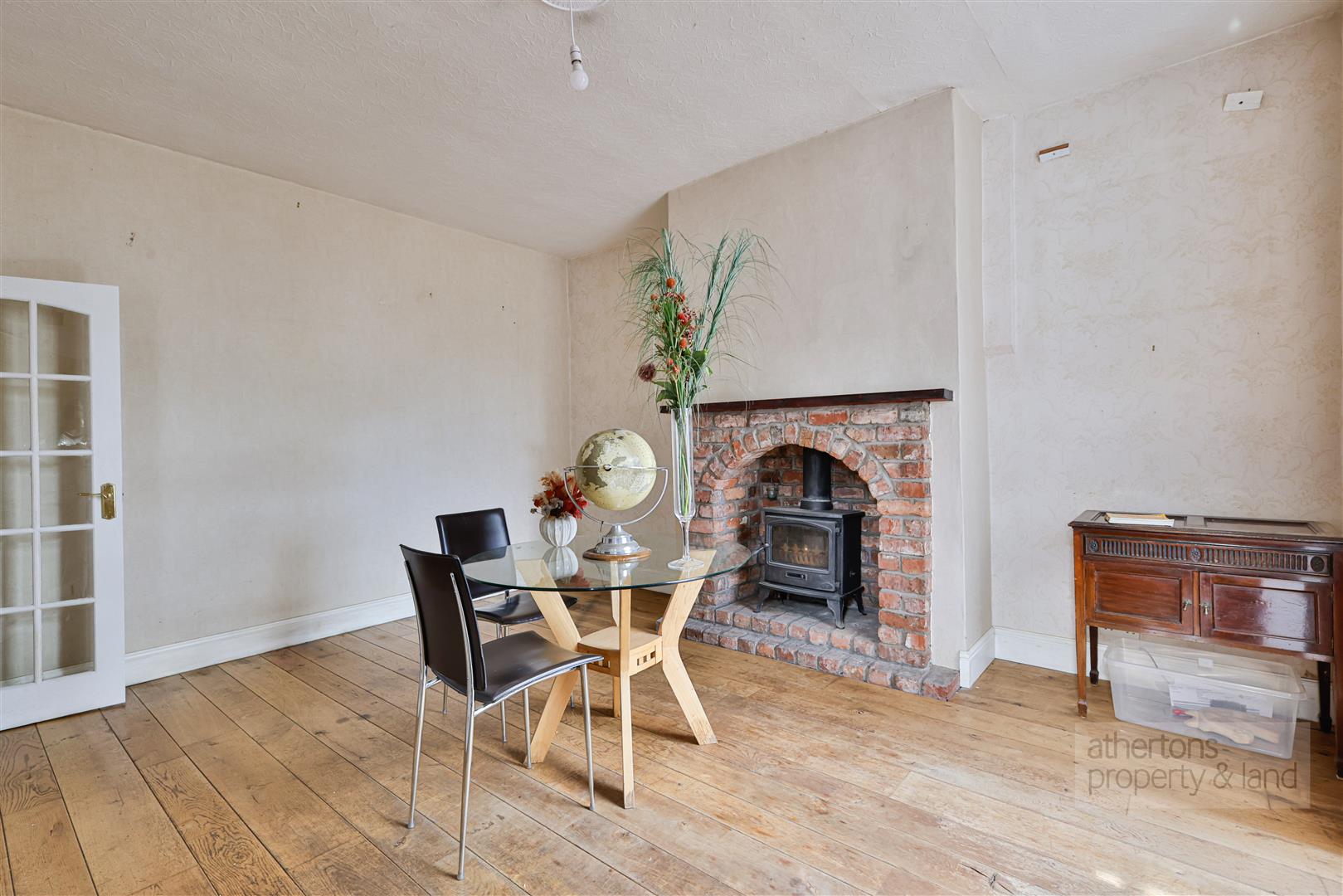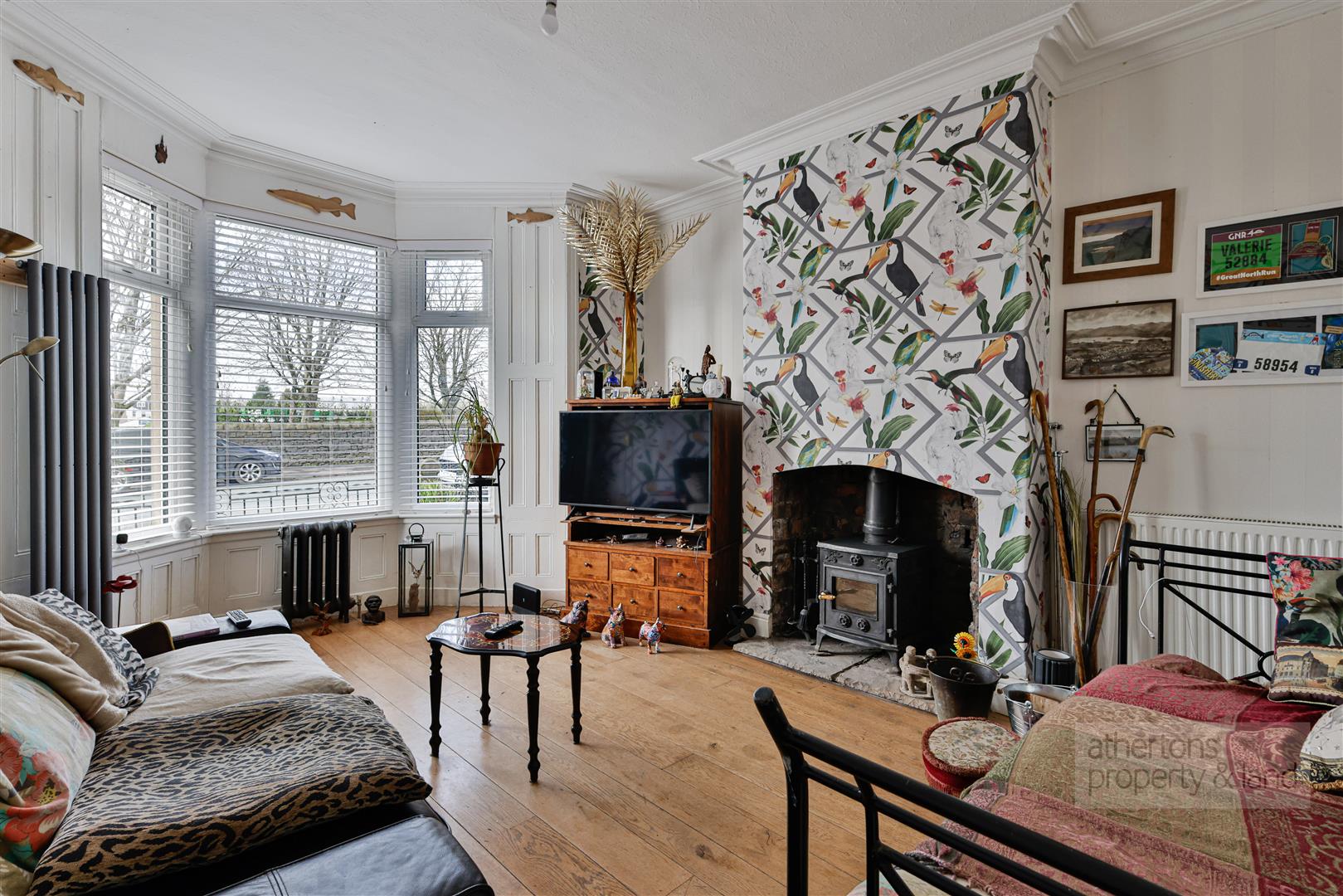 The property is approached via a garden-fronted forecourt, setting it back nicely from the street. Entry is via a welcoming porch, showcasing original tiled flooring, leading through to the main hallway with staircase access. To the front, the principal lounge is a warm and inviting space, enhanced by an oak floor and a striking stone and brick fireplace housing a multifuel burner, perfectly complementing the home’s period charm.