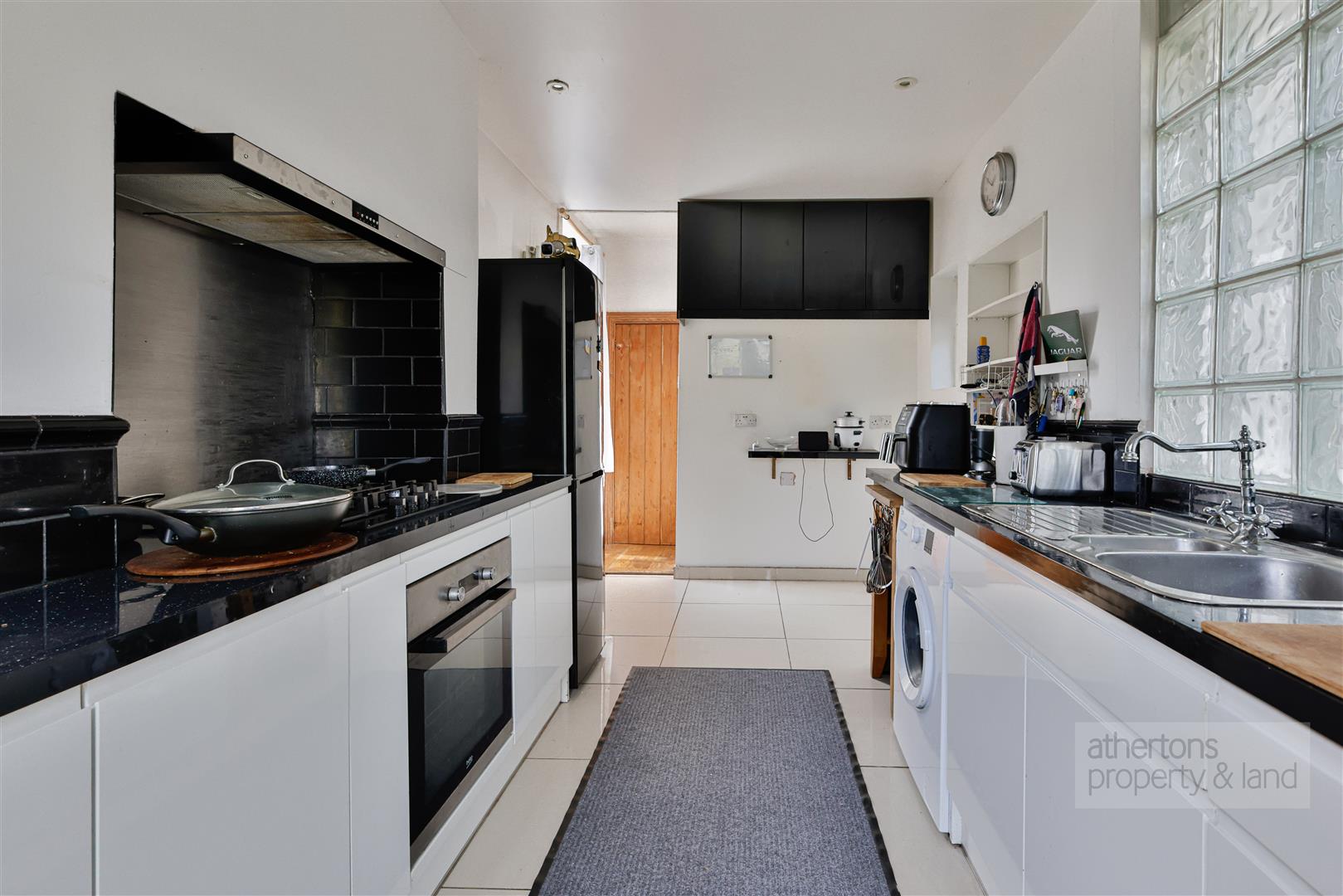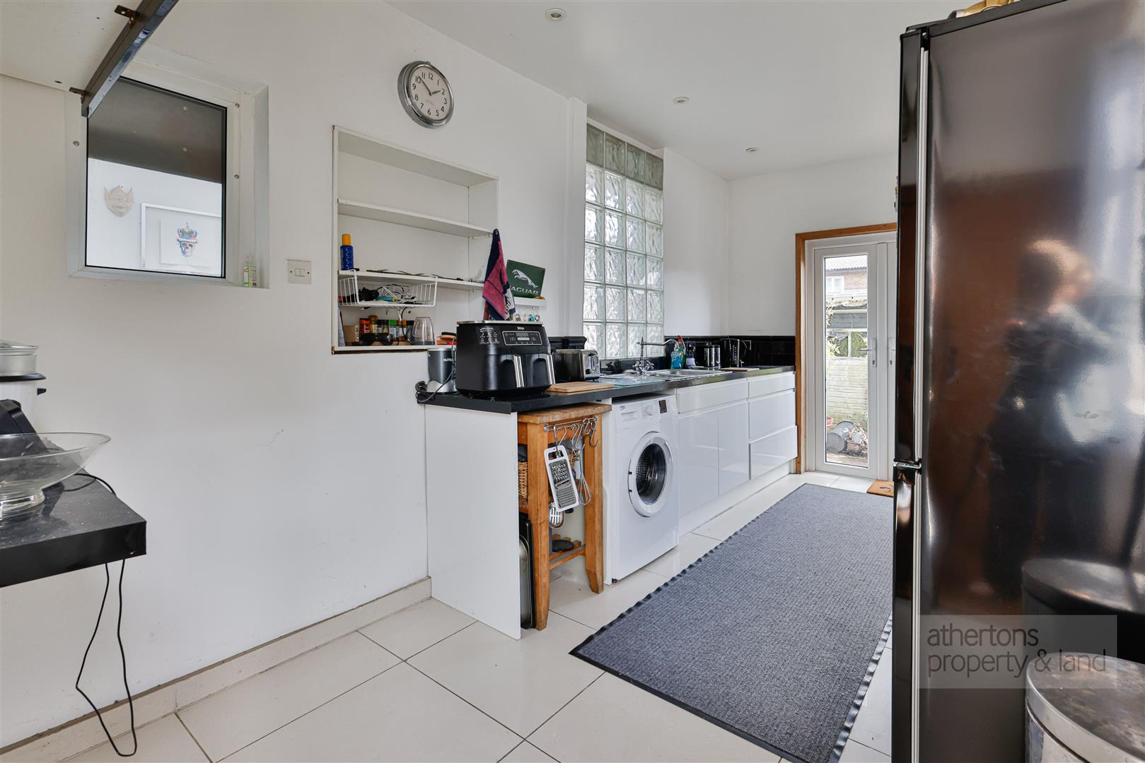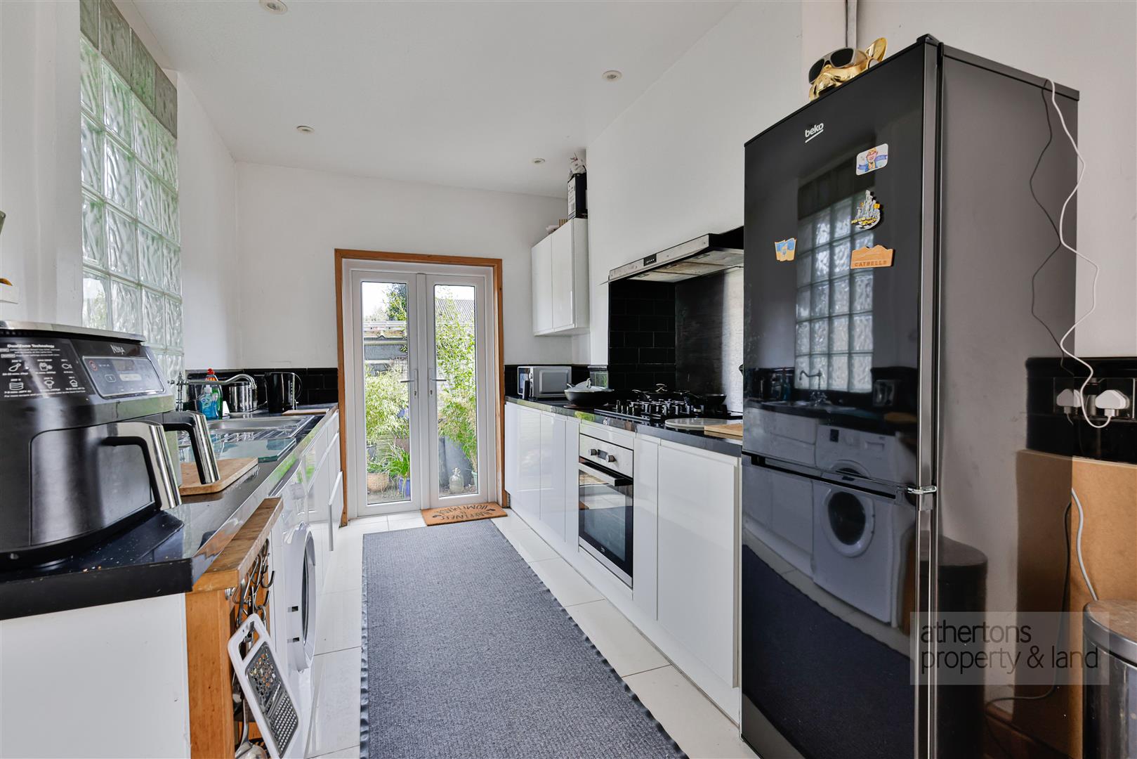 The kitchen is well-appointed with sleek fitted cabinetry and incorporates a four-ring gas hob set within a chimney breast, electric oven and extractor. Additional features include plumbing for appliances, space for a fridge/freezer, a stainless steel dual sink, and a useful under-stairs storage cupboard. French doors provide direct access to the rear, while a feature frosted internal window maintains a connection to the sun room.