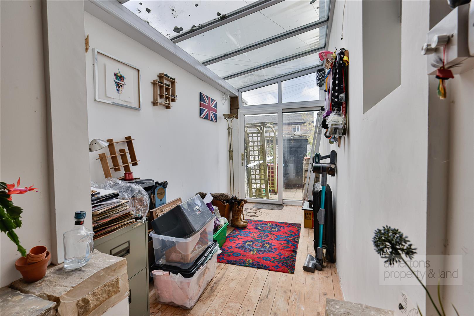To the rear, a second reception room mirrors this character with its own oak flooring and brick fireplace with log burner, creating a cosy yet generous living space. This room flows seamlessly into the recently extended sun room, a superb addition featuring a glass roof and sliding doors opening onto the rear, flooding the space with natural light and creating an ideal everyday living or entertaining area.