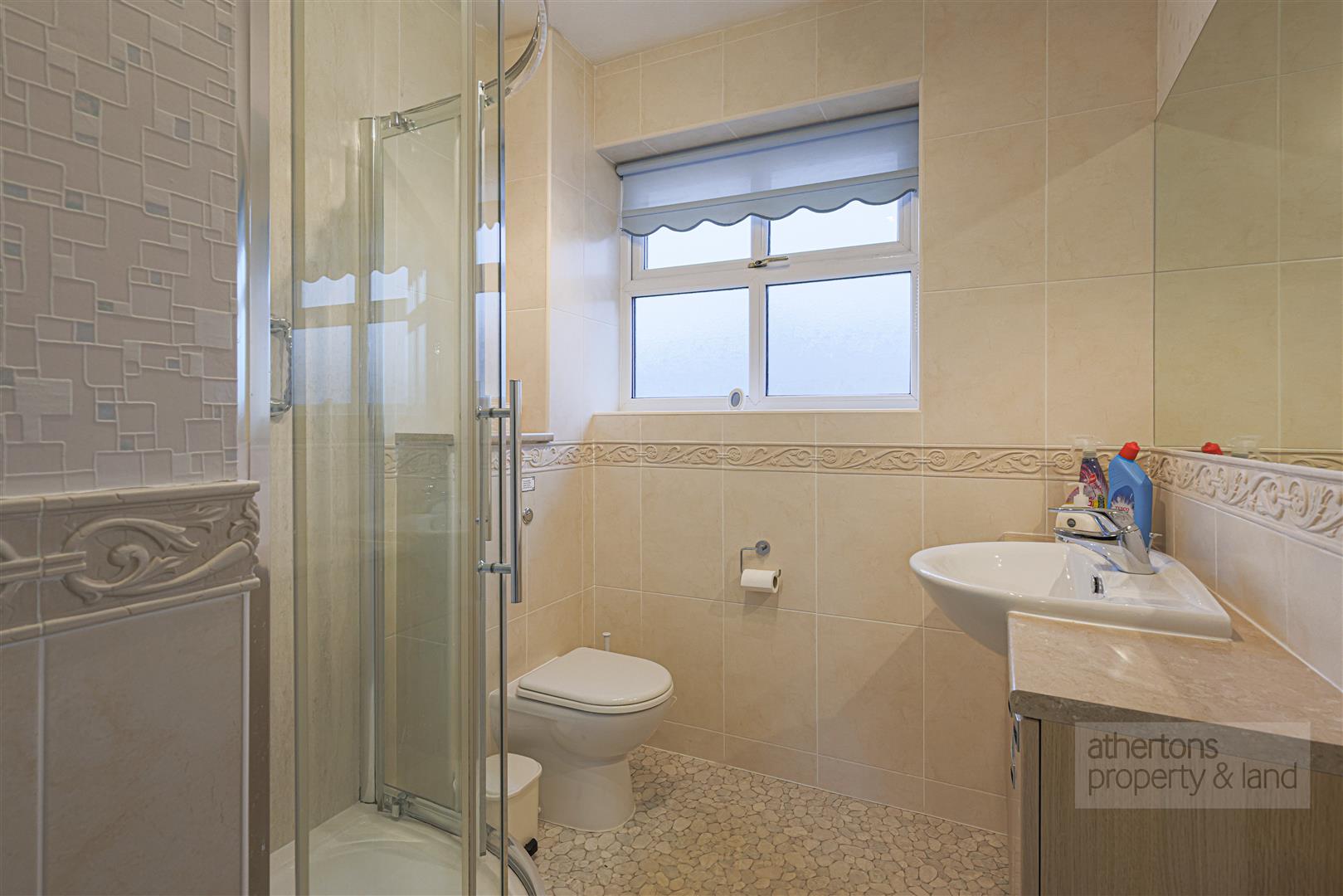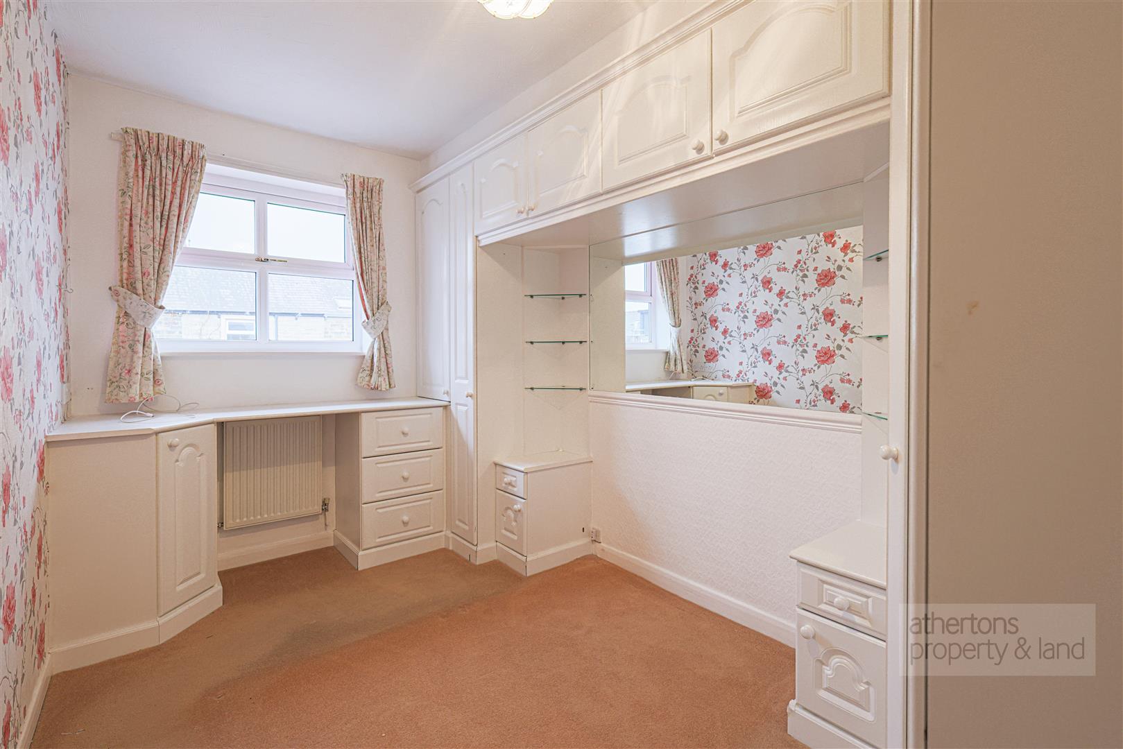 To the first floor, the landing provides access to three bedrooms and a modern shower room. The principal bedroom enjoys a range of built-in wardrobes, storage solutions and a pleasant front aspect. Bedroom two fits a double bed with further fitted wardrobe space, while bedroom three is ideal as a nursery, dressing room or home office. The shower room is fitted with a three-piece suite comprising a large corner mains shower with glazed screen and rainfall head, wall-mounted vanity basin and low-level WC, complemented by practical storage, tiled elevations and cupboard housing the hot water cylinder.