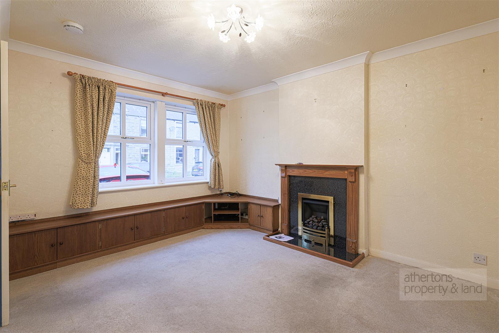 A front entrance door opens into a welcoming hallway with staircase to first floor and door into lounge. The lounge is a cosy and inviting reception room, complete with living flame gas fire set beneath a mantle-piece, under stair storage and bench seating and storage.