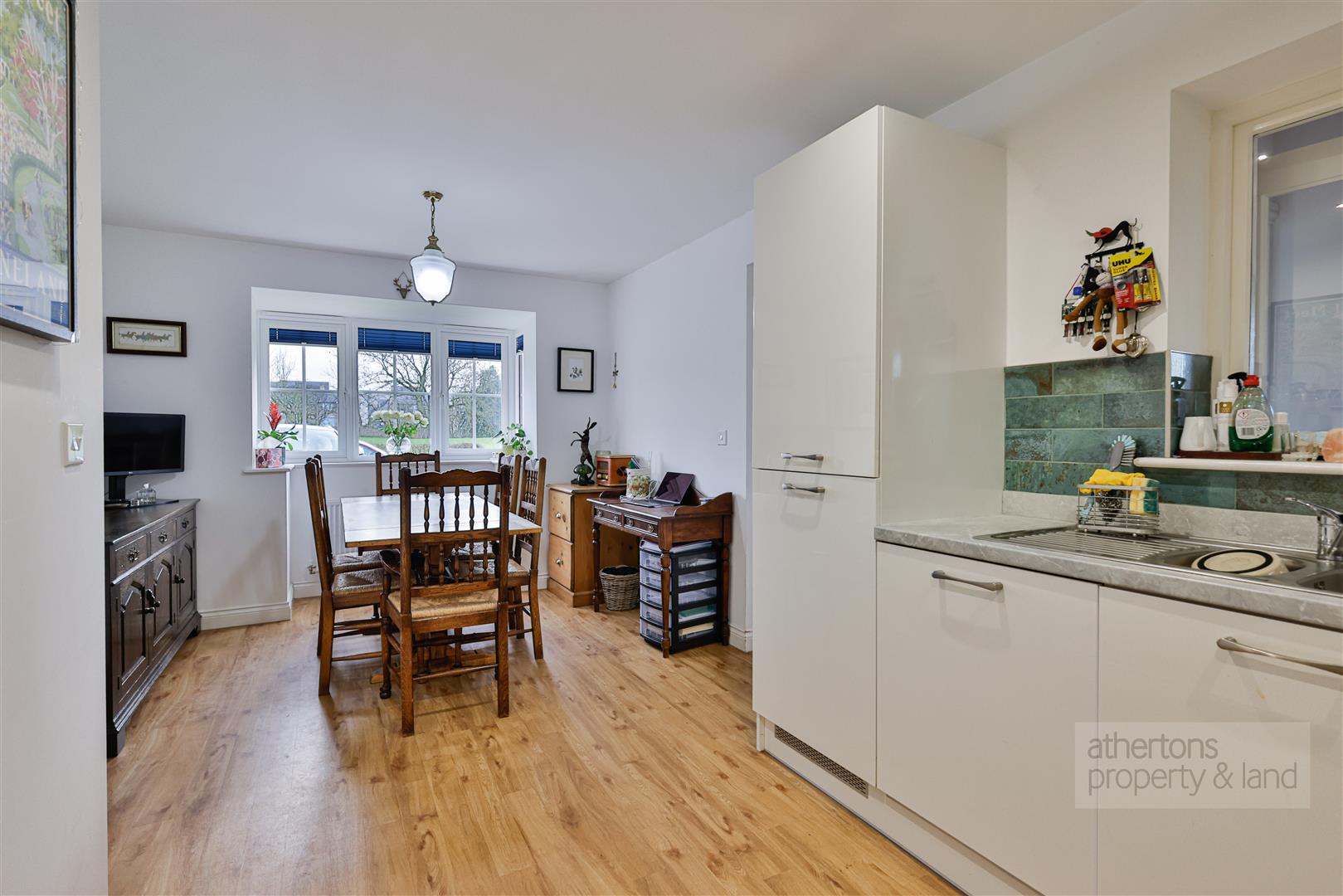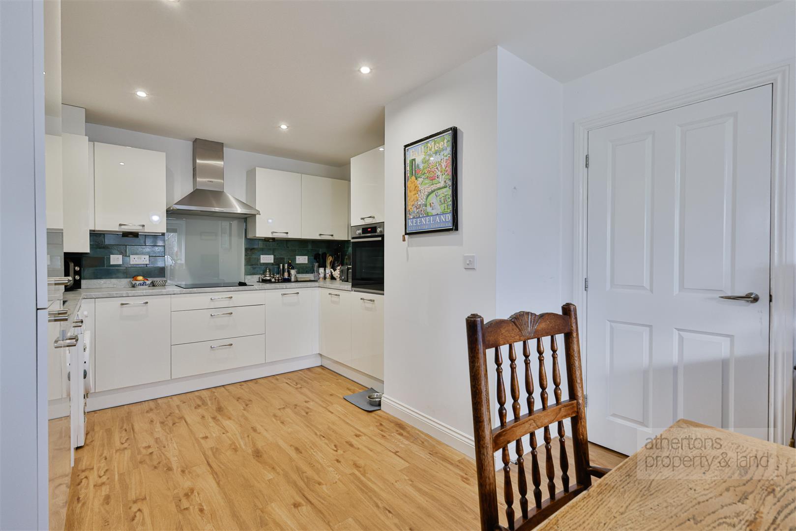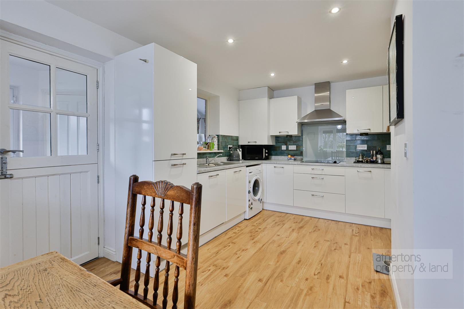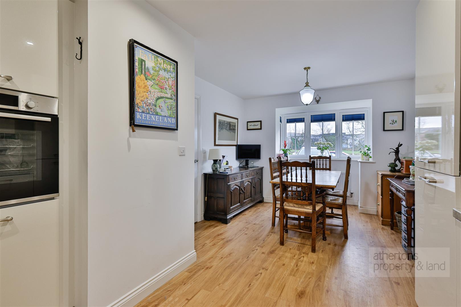Across the hall lies the dining kitchen with a delightful range of contemporary base and eye level units, integrated appliances including Bosch 4 ring electric hob with extractor hood, Bosch electric oven, integrated fridge freezer and dishwasher, composite work tops, laminate wood effect flooring and ample space for dining area.