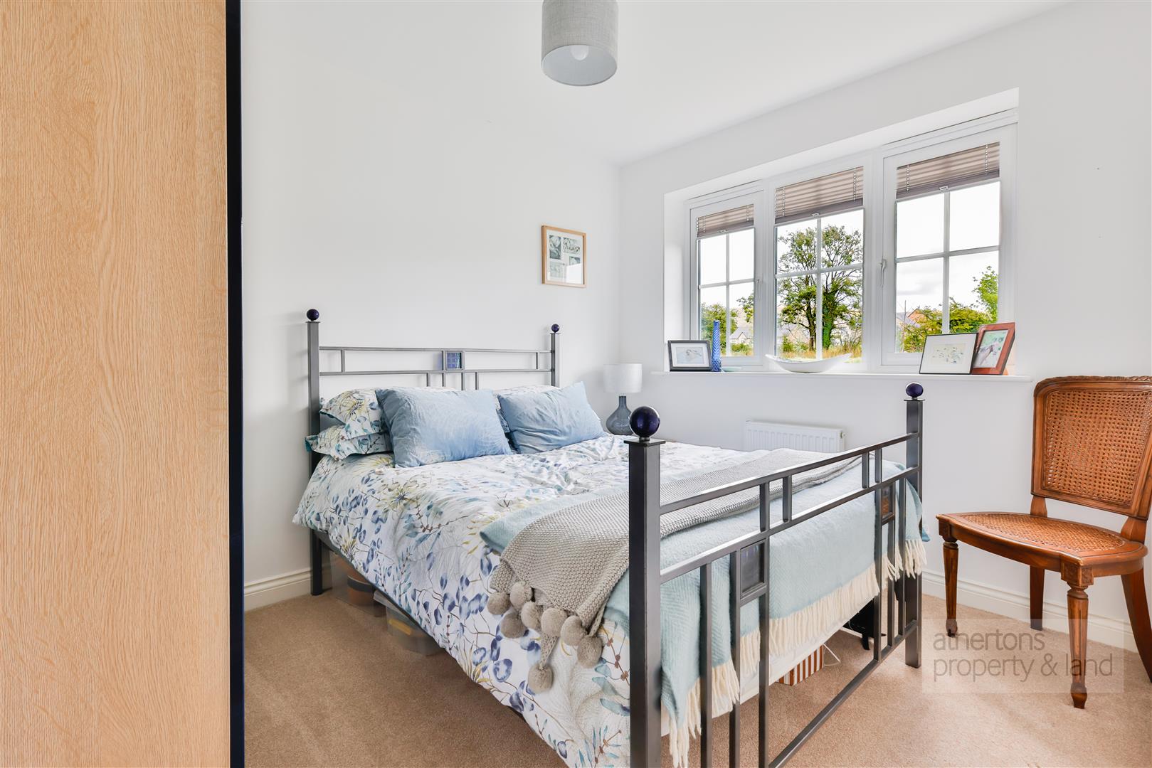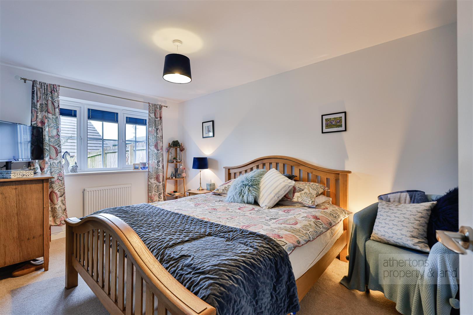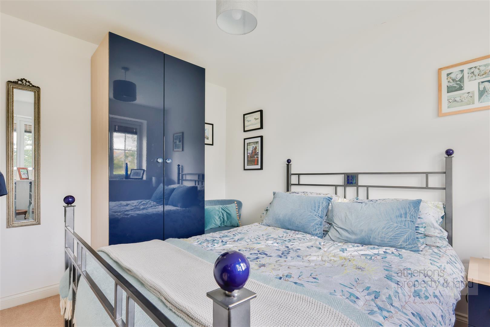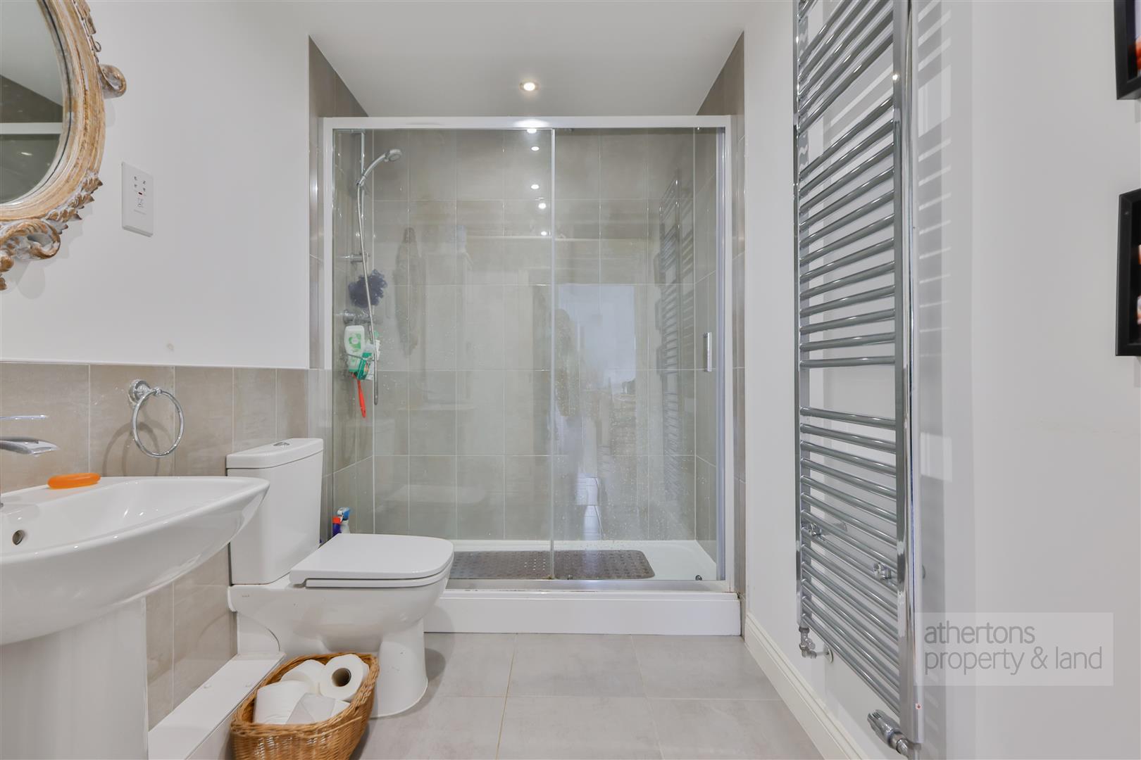 Internally you are greeted by a spacious entrance hallway with part-glazed composite door to the front, access point to roof void, radiator and door into bedroom two. Bedroom two is a good sized double with windows to the front, double panelled radiator and carpeted floor covering. Adjacent to bedroom two is the large family shower room which has been beautifully finished with tiled walls and floors, pedestal wash basin, low-flush WC, large walk in main feed shower with sliding glass shower screen.