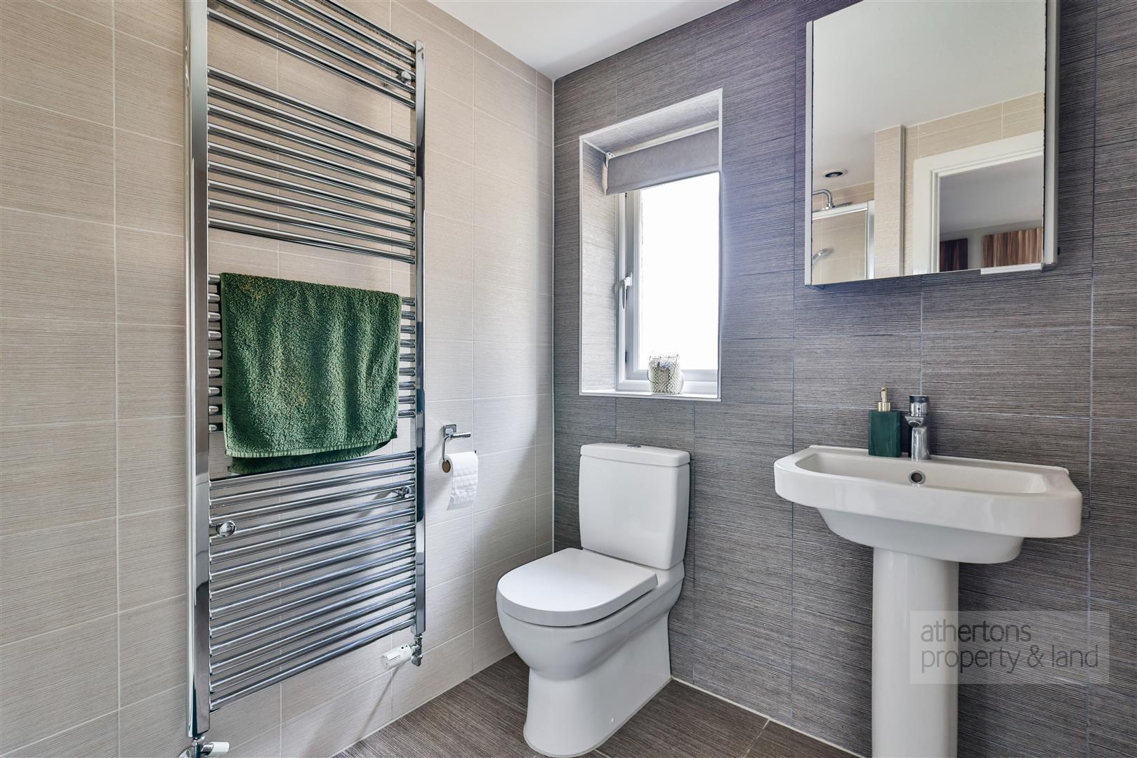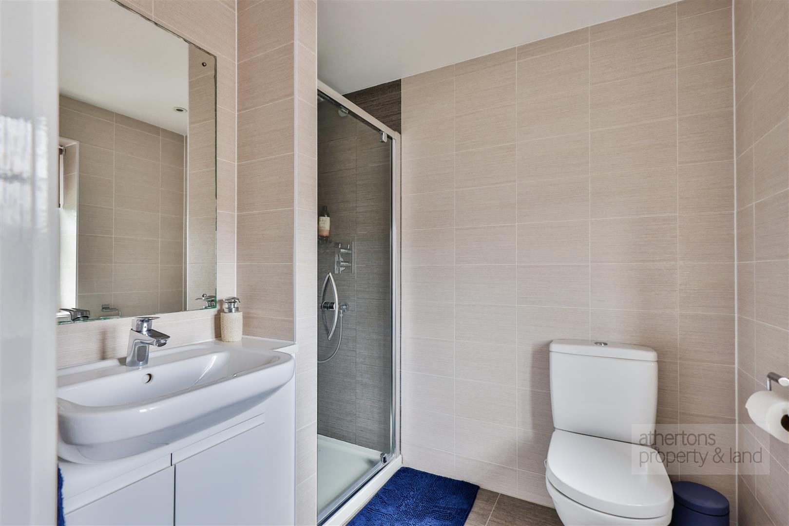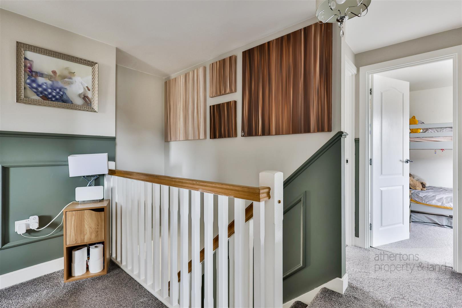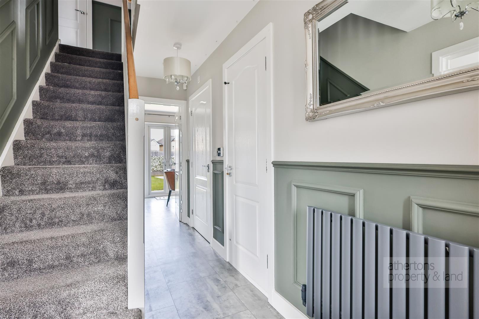 Ascending to the first floor, a stylishly panelled landing leads to four generously sized bedrooms and a family bathroom. The principal suite is beautifully appointed, featuring space for fitted wardrobes and an elegant en-suite shower room, complete with a fully tiled three-piece suite. All the bedrooms are comfortable and spacious doubles with ample space for wardrobe furniture, while the stylish four-piece family bathroom boasts a separate shower cubicle and full tiling for a sleek finish. An airing cupboard housing the Tribune water cylinder completes the upstairs layout.