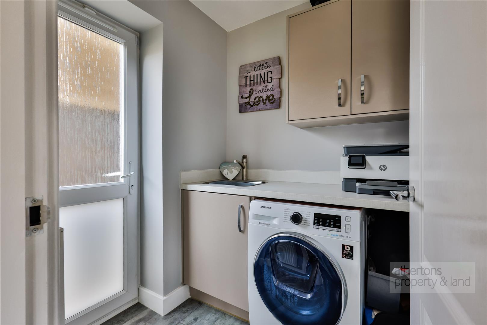 The rear of the property unfolds into a breathtaking open-plan family dining kitchen, upgraded to an exceptional standard. This space has been designed for both style and functionality, featuring an abundance of additional storage, sleek fitted base and eye-level units, and high-spec integrated appliances, including a tall fridge and freezer, Neff double oven, Neff gas hob with extractor, integrated dishwasher and vertical anthracite radiator. There is ample room for a dining table, while French patio doors open directly onto the rear garden, creating a seamless indoor-outdoor flow. An adjoining utility room provides further storage, plumbing for a washing machine, an additional sink, and a side door for easy external access.