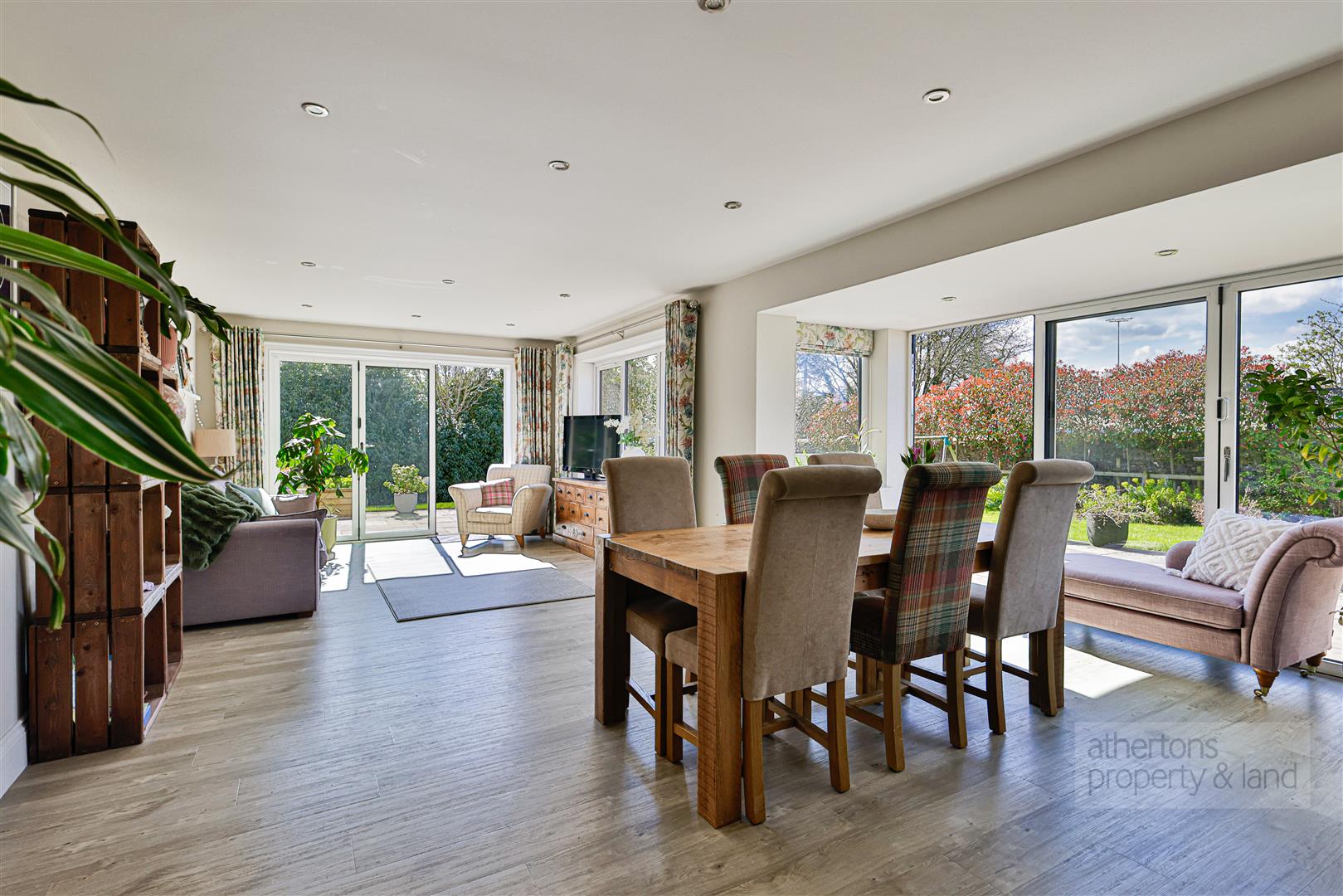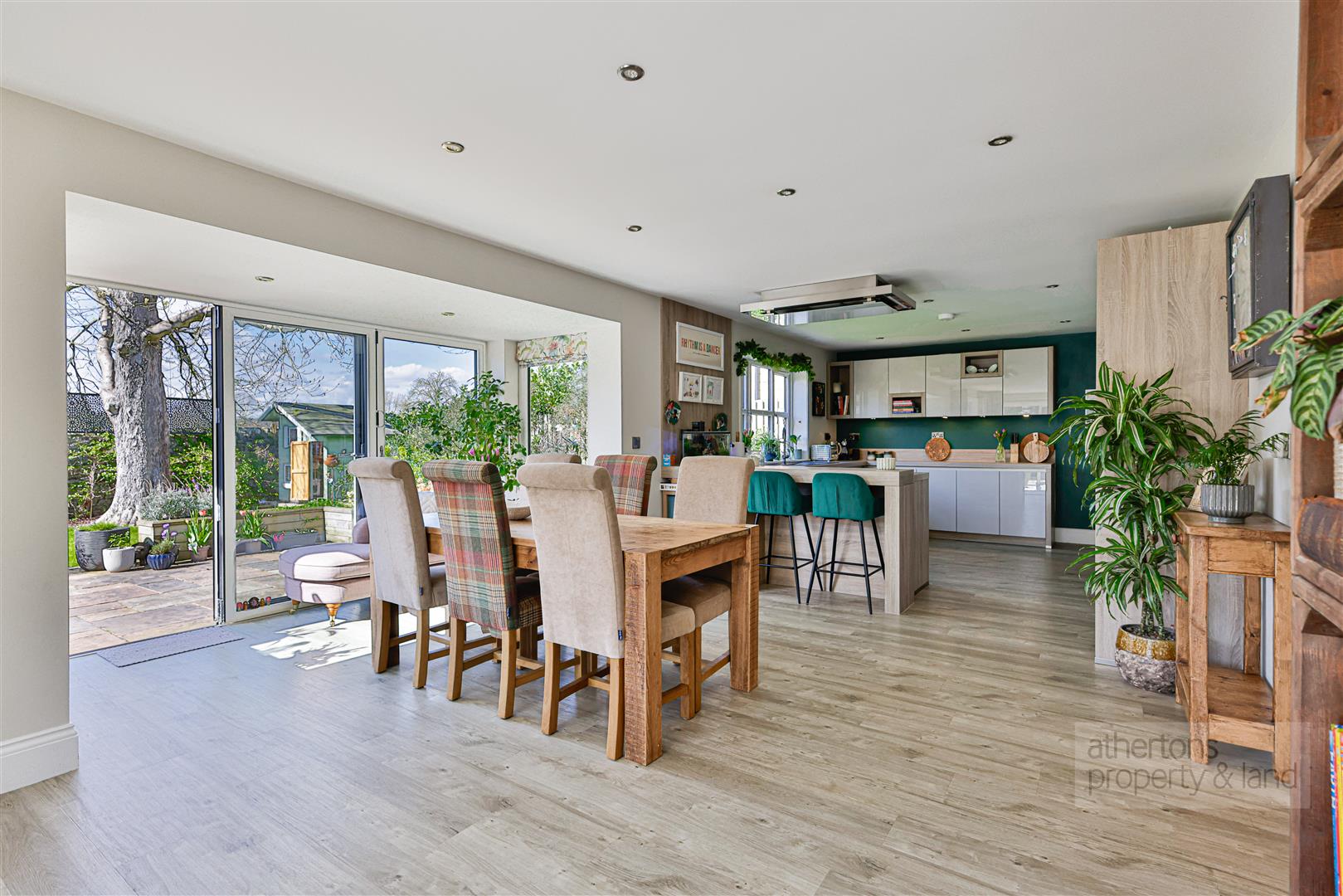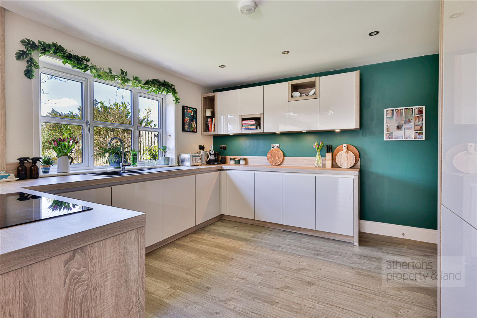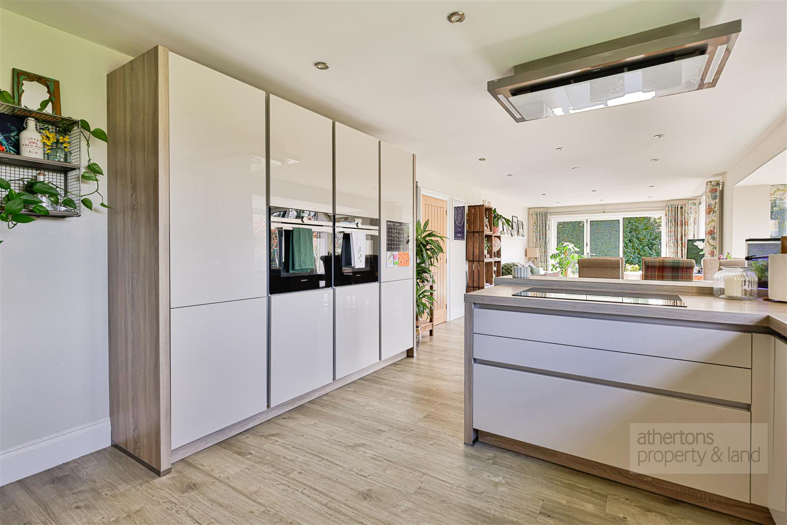 With the protection of a canopied entrance, the front door opens to a wide hall with a half return staircase rising to the first floor. There is a cloaks cupboard and a separate two-piece cloakroom with a wall hung concealed cistern wc and a vanity washbasin. Floor and partial wall tiling with a chromed ladder radiator. The lounge offers a welcome place to relax, light entering through a wide box bay window. The room’s focal point is a media wall with a TV recess and a stylish almost full width electric coal effect log fire with controls to alter the intensity and “crackle” of flames. The piece de resistance to this wonderful home is its amazing kitchen diner/family room with bifold doors on both its south and west facing elevations. Light and airy it certainly is. Offering three distinct living zones; lounge furniture at the southern end, dining in the middle where the protruding bay is and kitchen at the far end. The quality kitchen cabinetry features contemporary handleless doors paired with counters and upstands in a light oak effect laminate. A Blanco composite sink with a swan neck mixer tap. The built-in Siemens cooking appliances consist of a fan assisted electric oven and a combination microwave oven. On either side of them, a full height freezer and a full height larder fridge. Integrated dishwasher and a five-ring induction hob beneath a ceiling mounted Faber extractor. There are pan and utensil drawers, twin carousels and display/book shelving too. The flooring is LVT which continues into the hall and utility room which has matching cabinetry with space for washing machine and dryer, with a Blanco sink and swan neck mixer tap.